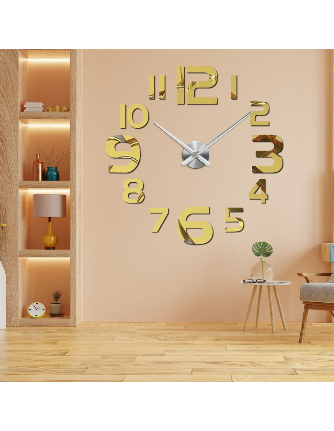 Az elegáns fekete számlap merész számokkal, minimalista stílusban, stílusos és letisztult megjelenést kölcsönöz a helyiségnek.