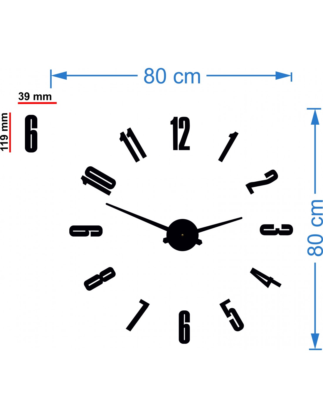 Matrica méretei: 800 x 800 mm, 1300 x 1300 mm-ig nagyítható. Óraszerkezet méretei: 100 x 100 mm. Mutató hossza: 30 - 40 cm.