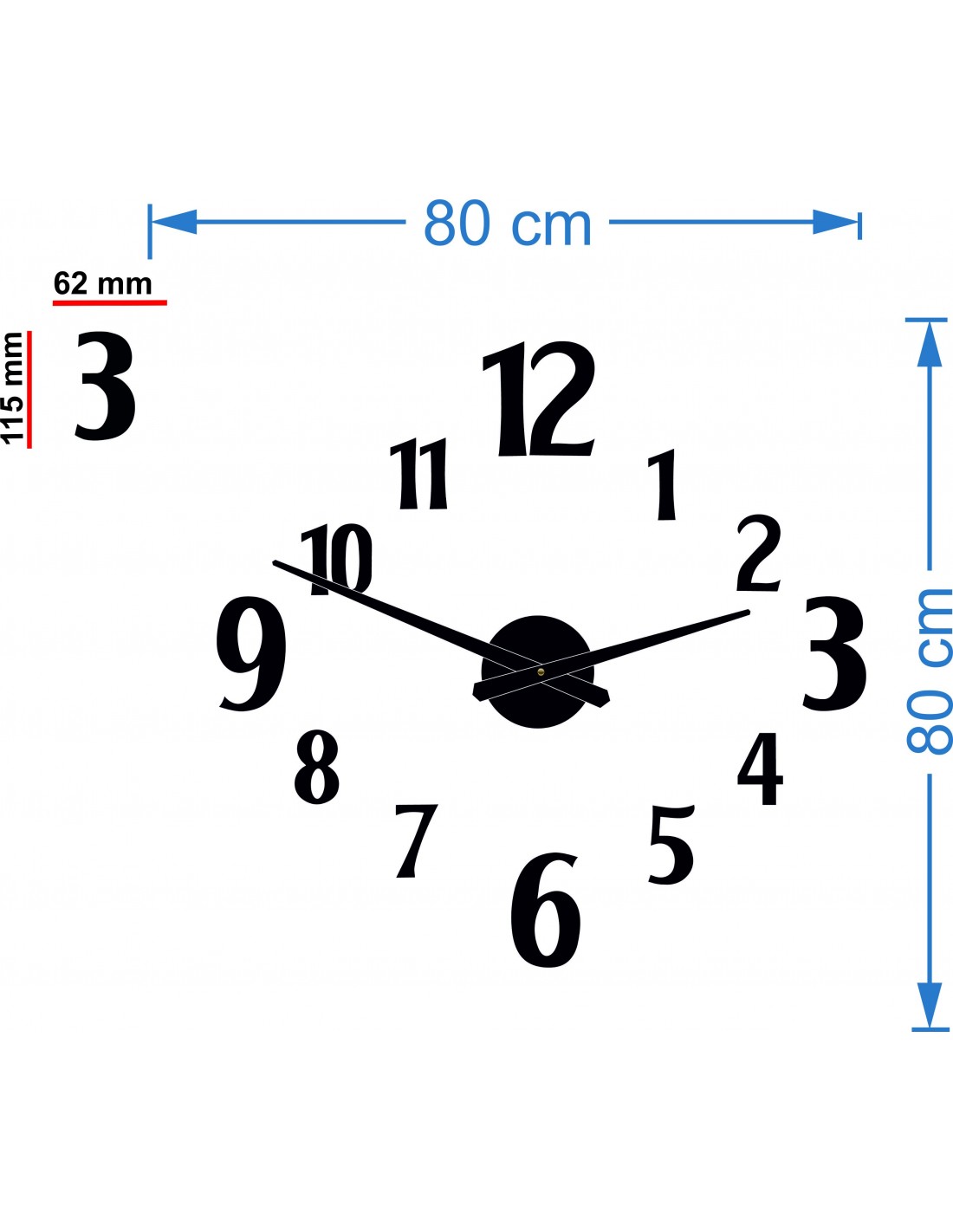 Az óraszerkezet méretei: 100 x 100 mm. A mutatók hossza: 30 - 40 cm.