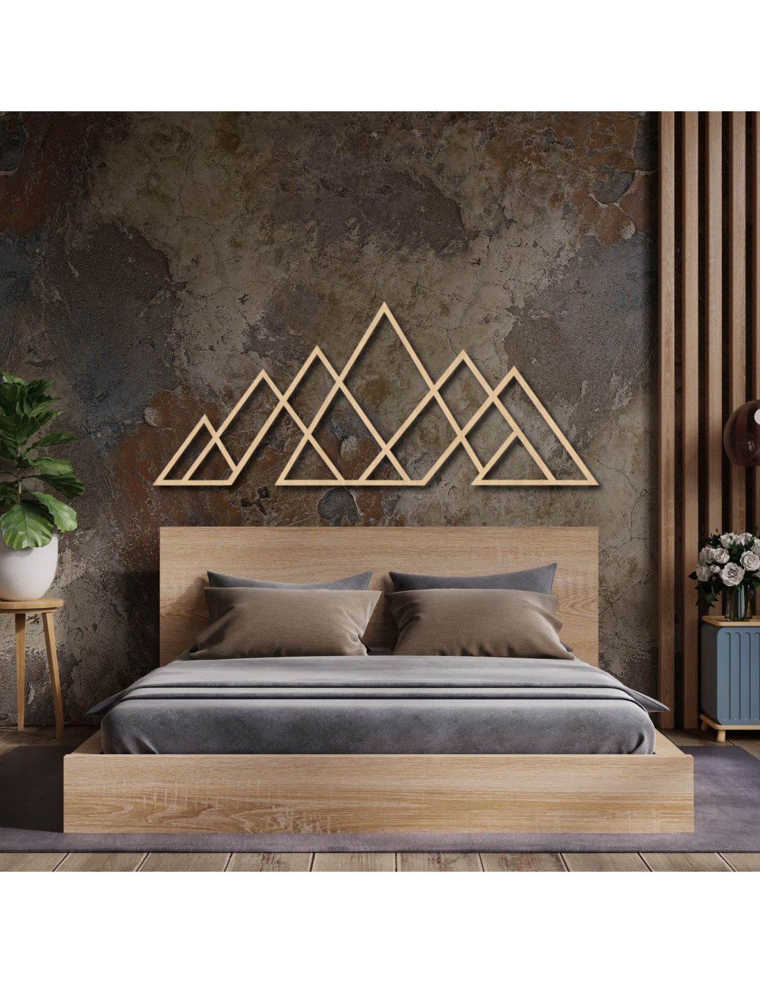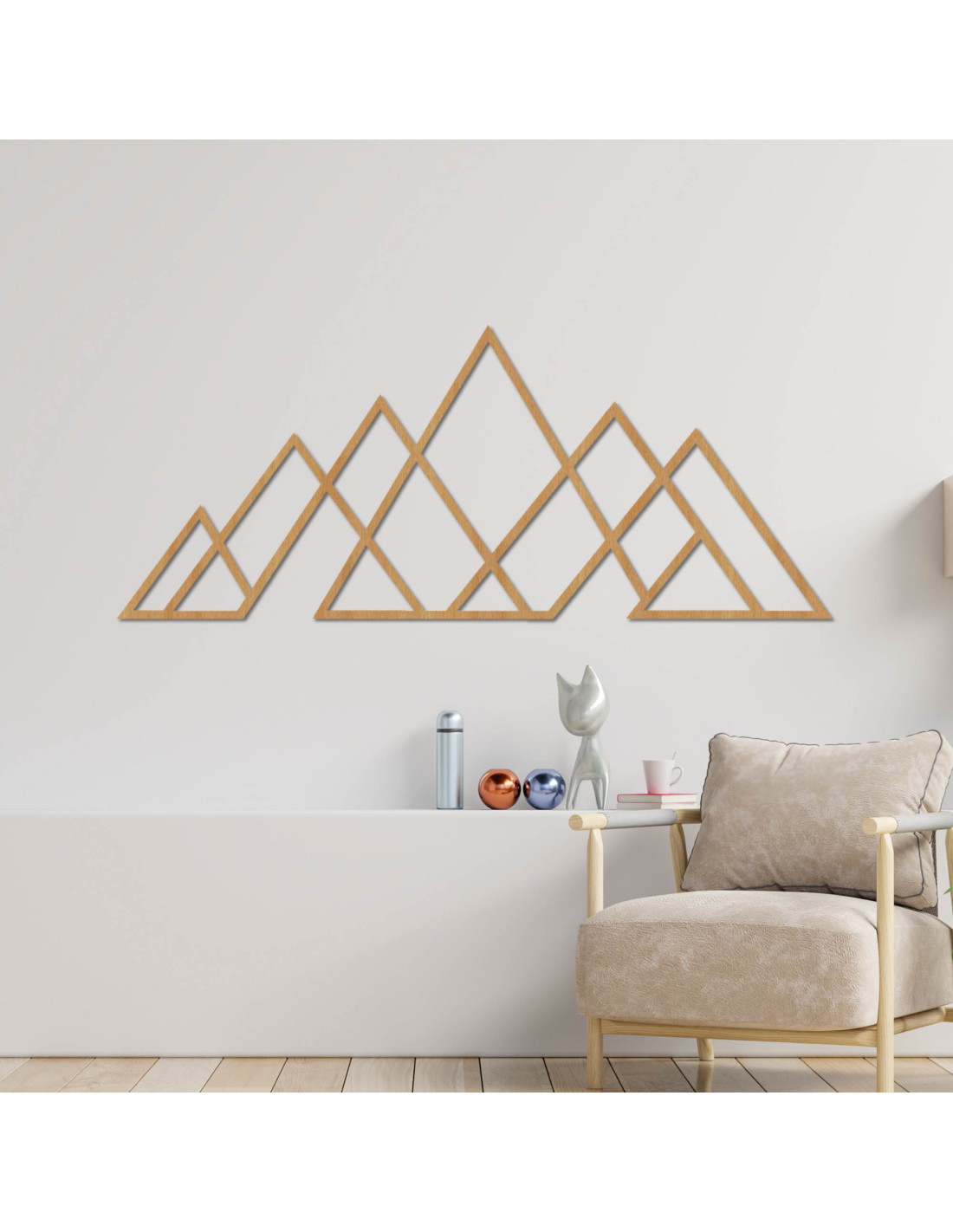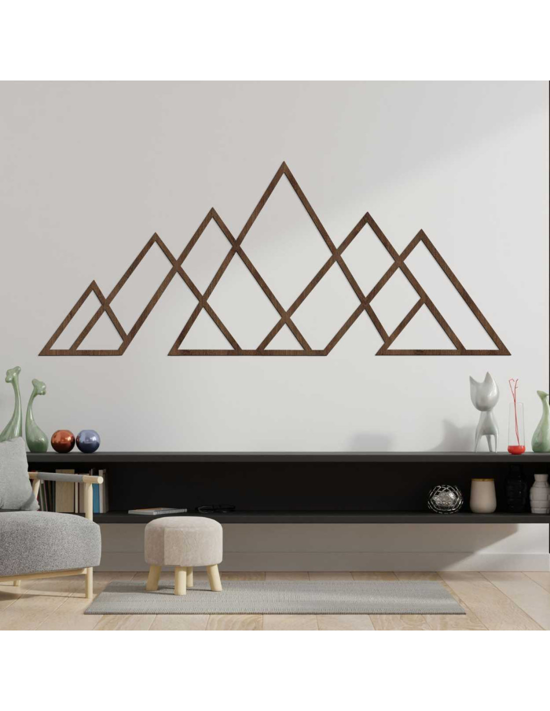 A háromszögek letisztult vonalai harmonikus hegyi panorámát hoznak létre, a hangsúlyt az egyszerűségre helyezve.