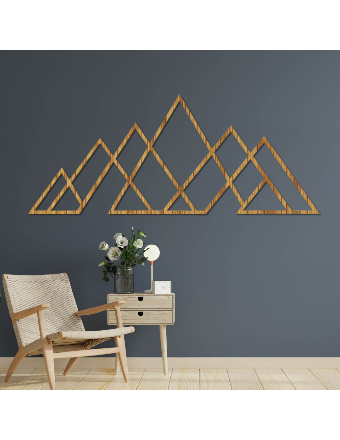 A háromszögek letisztult vonalai harmonikus hegyi panorámát hoznak létre, a hangsúlyt az egyszerűségre helyezve.