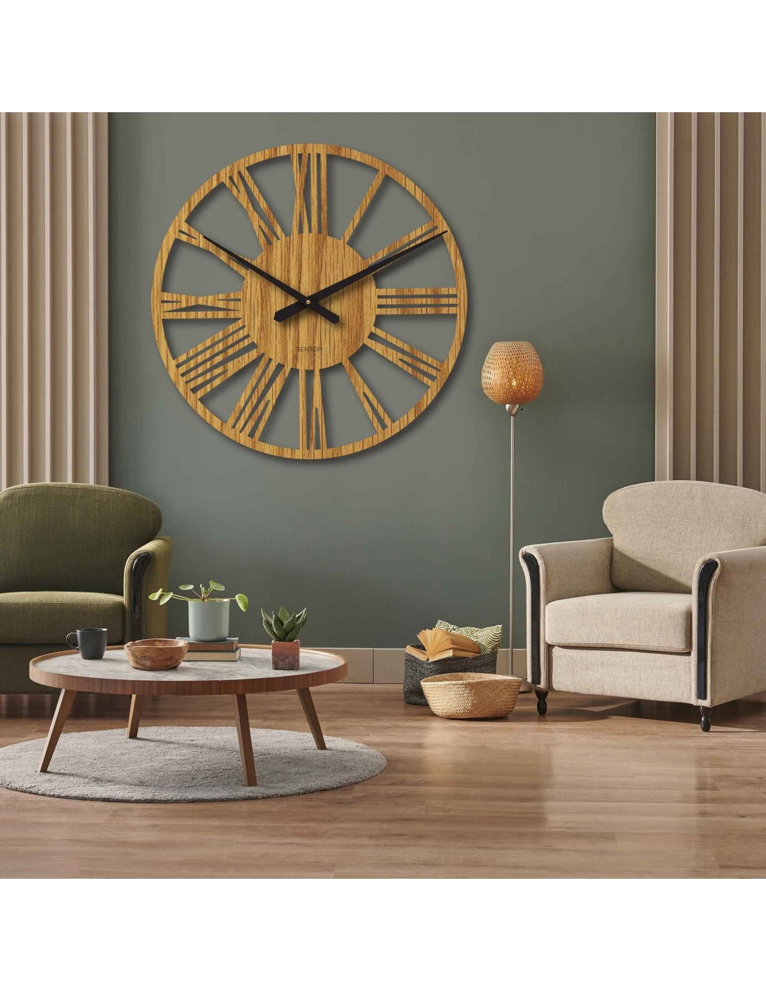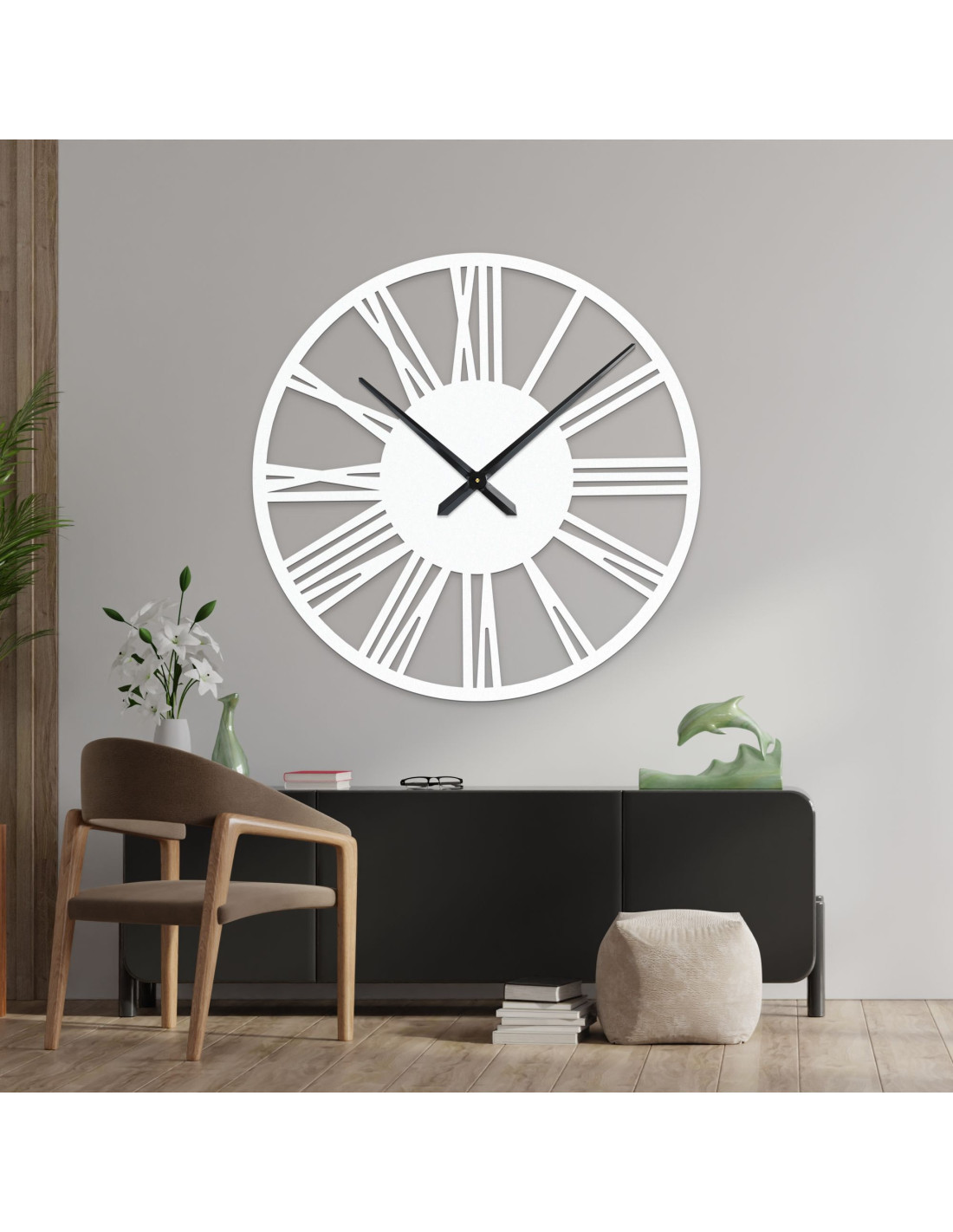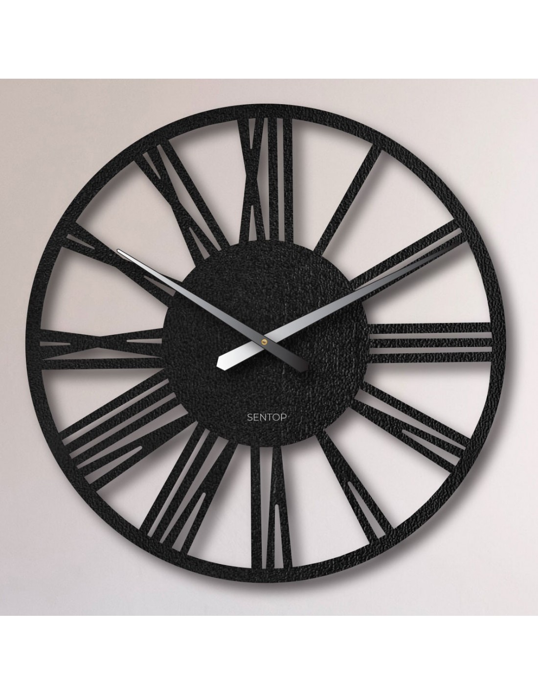 SentopNagyméretű, HDF lapból készült római falióra - egy stílusos kiegészítő, amely első látásra magára vonzza a tekintetet. Dobja fel otthonát ezzel az elegáns, 80 cm átmérőjű, minimalista és modern stílusban tervezett órával. Finoman texturált felületük és jellegzetes mutatóik kiváló leolvashatóságot garantálnak még nagyobb távolságból is, és kifinomult hangulatot kölcsönöznek a térnek.