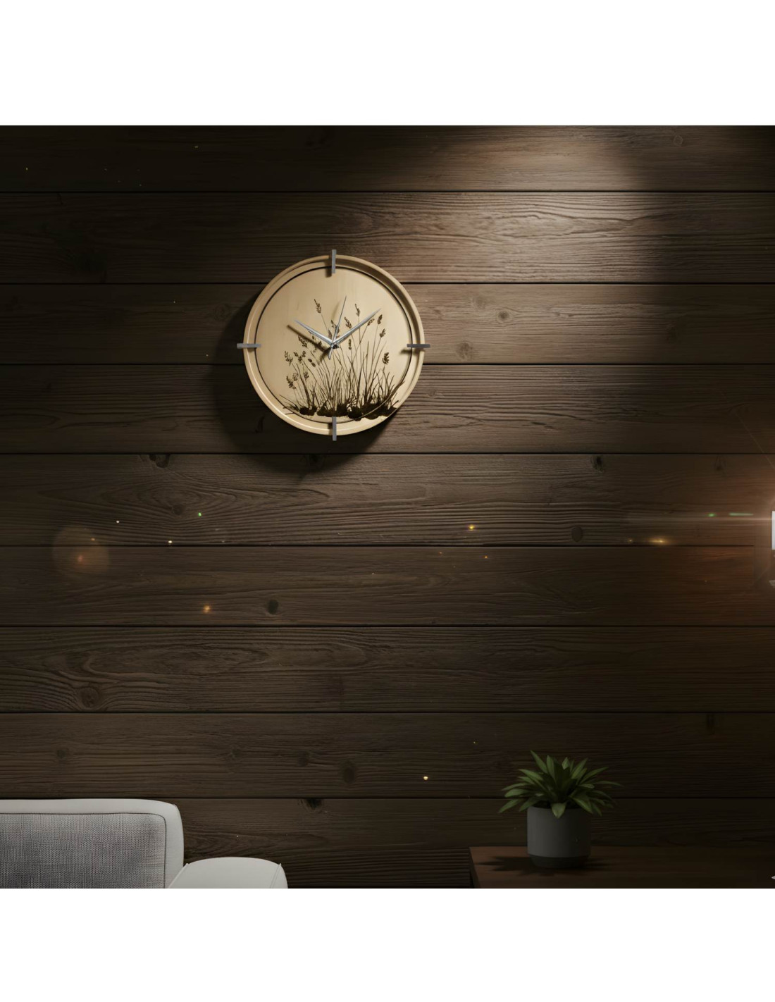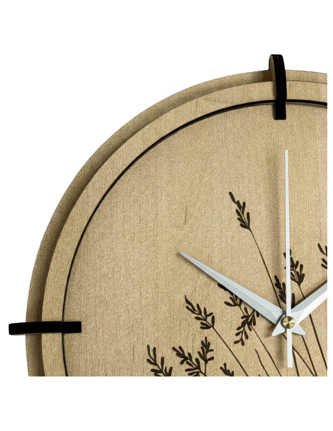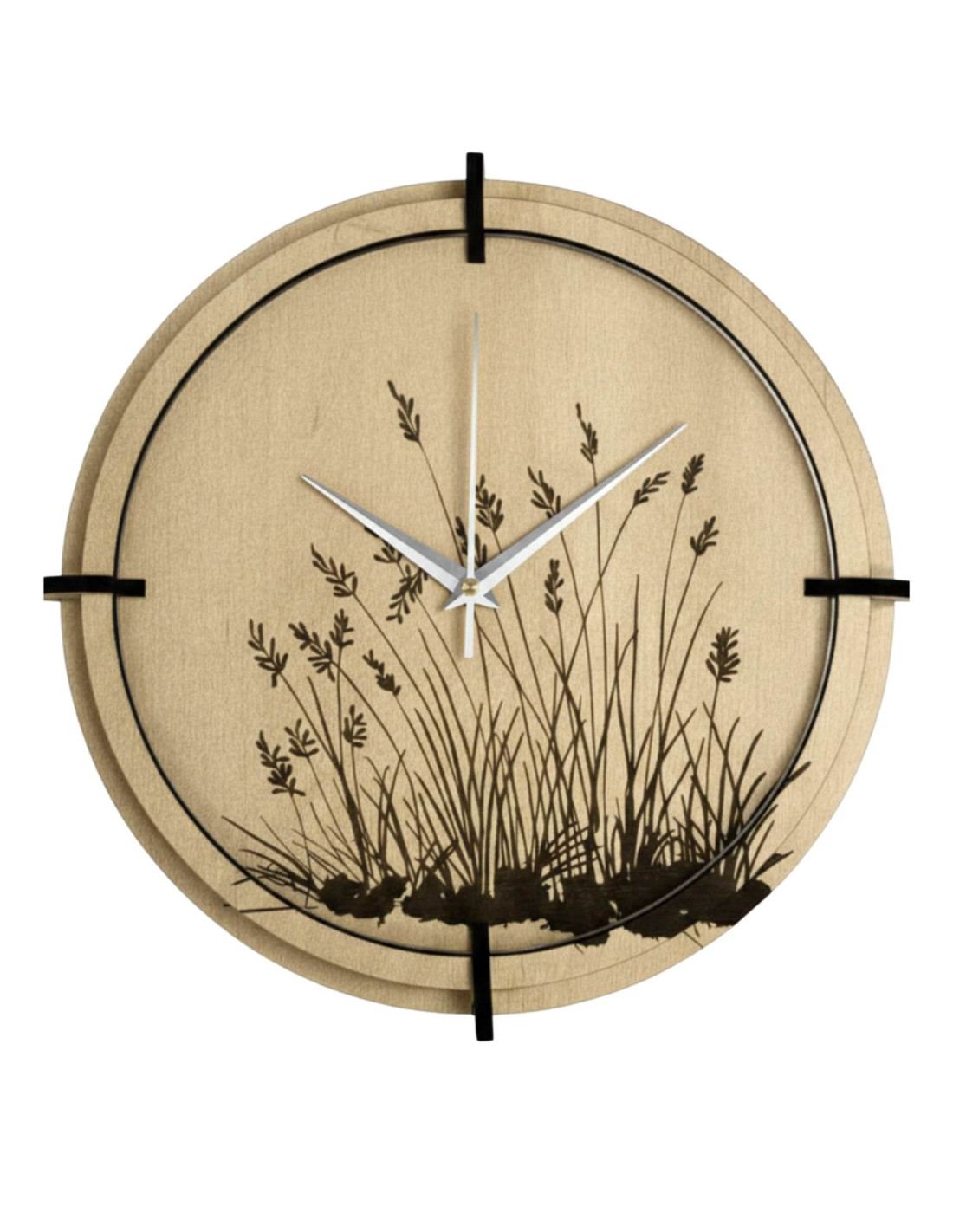 A modern, juhar mintás, fából készült falióra gravírozott réti perje motívummal természetes eleganciát és könnyedséget visz a belső térbe.