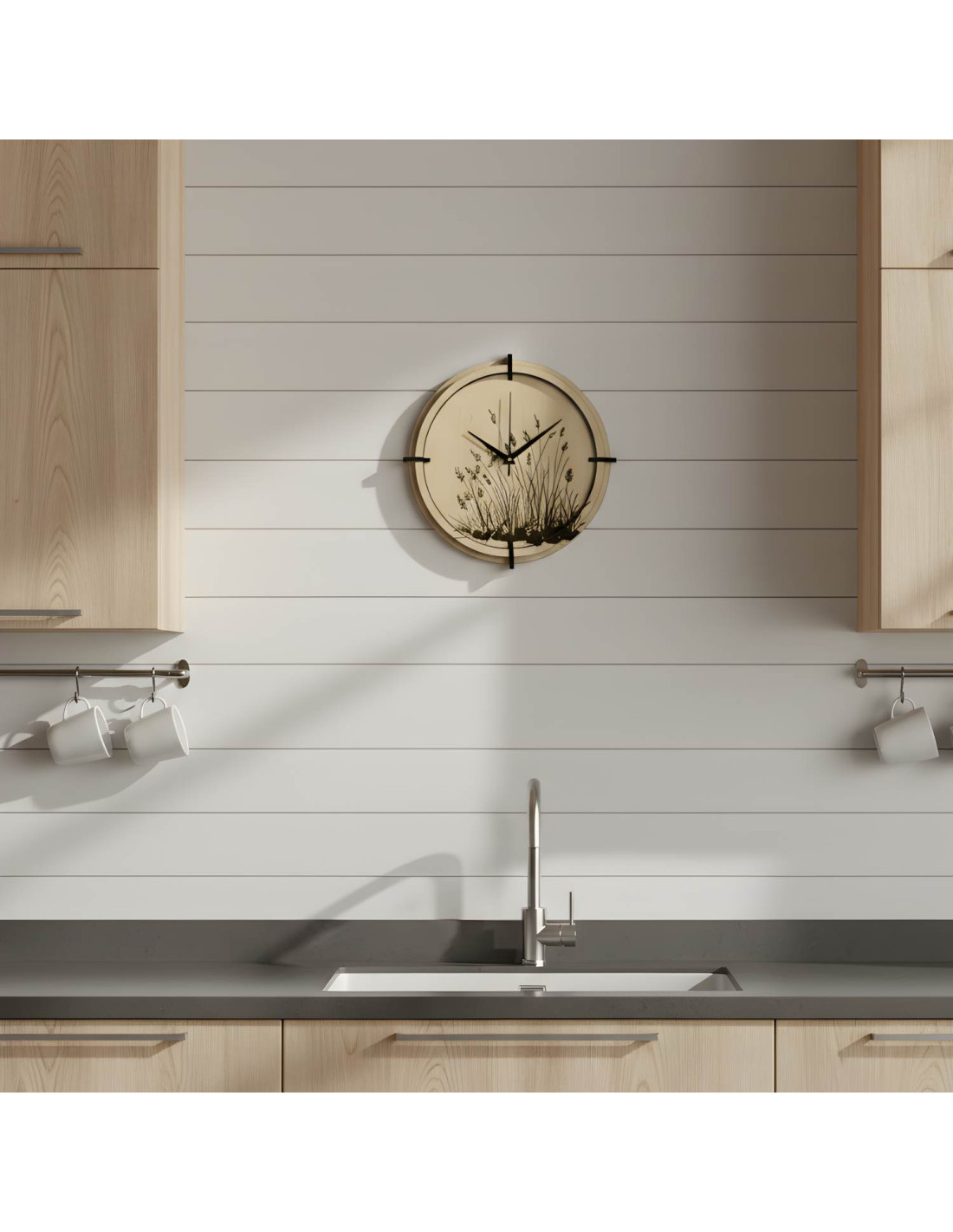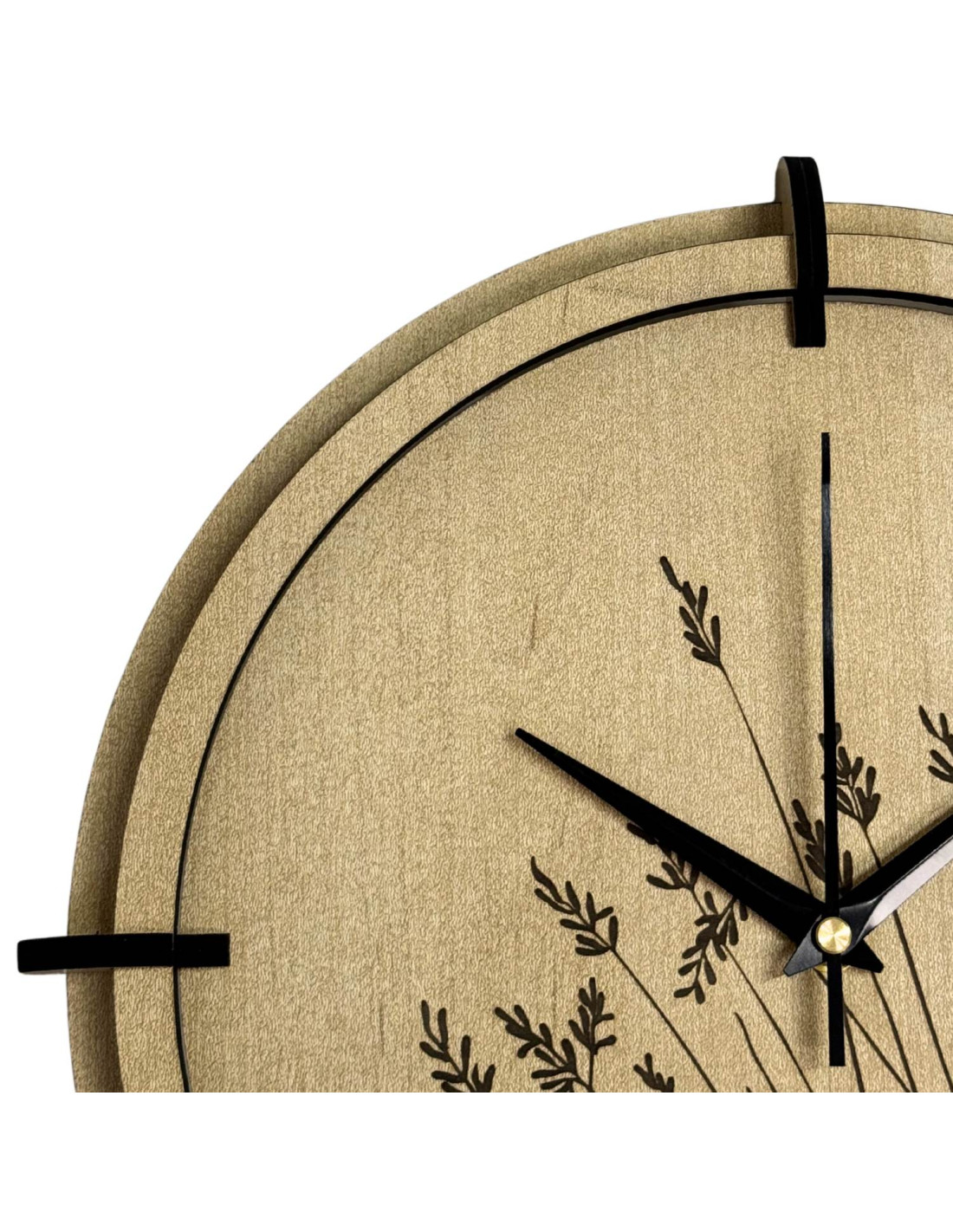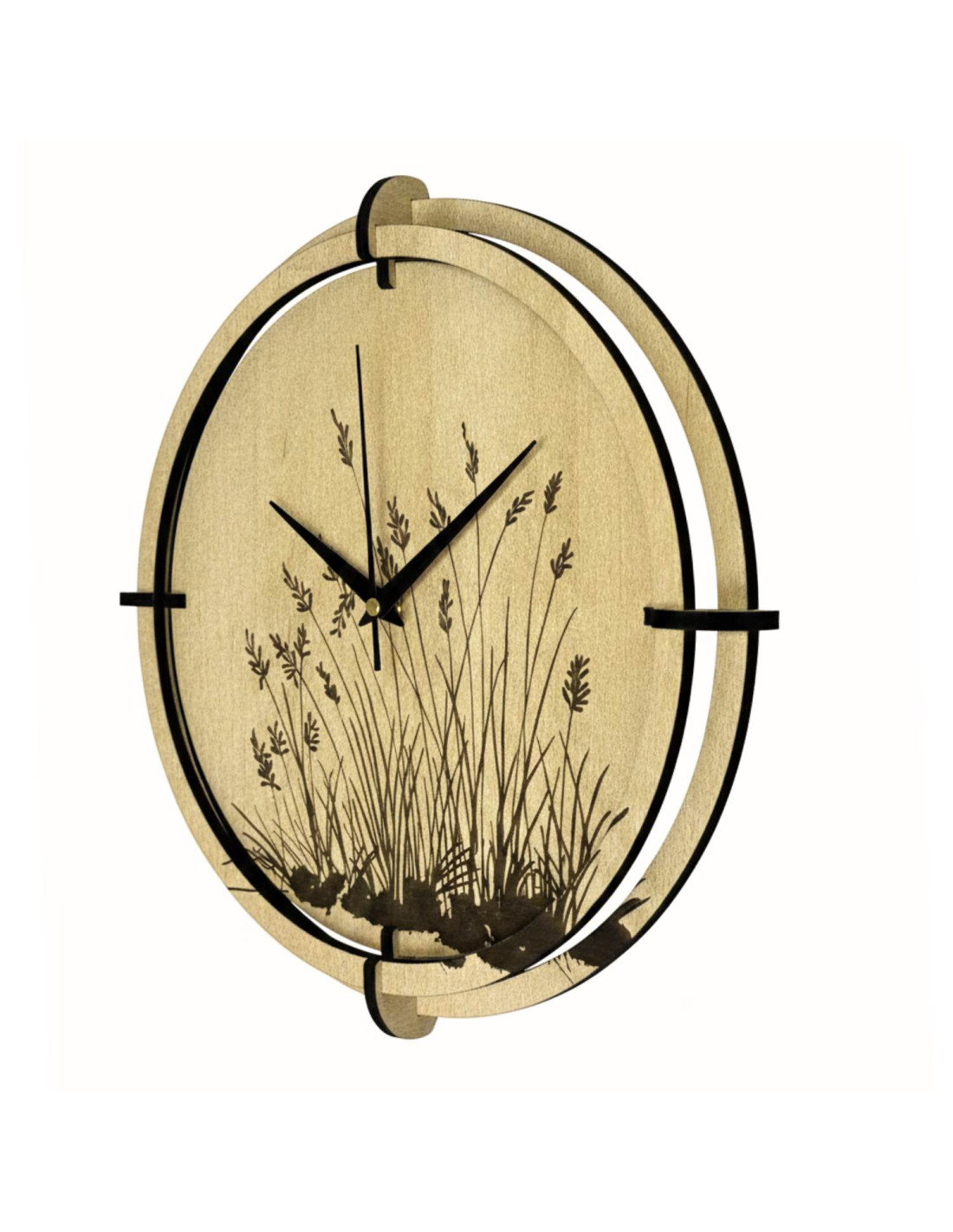 A modern, juhar mintás, fából készült falióra gravírozott réti perje motívummal természetes eleganciát és könnyedséget visz a belső térbe.