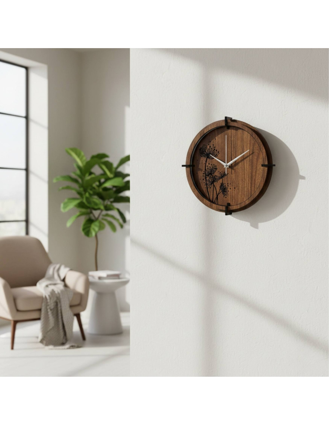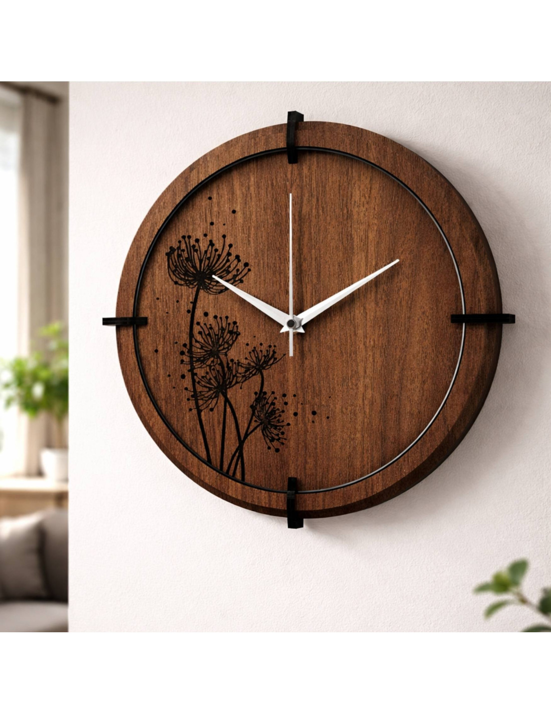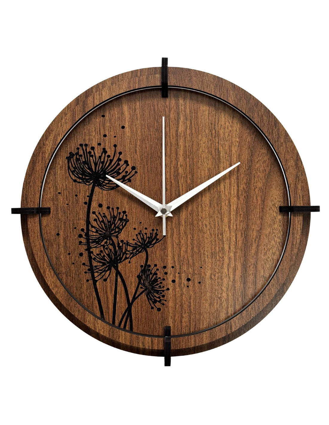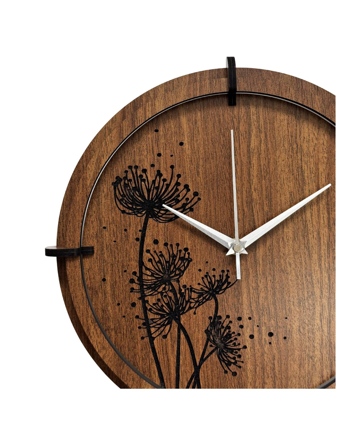 A finom részletekkel díszített gravírozott virágmotívum modern és harmonikus hatást kelt, míg a fekete, ezüstszínű mutatók és a fa kör kiemelik a dizájneri megjelenést.