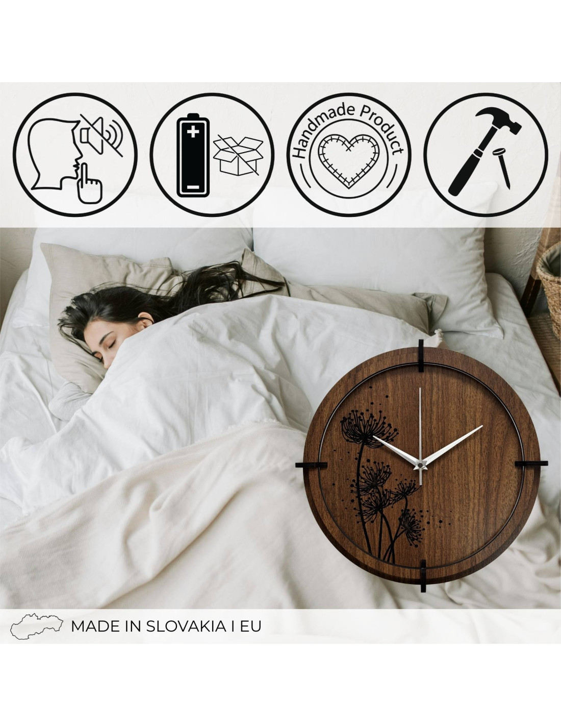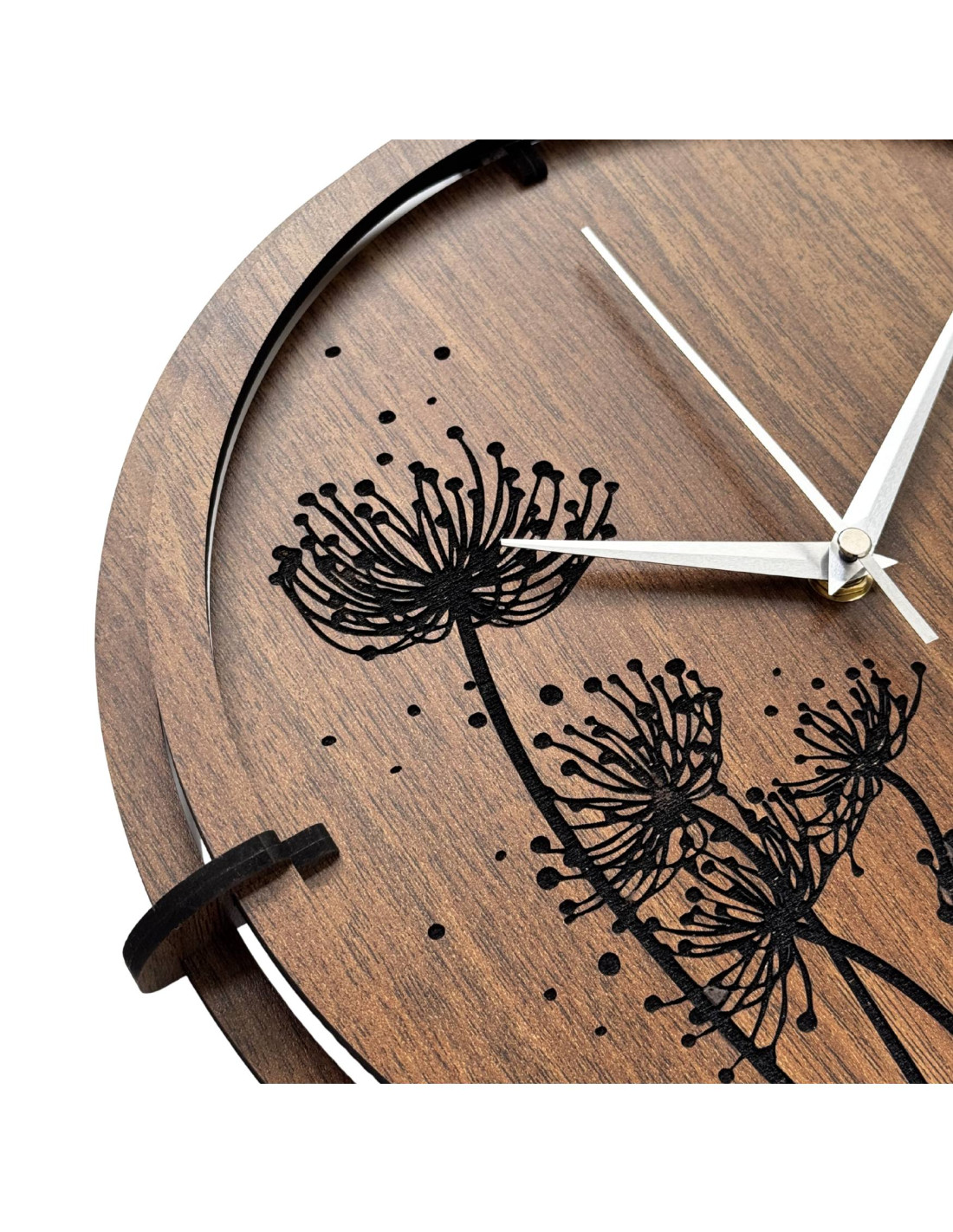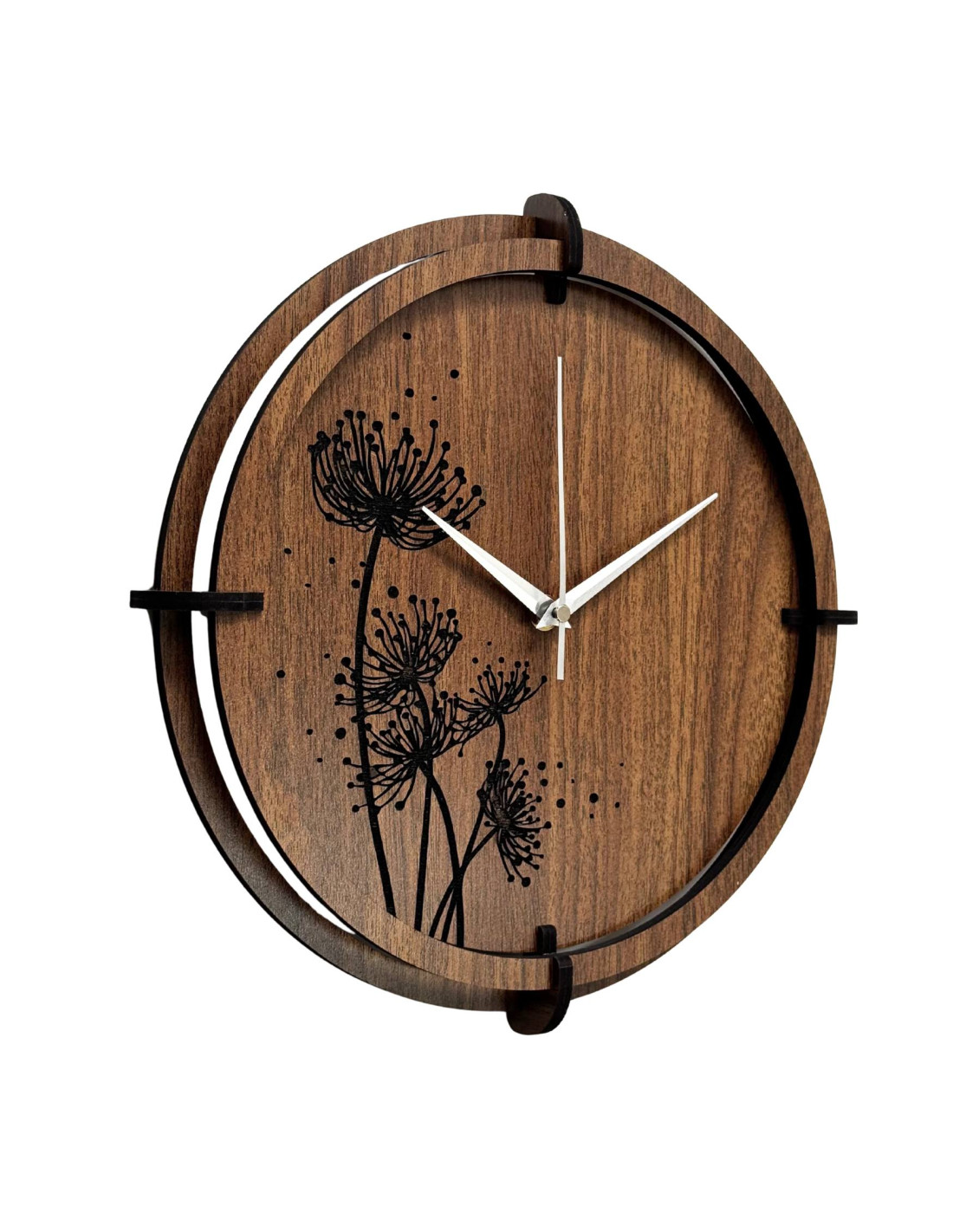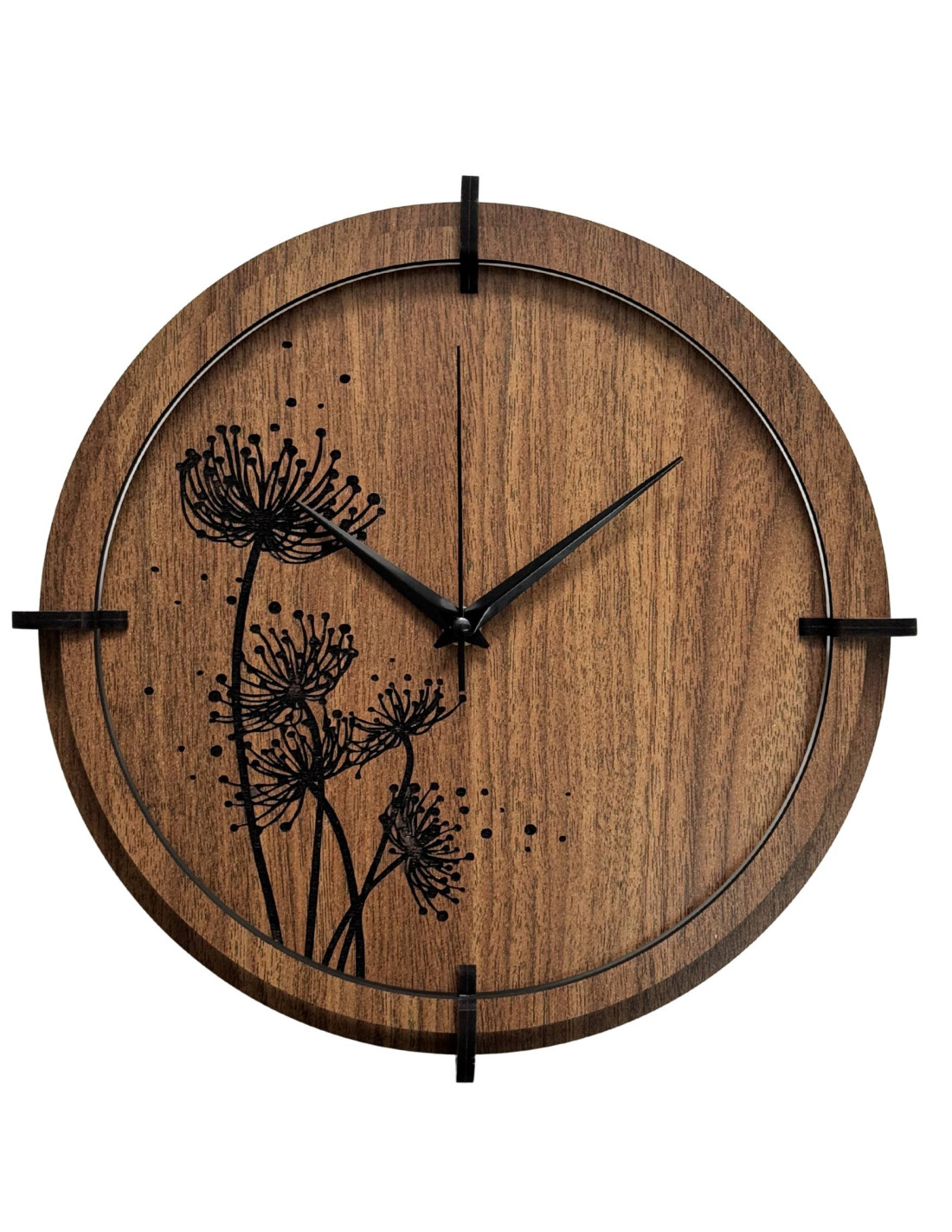 A finom részletekkel díszített gravírozott virágmotívum modern és harmonikus hatást kelt, míg a fekete, ezüstszínű mutatók és a fa kör kiemelik a dizájneri megjelenést.