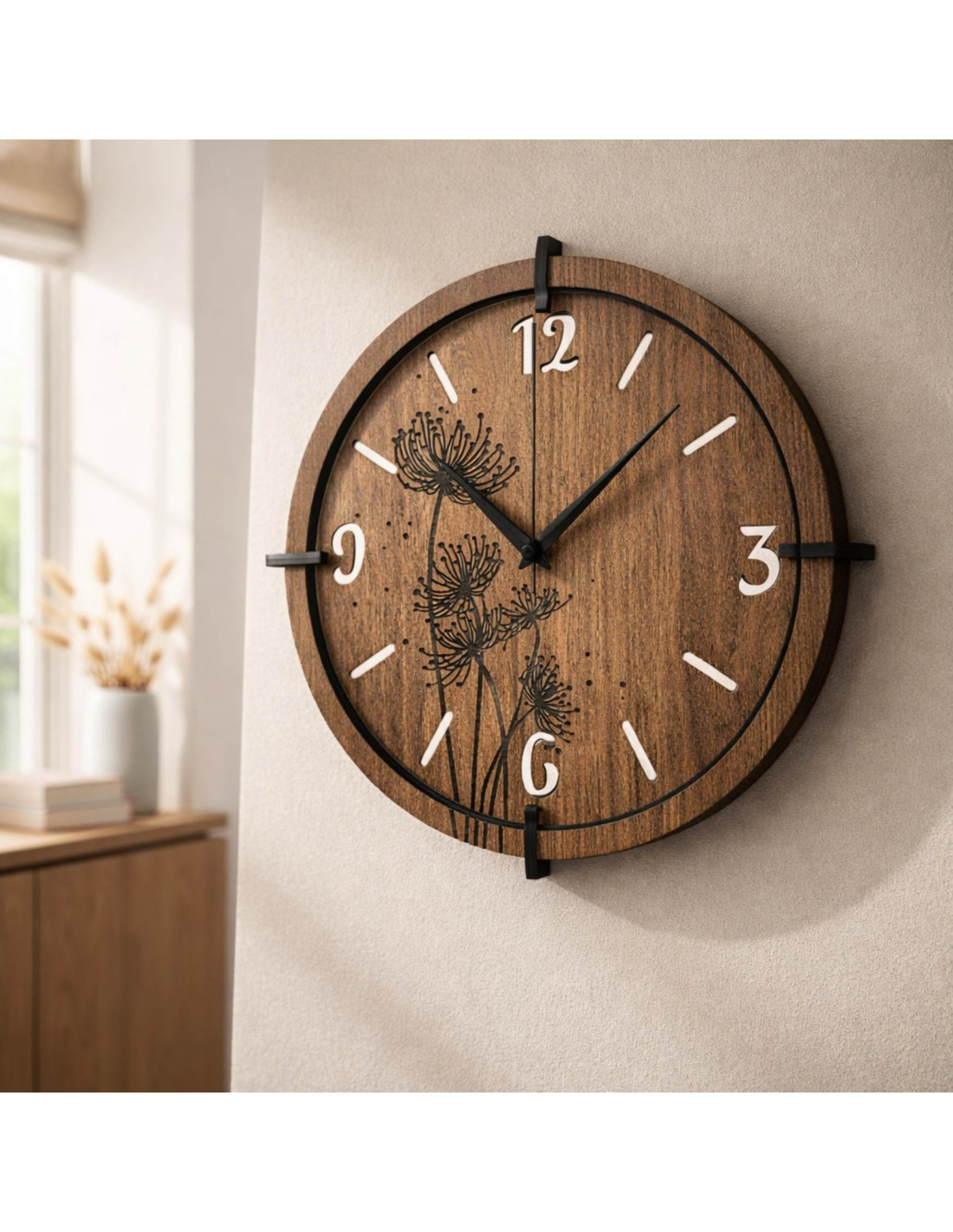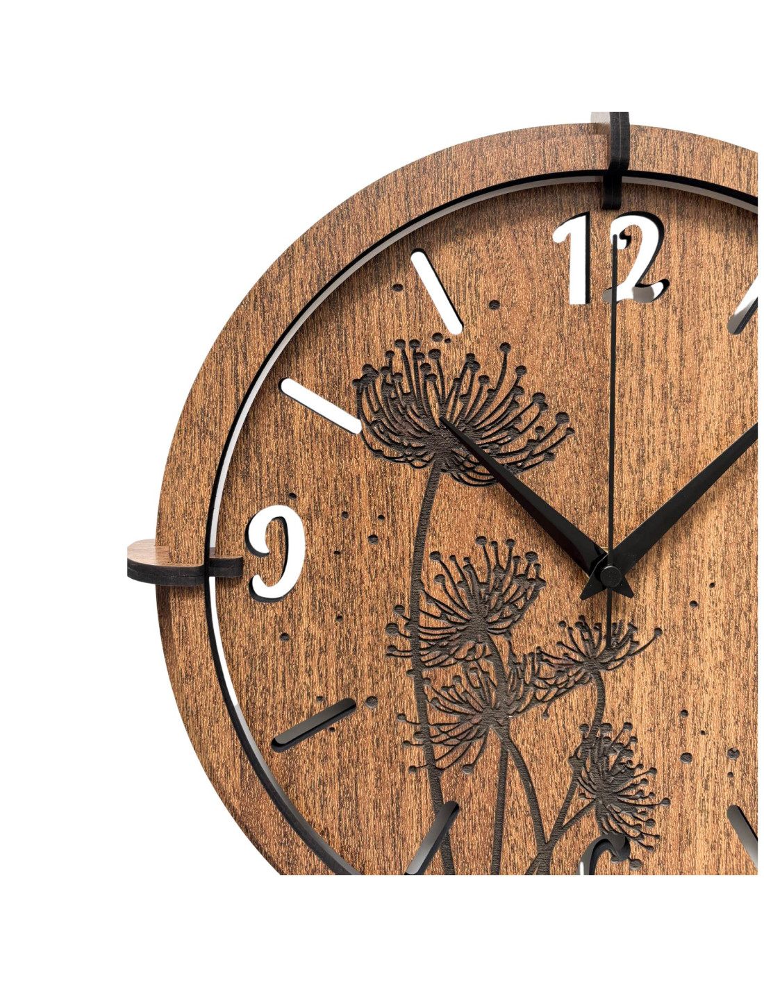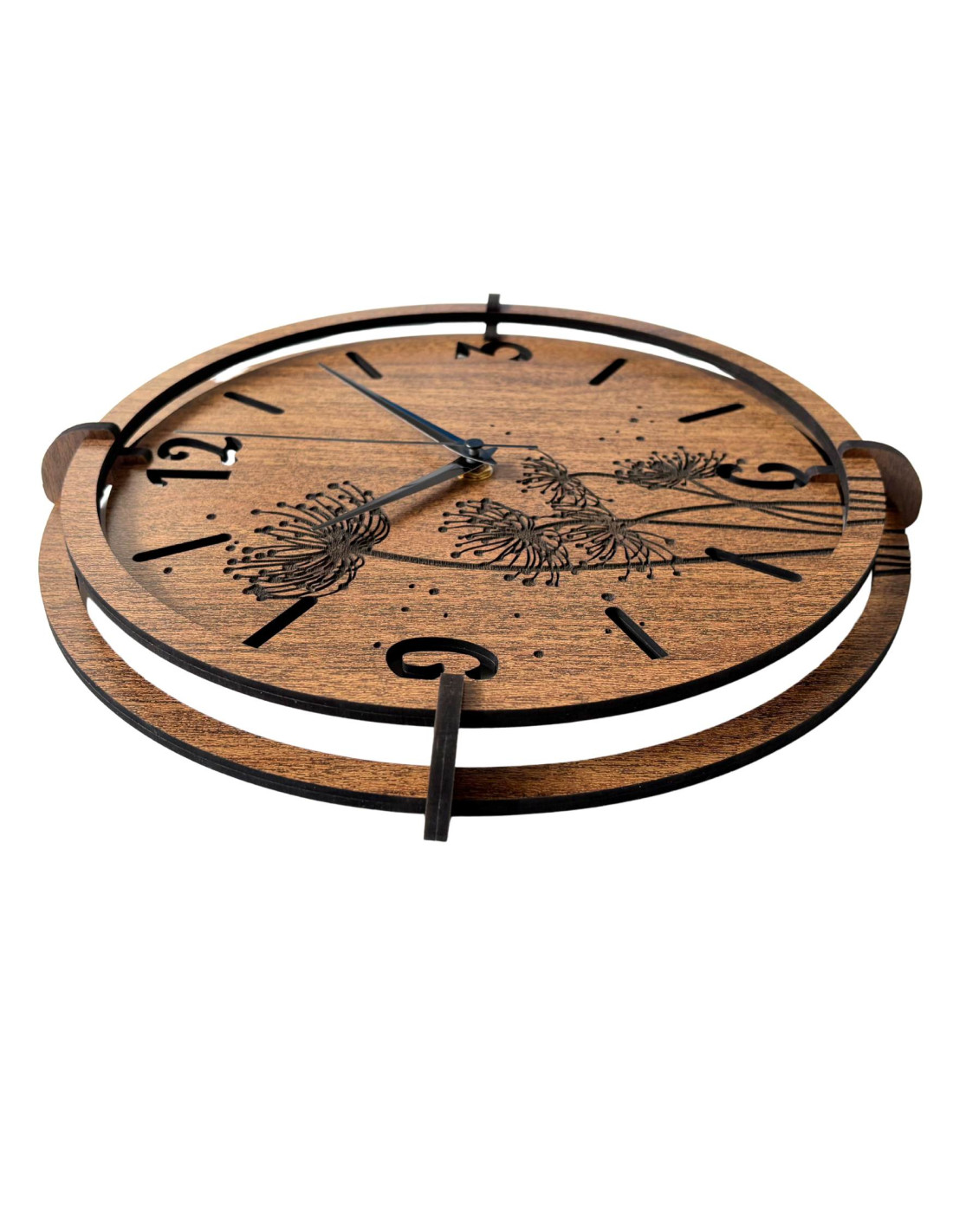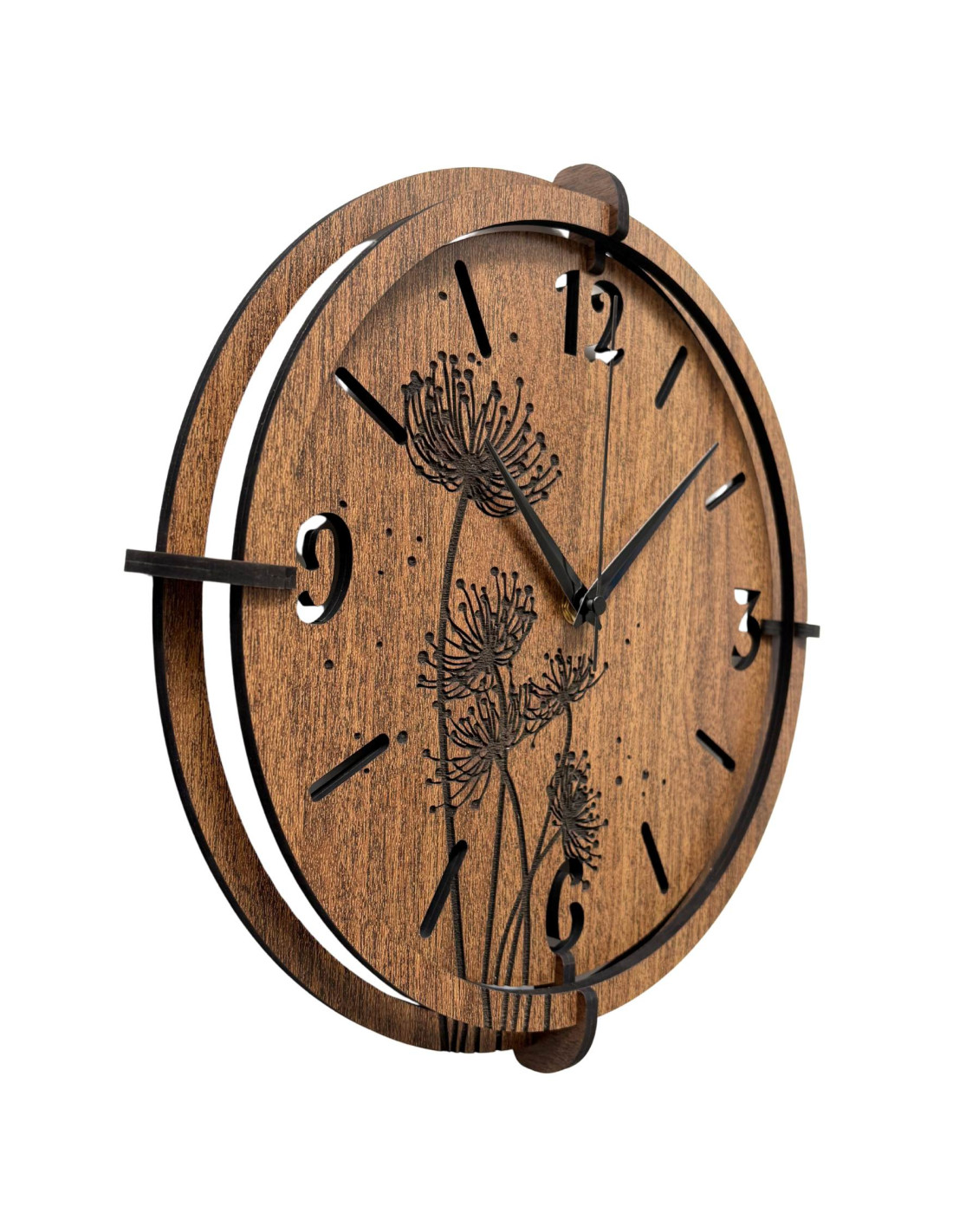 A pitypang és réti perje motívumával díszített modern, fából készült faliórák békét és harmóniát hoznak a belső térbe.