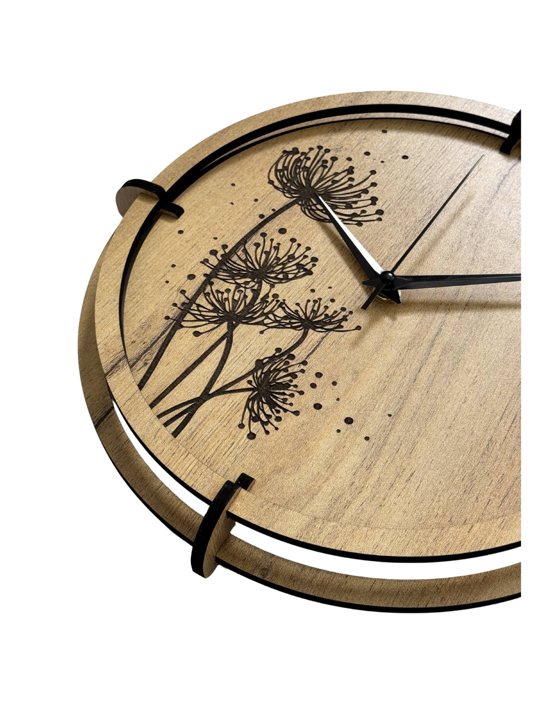 A vésett növényi motívumokkal díszített fa órák a természet esztétikáját ötvözik a pontos időmérés és a mechanizmus csendes működésével.