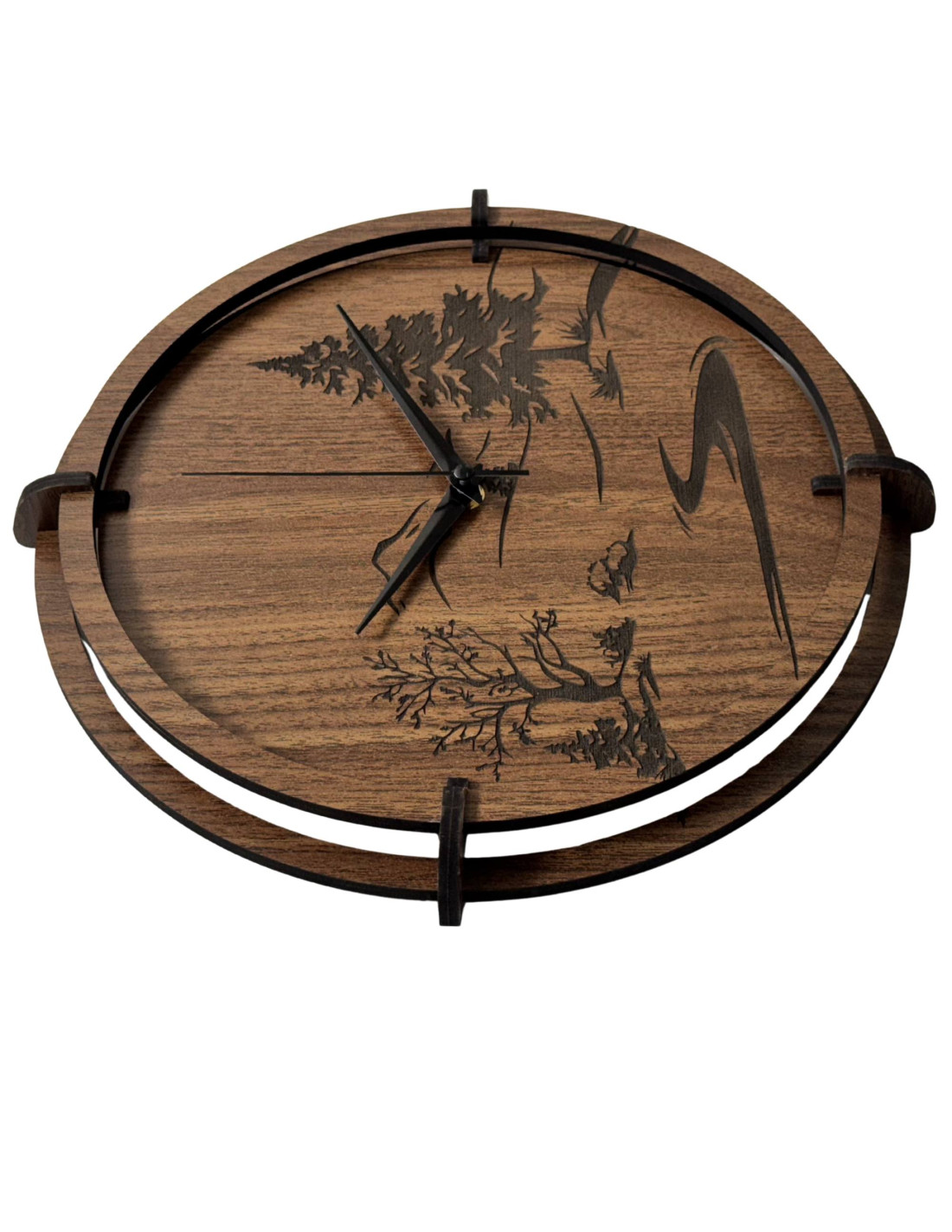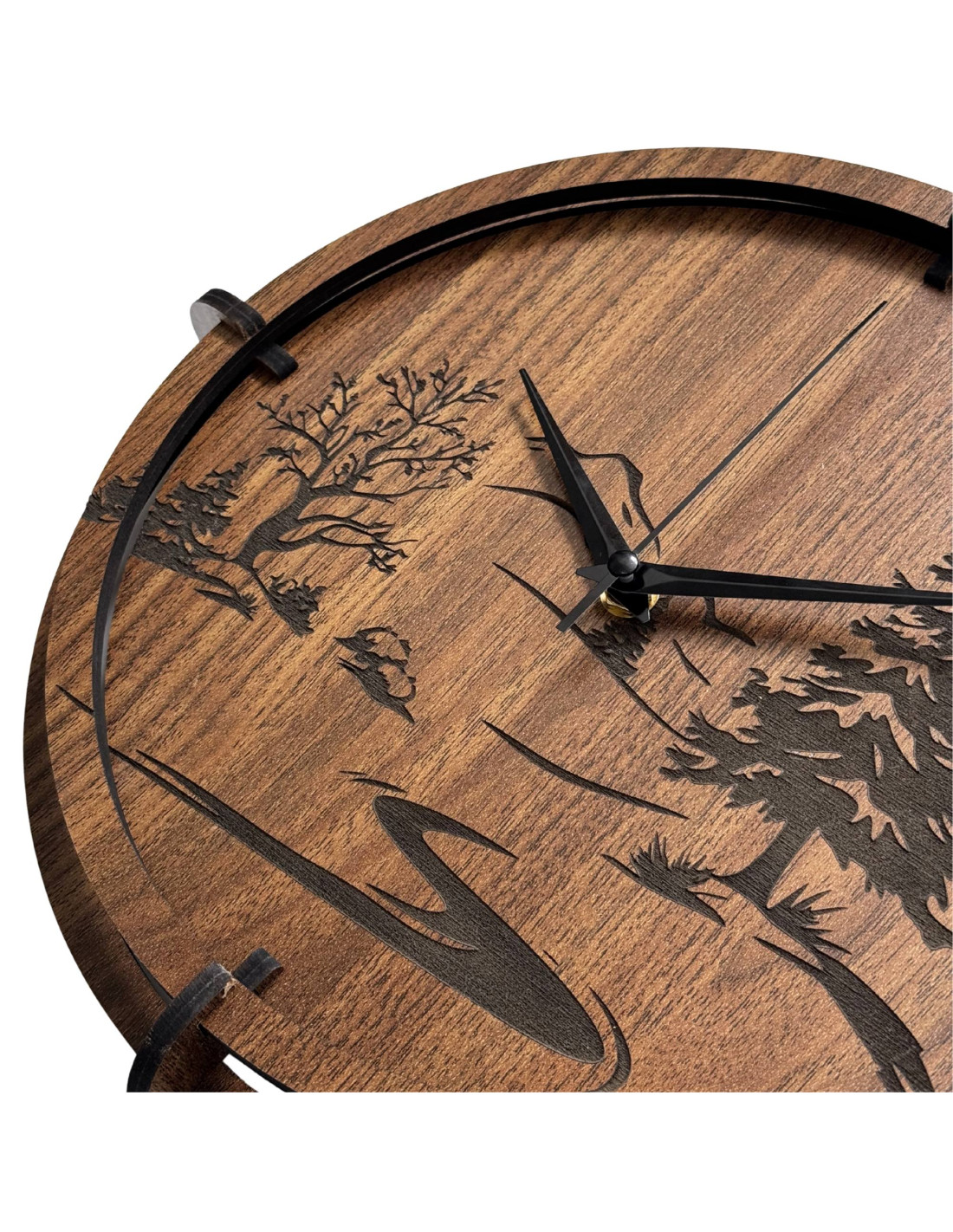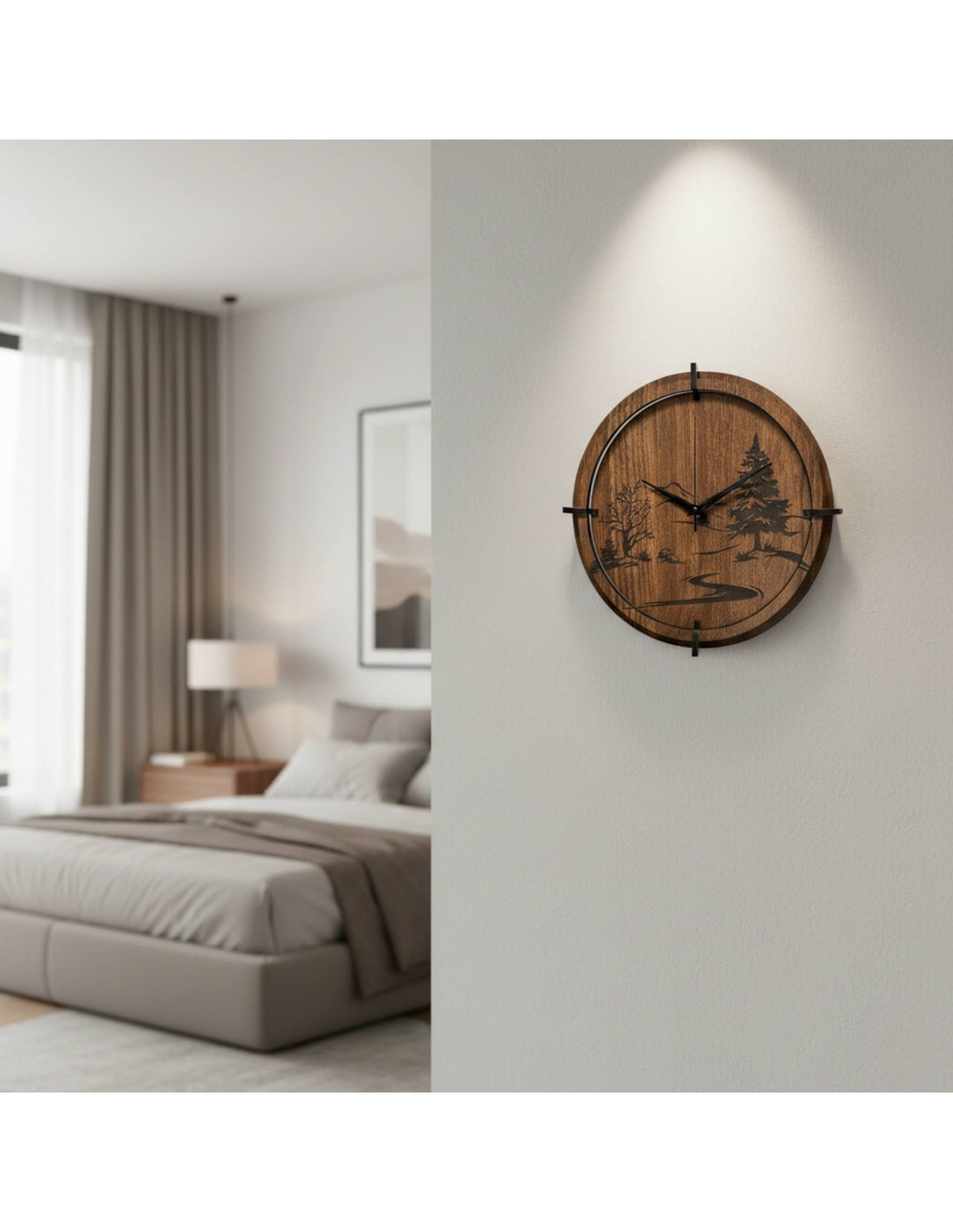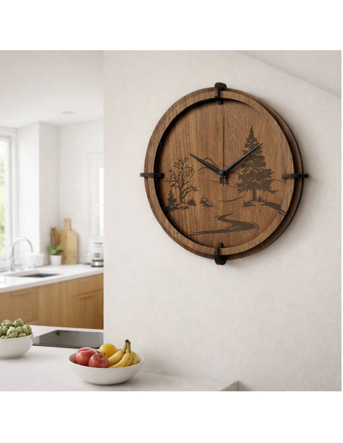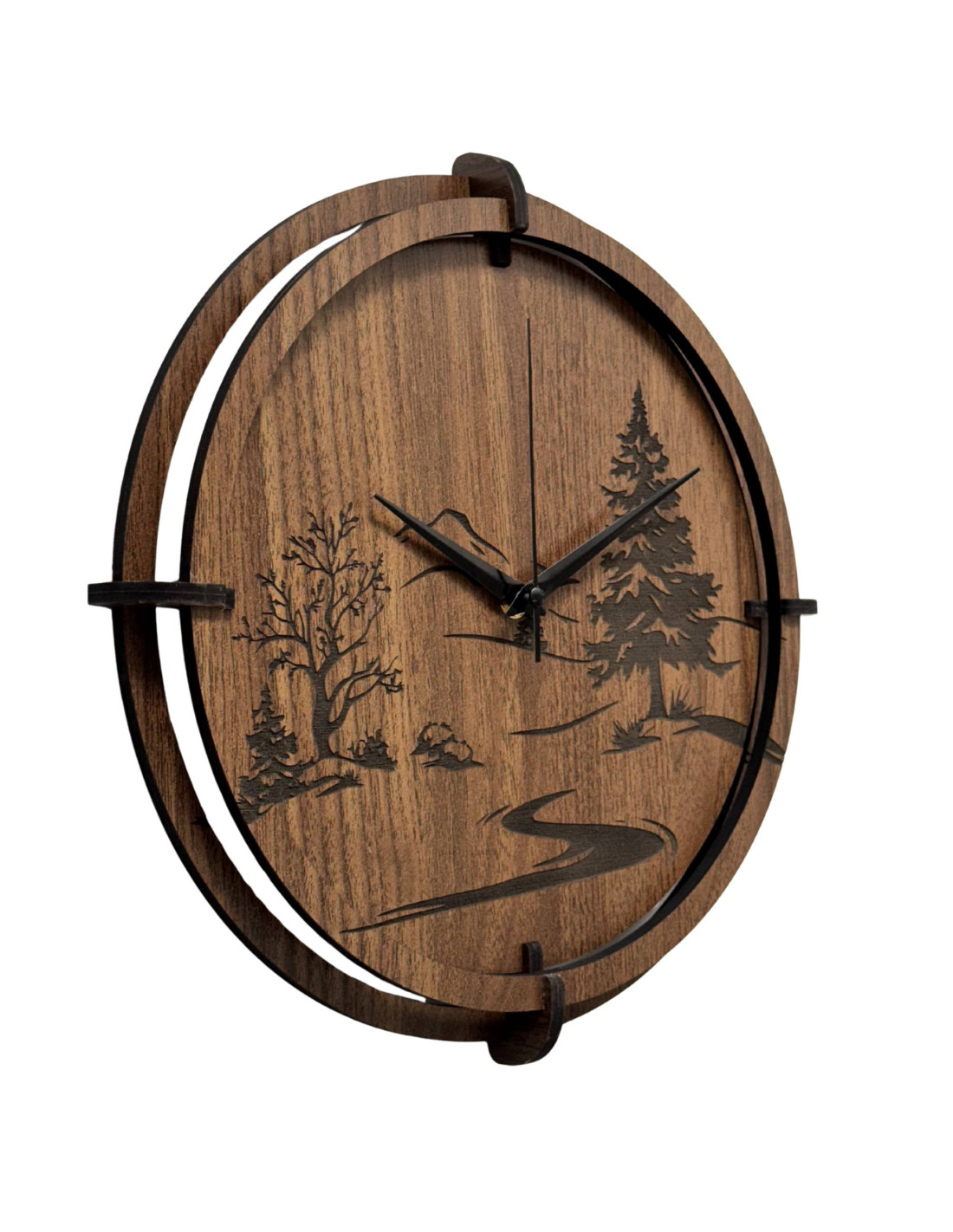 A modern , fából készült faliórák, melyeket részletesen kidolgozott , erdei tájat és fákat ábrázoló gravírozott motívummal díszítettek , a természet nyugalmát és időtlen eleganciát hoznak az enteriőrbe.