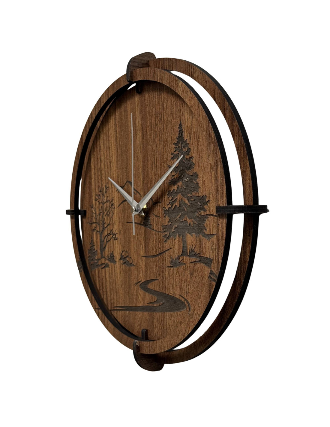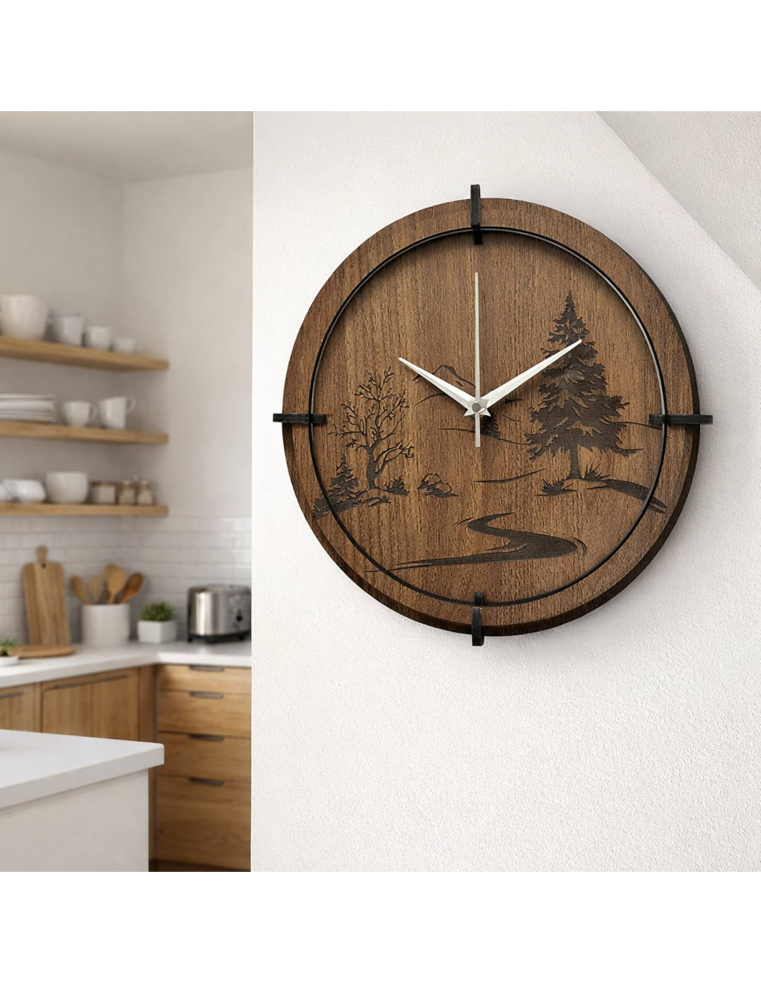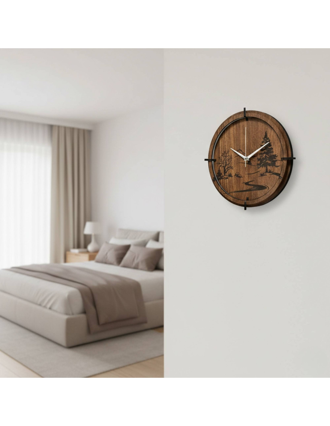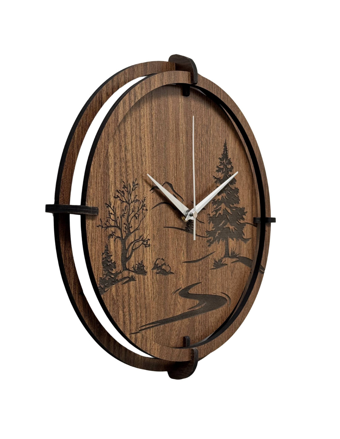A modern , fából készült faliórák, melyeket részletesen kidolgozott , erdei tájat és fákat ábrázoló gravírozott motívummal díszítettek , a természet nyugalmát és időtlen eleganciát hoznak az enteriőrbe.