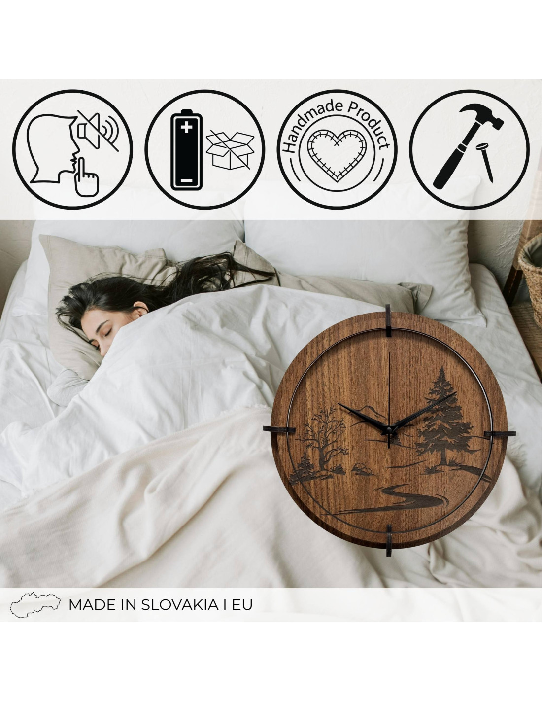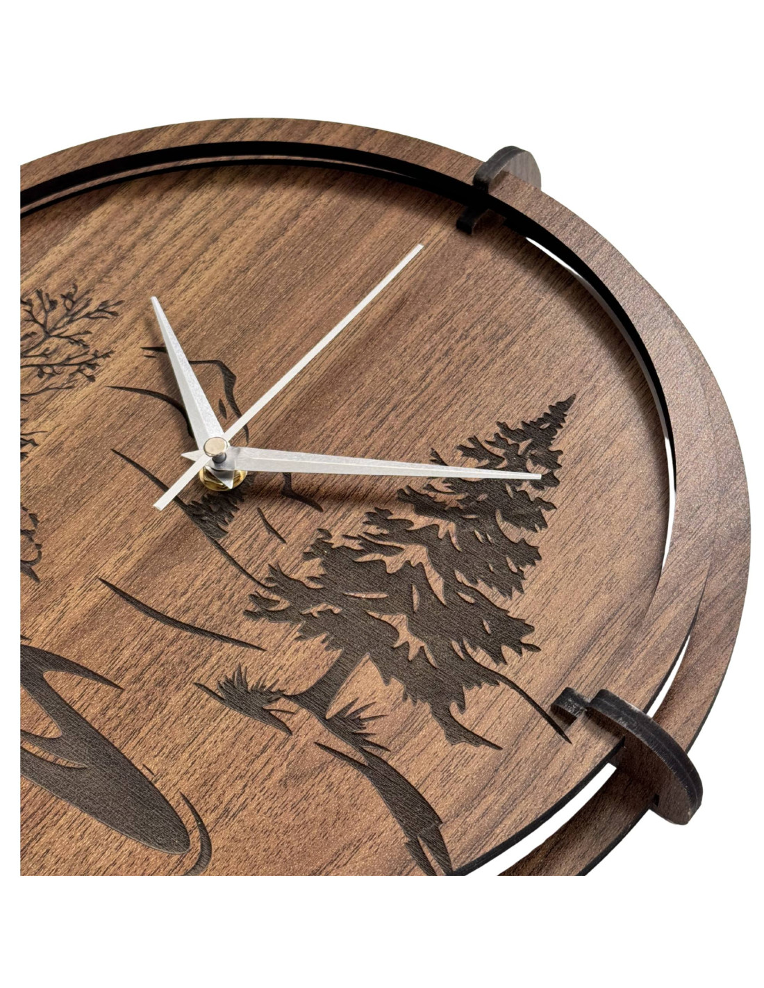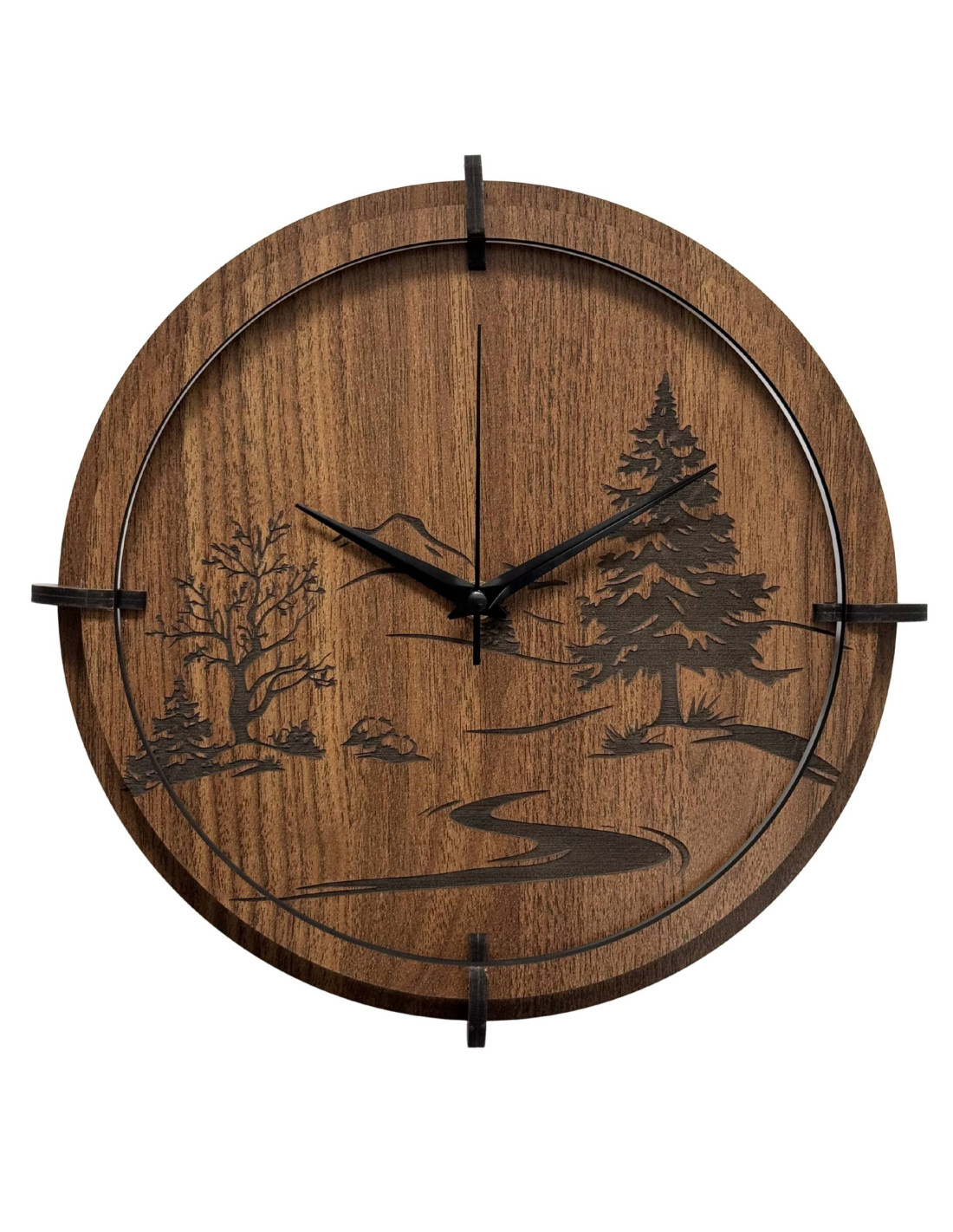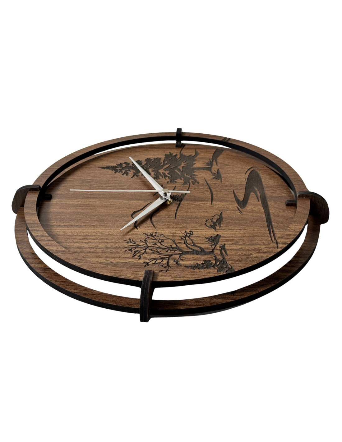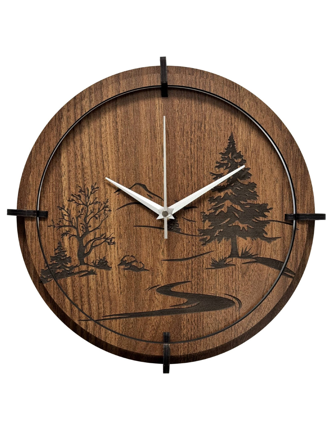 A modern , fából készült faliórák, melyeket részletesen kidolgozott , erdei tájat és fákat ábrázoló gravírozott motívummal díszítettek , a természet nyugalmát és időtlen eleganciát hoznak az enteriőrbe.