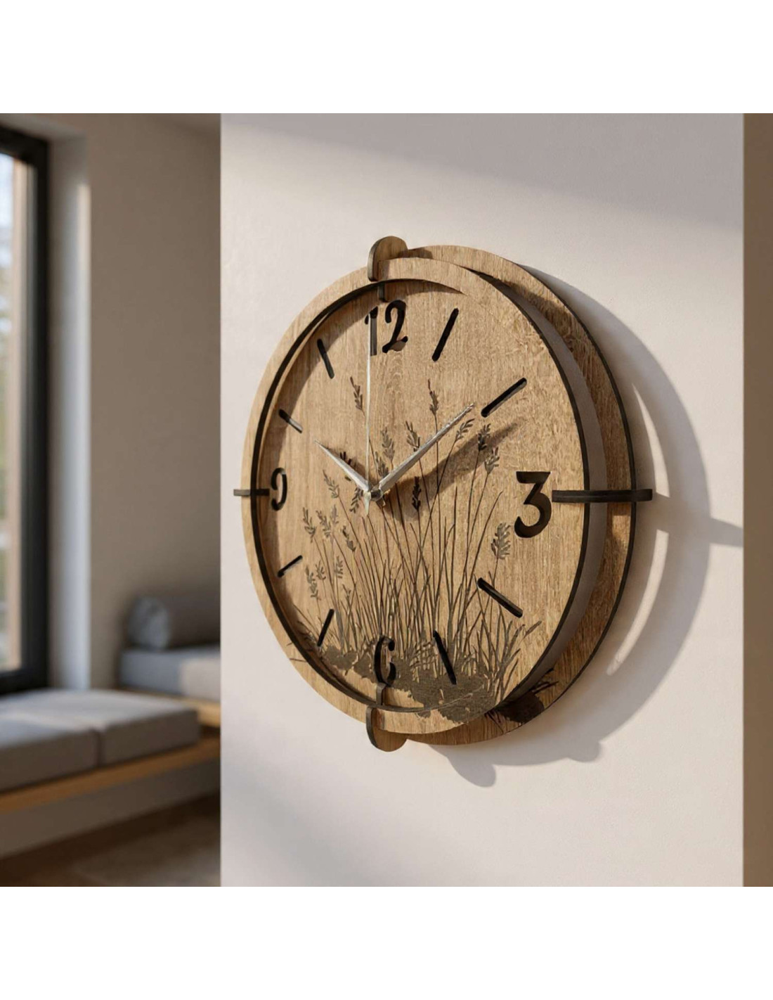 A modern , fából készült faliórák, finoman vésett réti perje motívummal, békét és harmóniát hoznak a belső térbe.