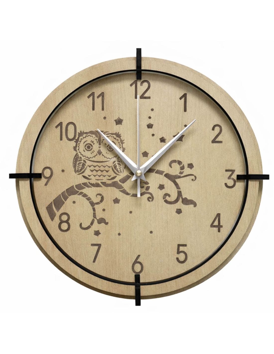 Modern, fából készült juharfa falióra, finom, gravírozott bagoly motívummal gyerekeknek, békét és harmóniát visz a belső térbe.