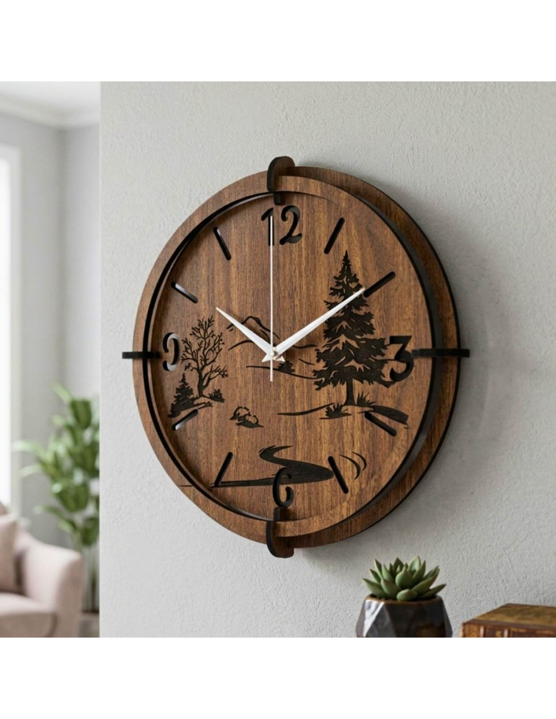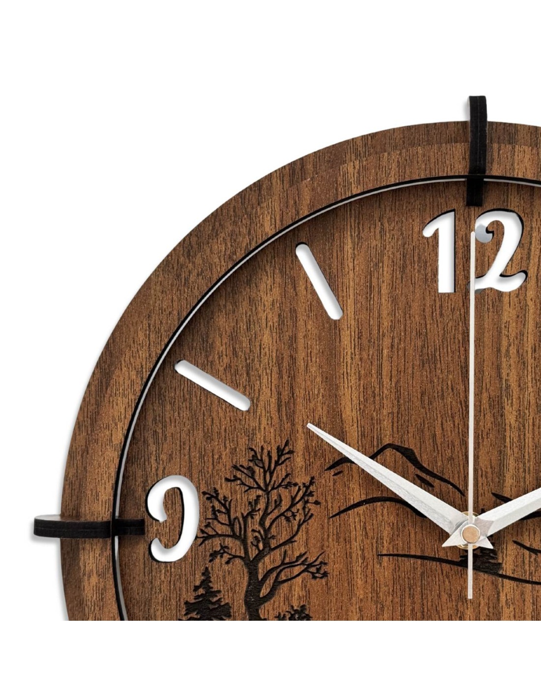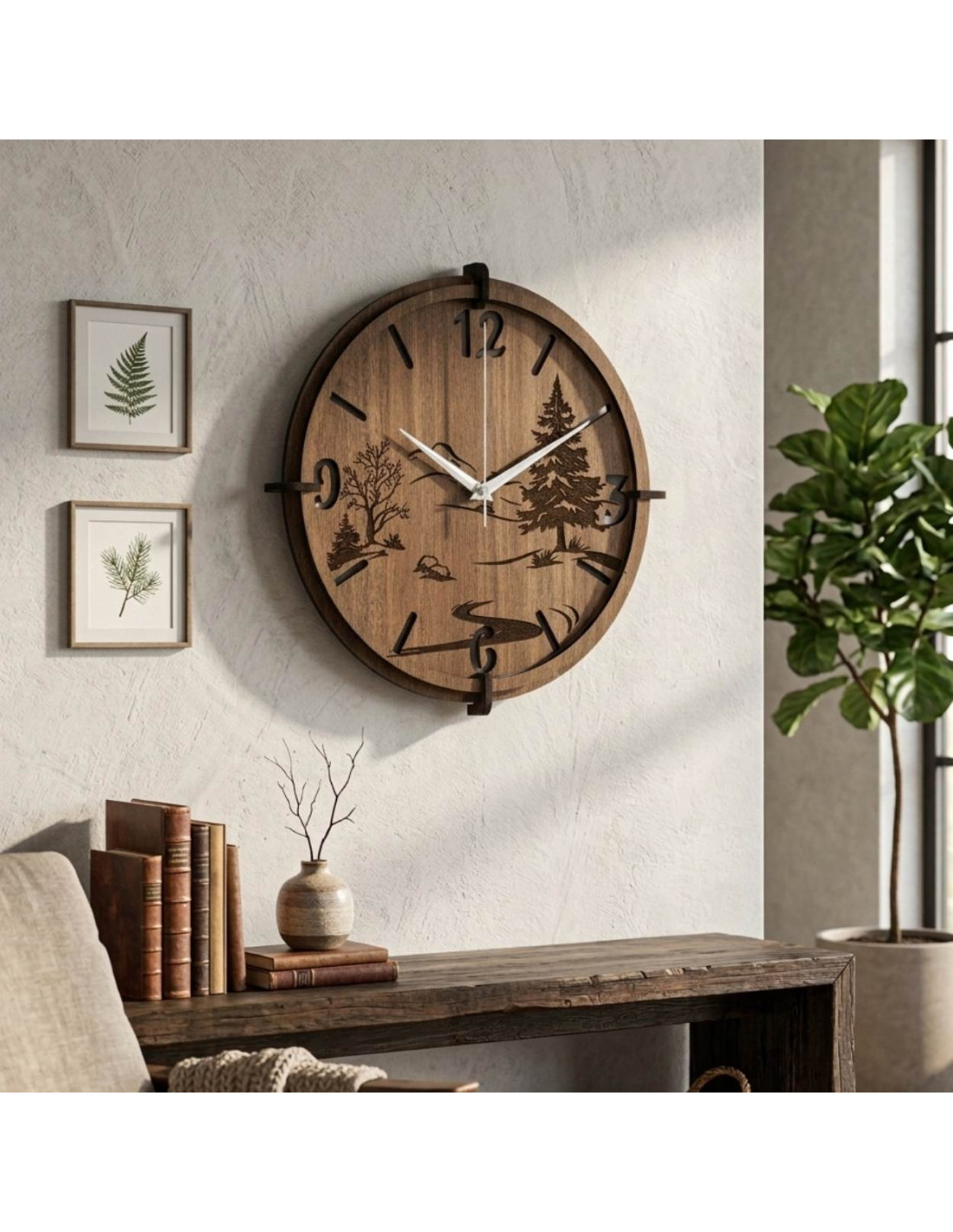 Modern, fából készült falióra panorámás 3D-s erdő- és hegymotívummal, amely a természet erejét és a szabadság érzését hozza el a belső térbe.