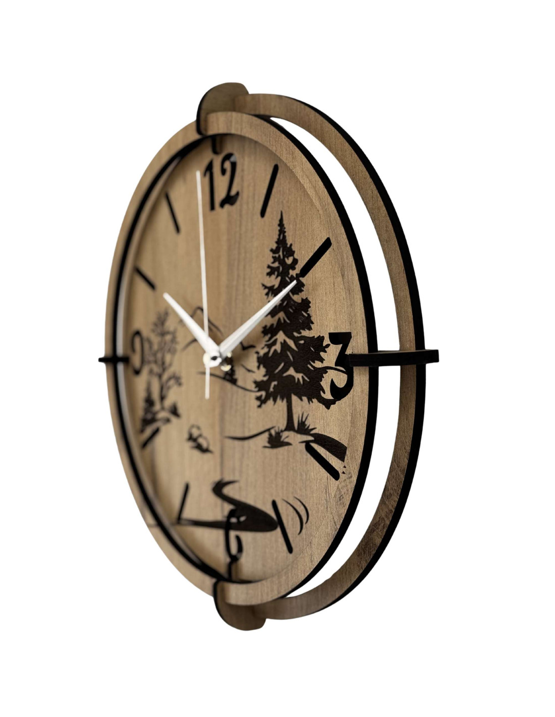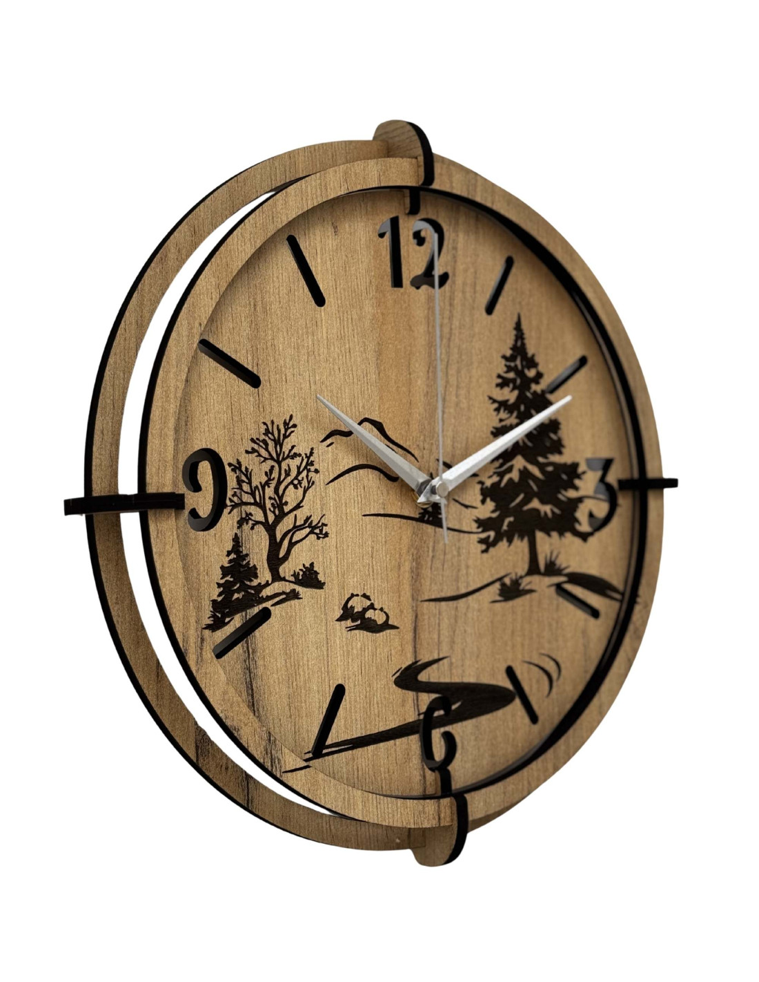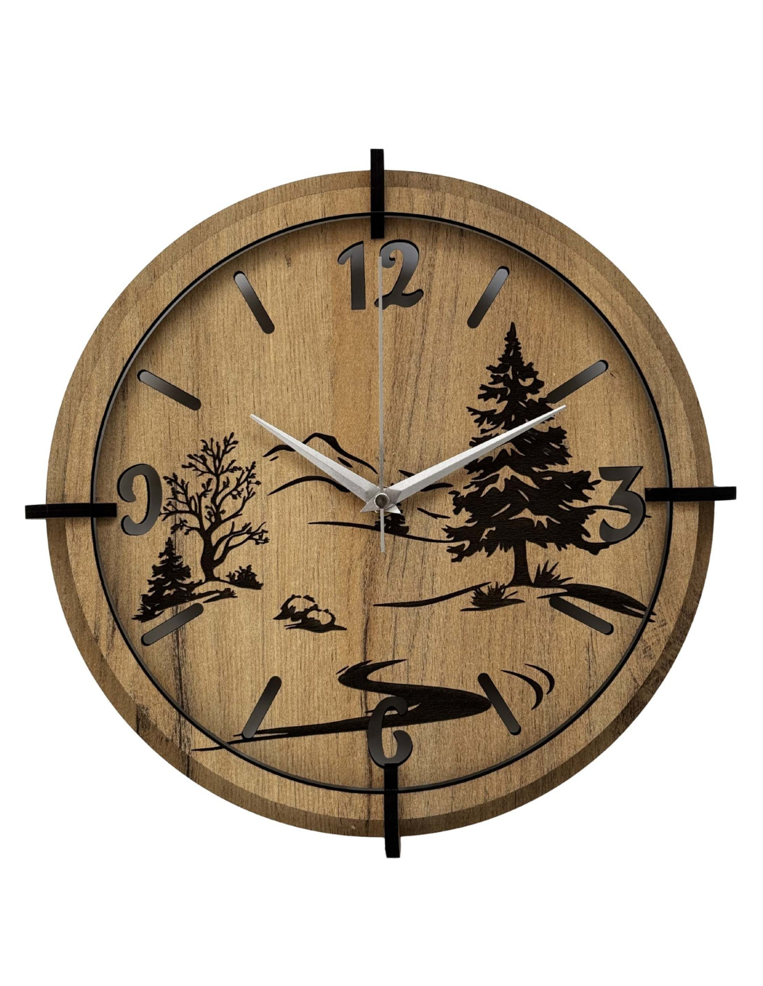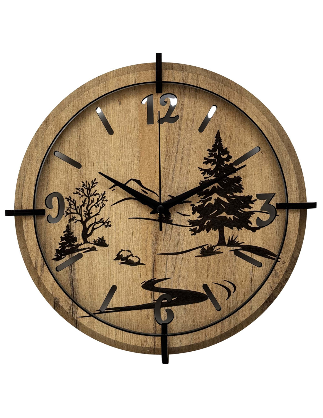 A részletesen kidolgozott dizájn egy domináns örökzöld fát, finom fa sziluetteket, hegyi horizontot és kanyargós folyót ábrázol, melyeket kiváló minőségű HDF lapba faragtak HDF ARANY TÖLGY díszítéssel, ami meleg és természetes megjelenést kölcsönöz az órának.
