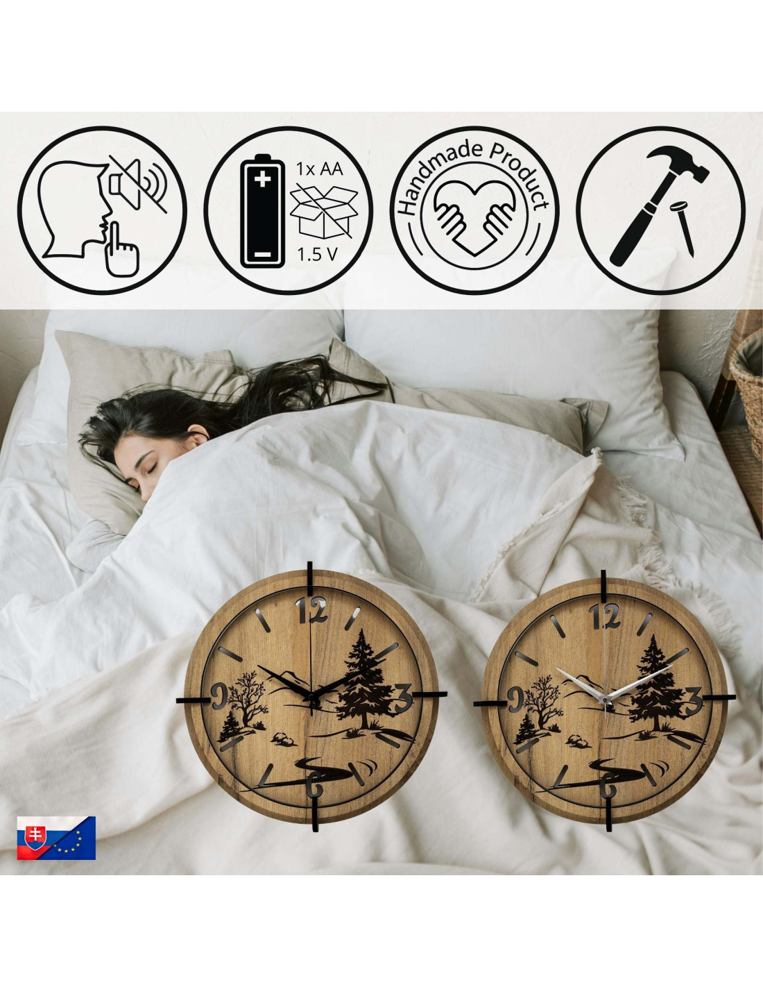 A precíz tájképgravírozással ellátott fa órák a természet hiteles megjelenését ötvözik a modern dizájnnal , a kontrasztos fekete elemekkel és a megbízható, csendes mechanizmussal.