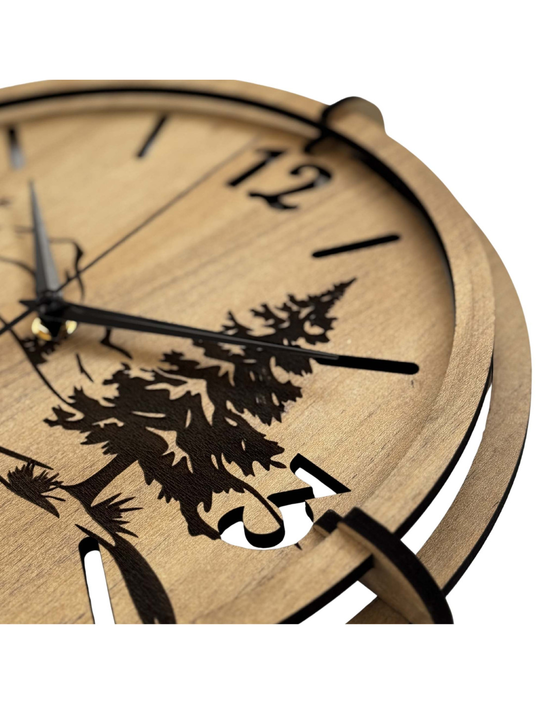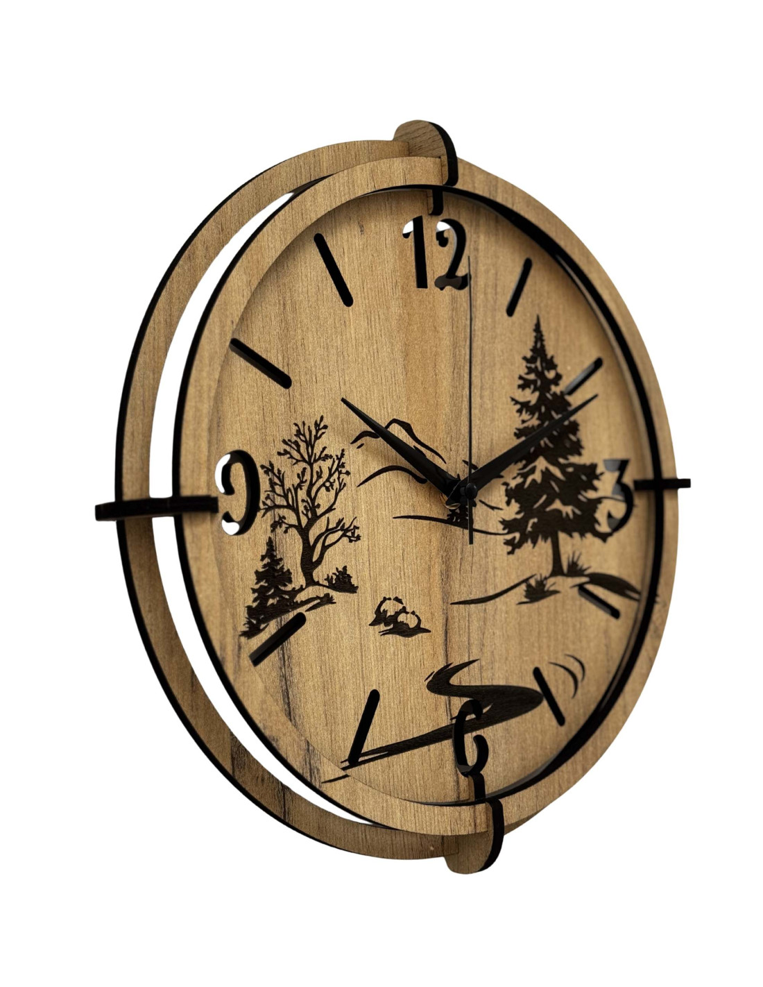 A részletesen kidolgozott dizájn egy domináns örökzöld fát, finom fa sziluetteket, hegyi horizontot és kanyargós folyót ábrázol, melyeket kiváló minőségű HDF lapba faragtak HDF ARANY TÖLGY díszítéssel, ami meleg és természetes megjelenést kölcsönöz az órának.