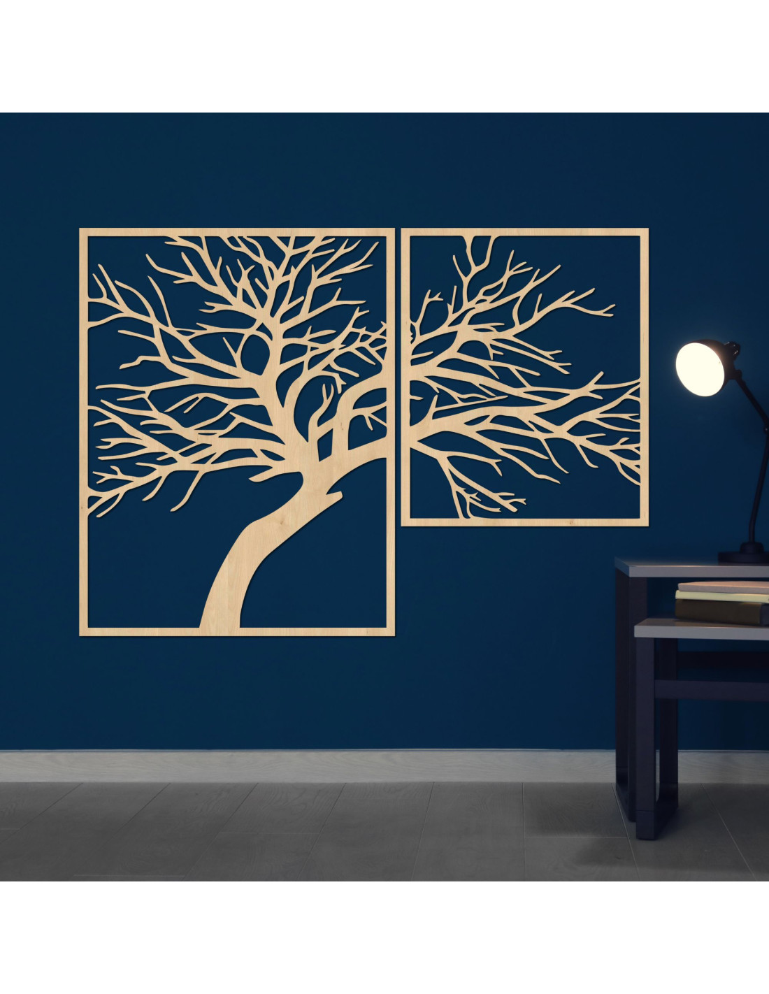 Egy elegáns, kétrészes, fa motívummal díszített festmény modern hangulatot és természetes szépséget visz otthonába.