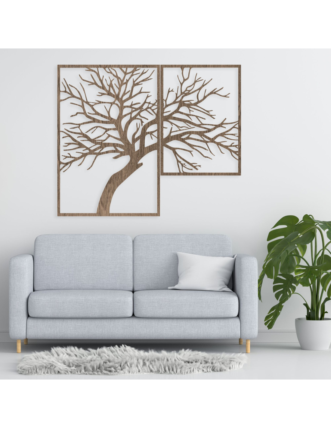 Egy elegáns, kétrészes, fa motívummal díszített festmény modern hangulatot és természetes szépséget visz otthonába.