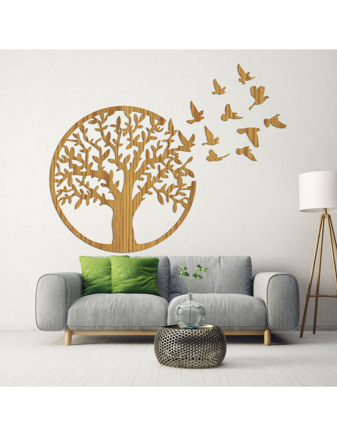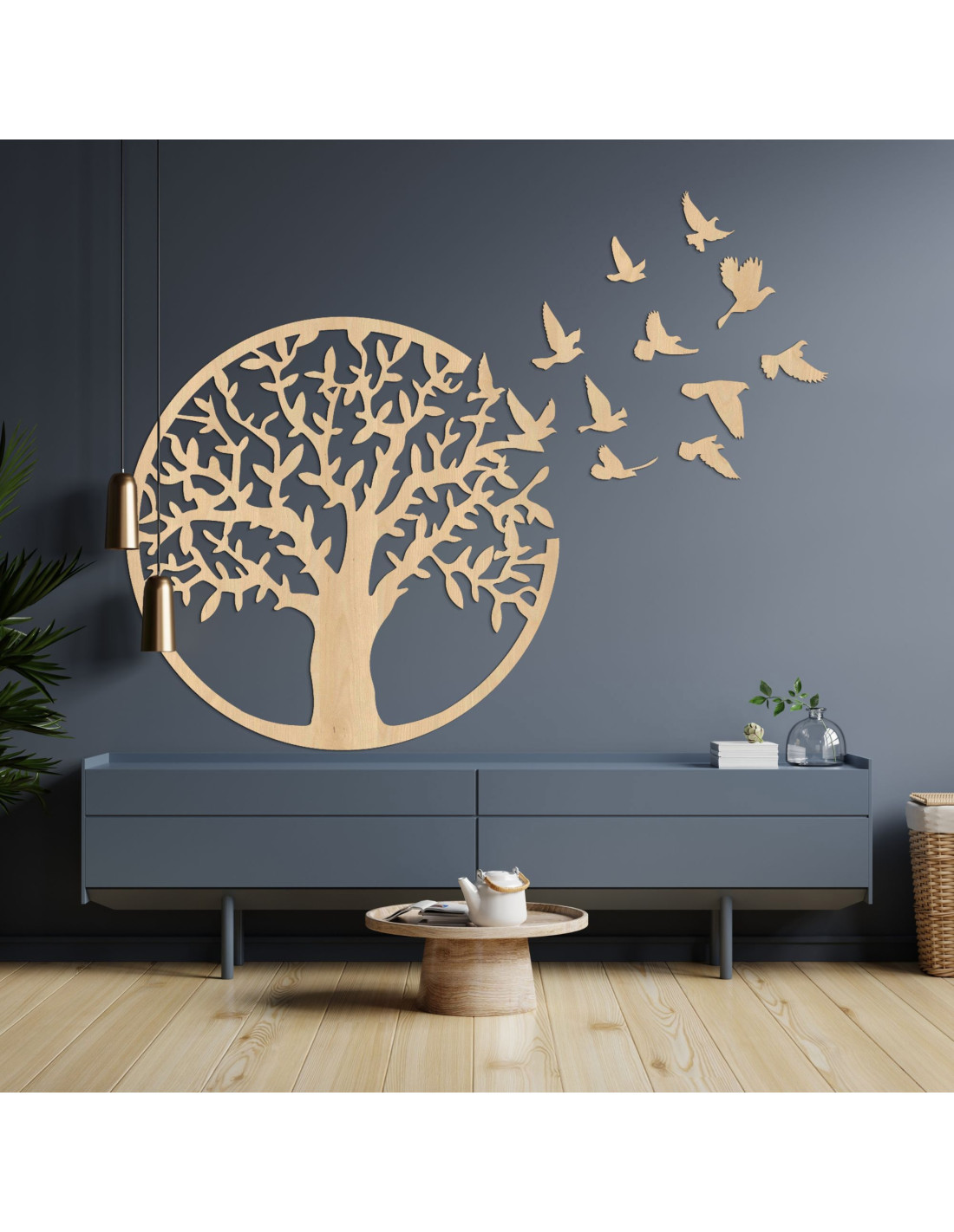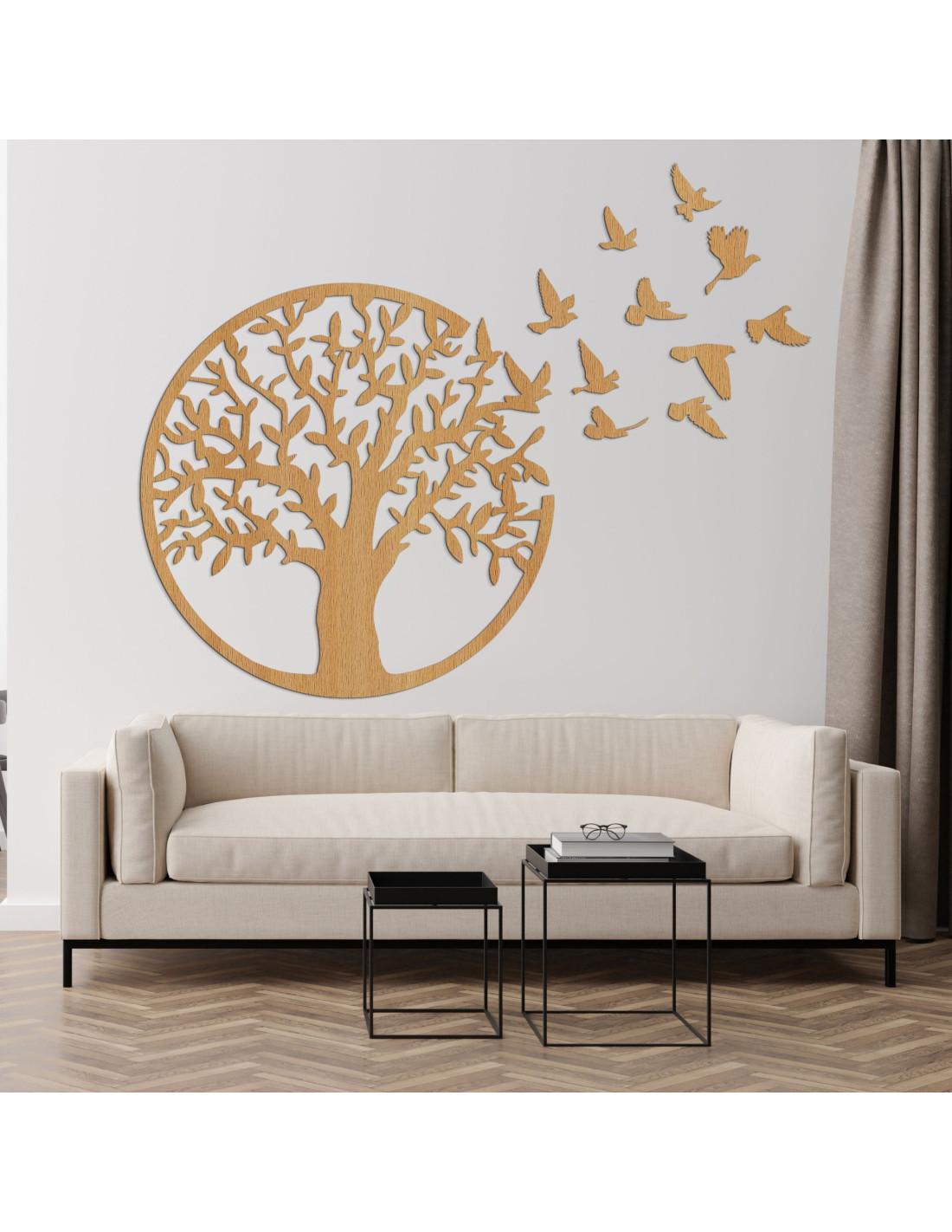 Dobja fel belső terét egy elegáns fából készült fali dekorációval, amely egy fa szépségét örökíti meg szárnyaló madarakkal. Ez az egyedi műalkotás tökéletes azok számára, akik modern és természetes hangsúlyokat keresnek terükben.