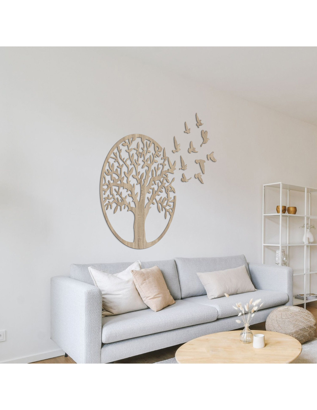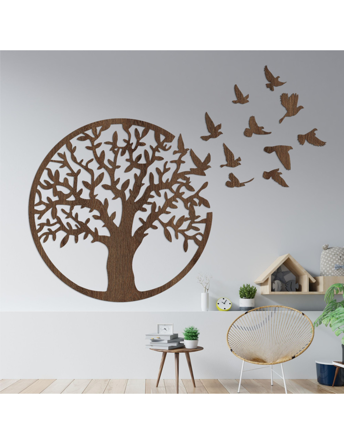 Vigyen otthonába egy egyedi természeti darabot elegáns, fát és szárnyaló madarakat ábrázoló fa faldekorációnkkal. Ez a modern dizájn nemcsak megszépíti a belső teret, hanem otthonos hangulatot is teremt. Ideális gyerekszobákba, nappalikba vagy irodákba, ahol melegséget és karaktert kölcsönöz a térnek. Kiváló minőségű fából készült, tartósságot és hosszú élettartamot garantál. Rendelje meg még ma, és dobja fel falait! Fa faldekoráció az élet fájával: rusztikus lakberendezési panel