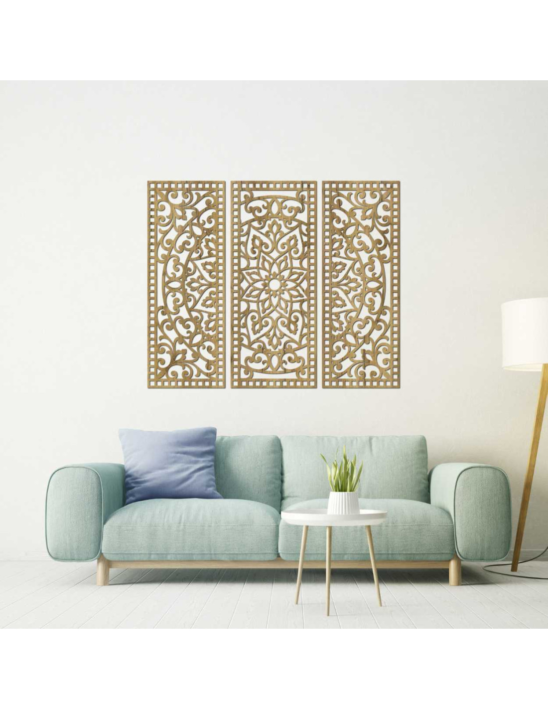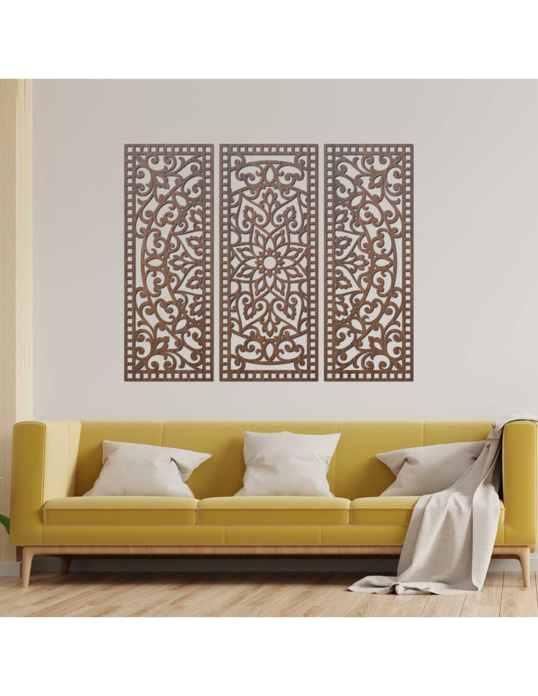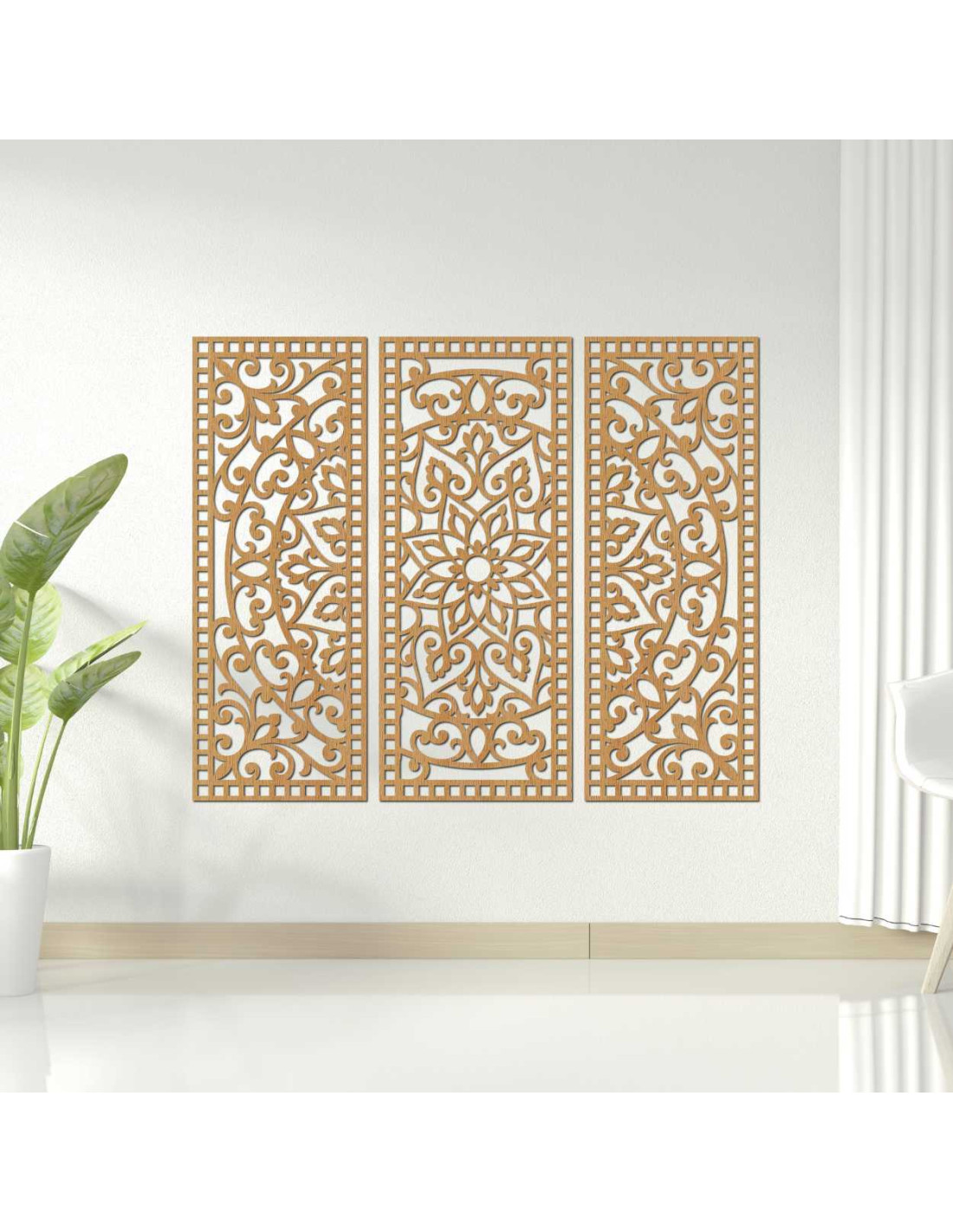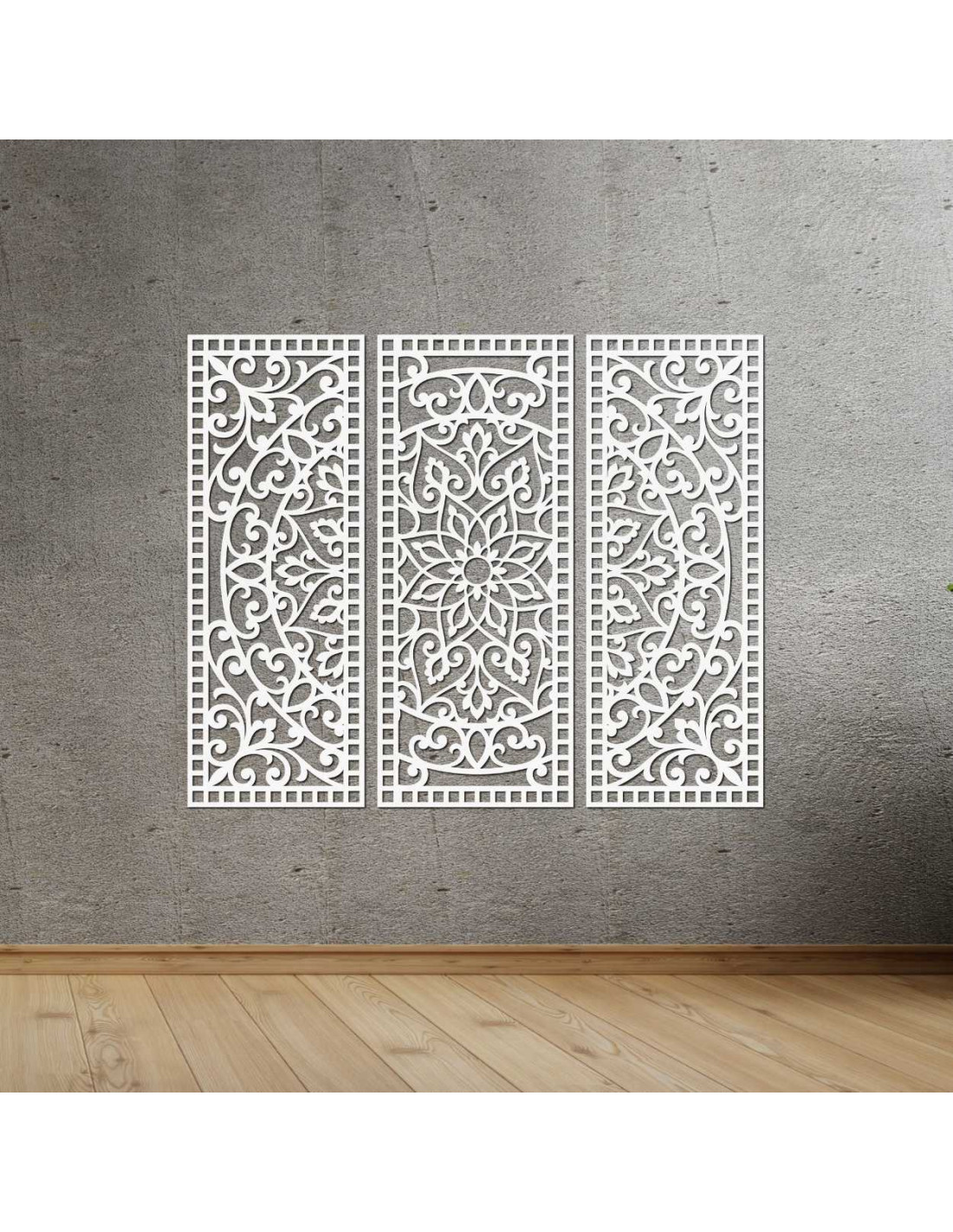 Virágos mandala fából - A bohém, 3 darabos fali dekoráció a hagyományos mandala minták és a modern precíziós kidolgozás kombinációját képviseli.