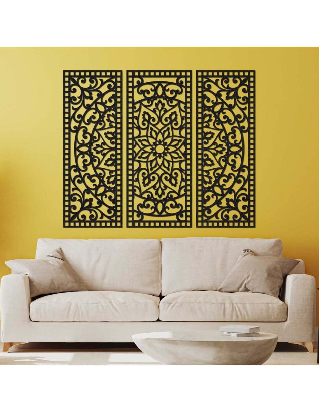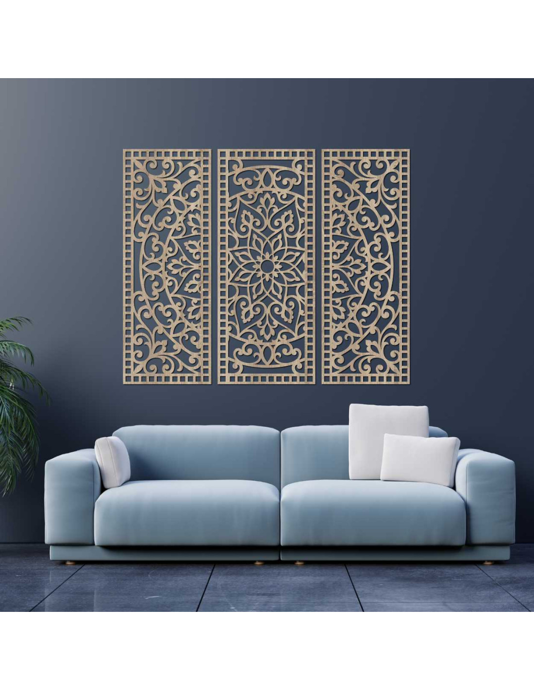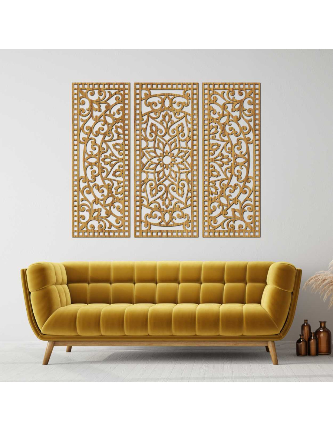Az elegancia, az egyensúly és a kézimunka precizitása egyesül ebben az egyedi , fából készült Virágos Mandala műalkotásban - bohém, háromrészes fali dekoráció . A finoman faragott részletek és a három panel harmonikus kompozíciója tökéletes egyensúlyt teremt a természet és a geometria között , bármilyen teret a béke és az inspiráció helyévé varázsolva.