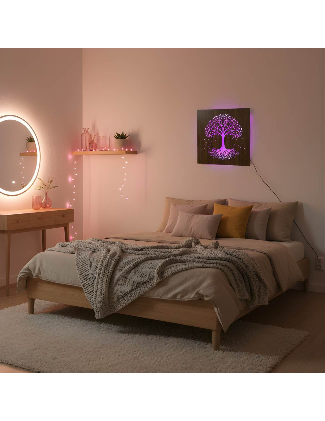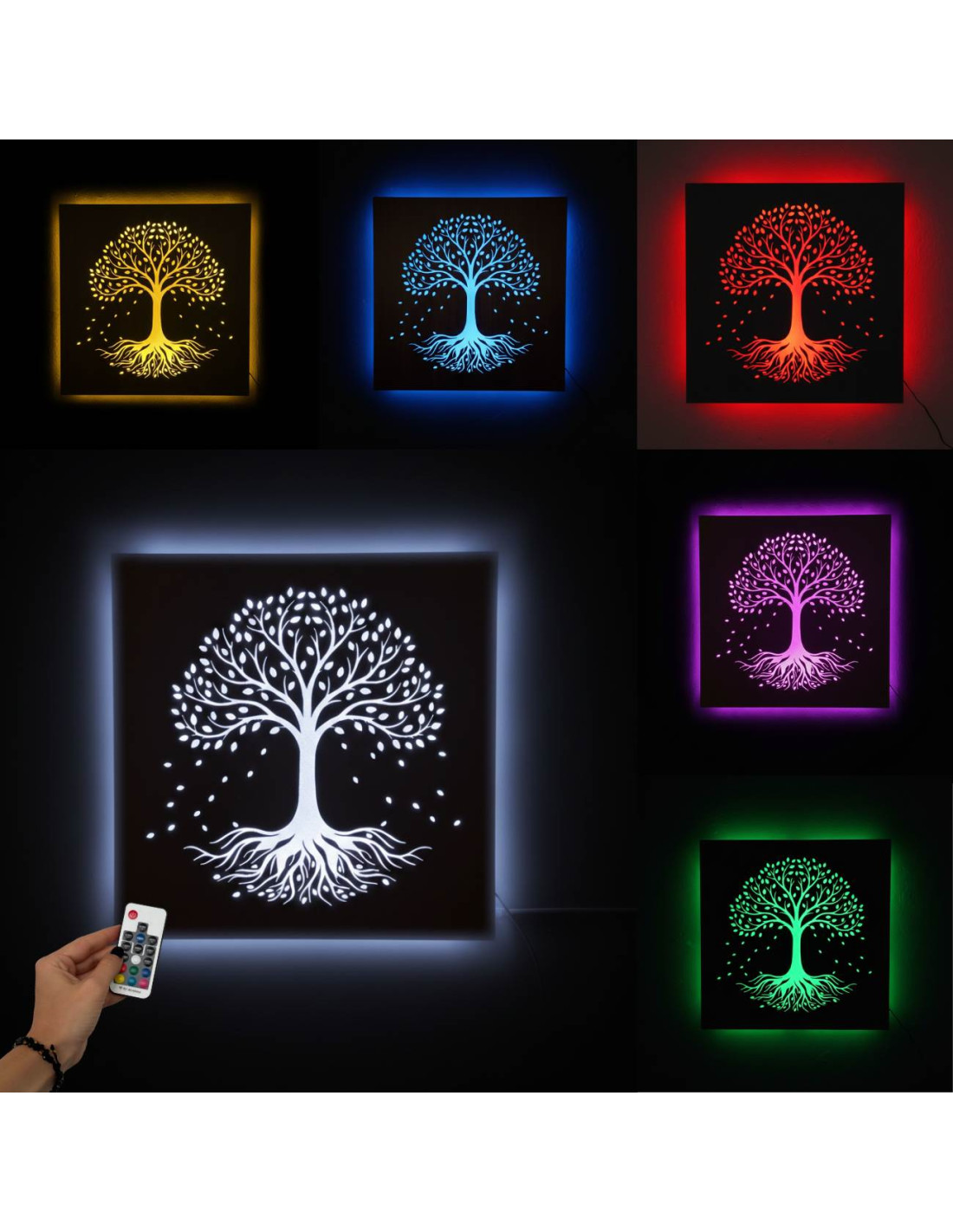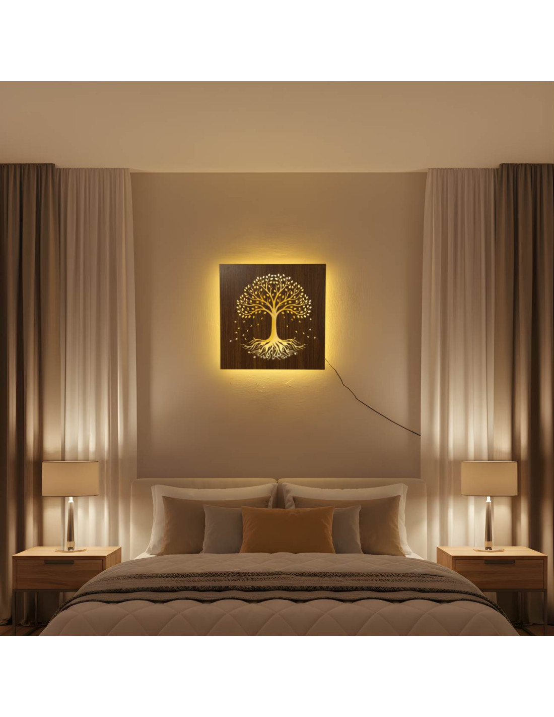 Az eredeti , háttérvilágítású, fából készült festmény - az Életfa - a természetes anyagok, a modern dizájn és a finom LED-világítás kombinációját testesíti meg. Ez az egyedi darab harmonikus hangulatot teremt, amely bármilyen belső teret otthonossá varázsol - a nappalitól és a hálószobától kezdve az irodán át a meditációs térig .