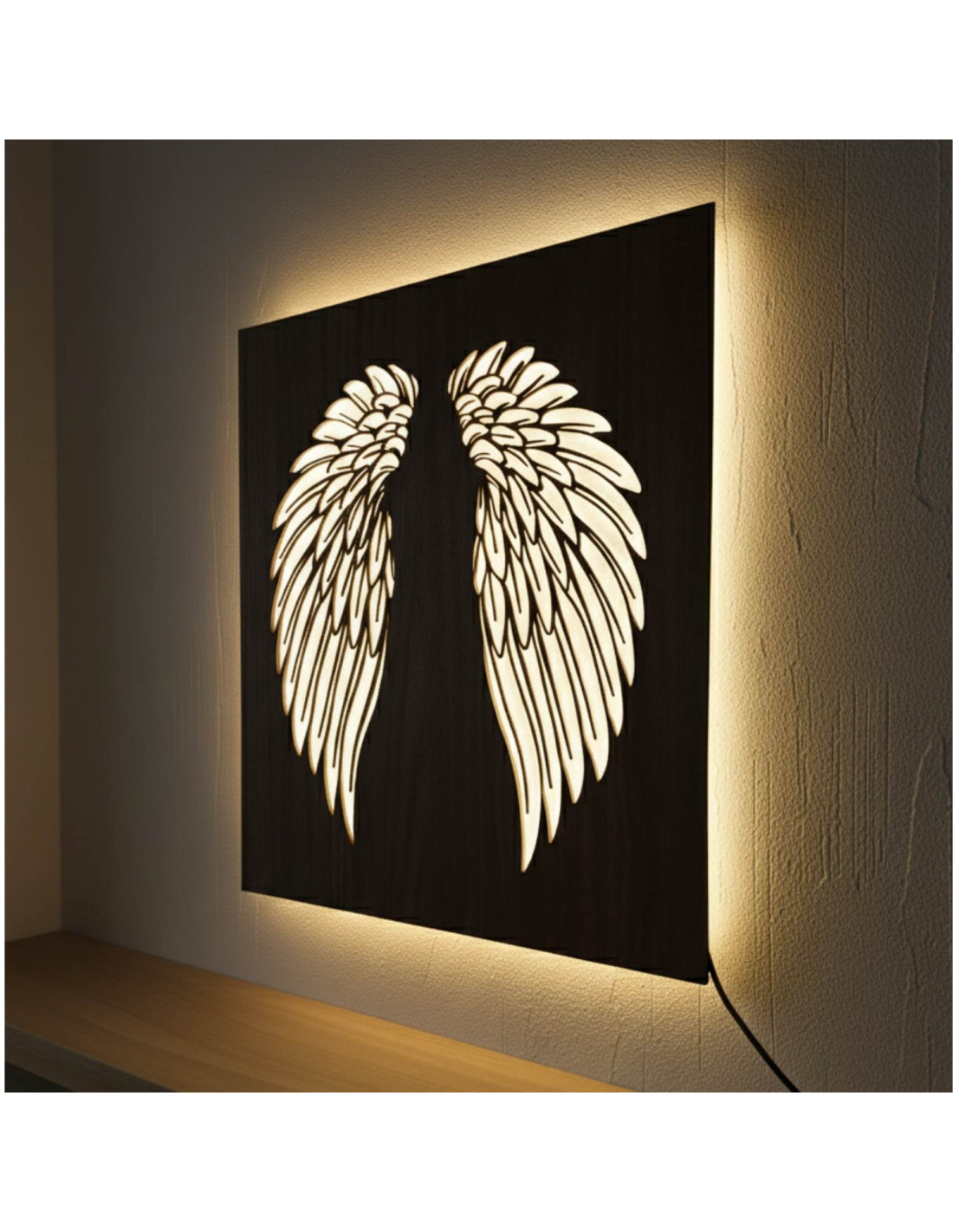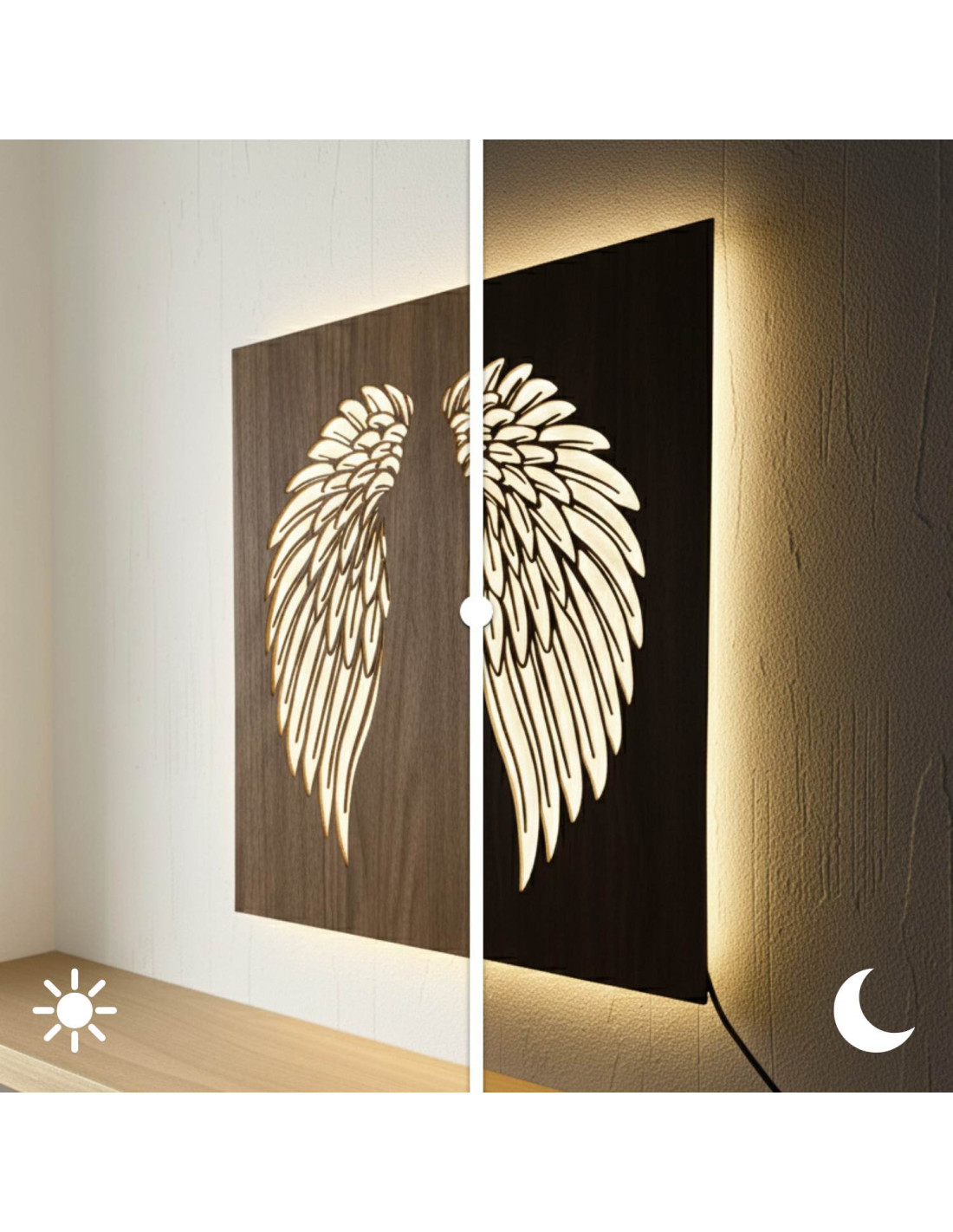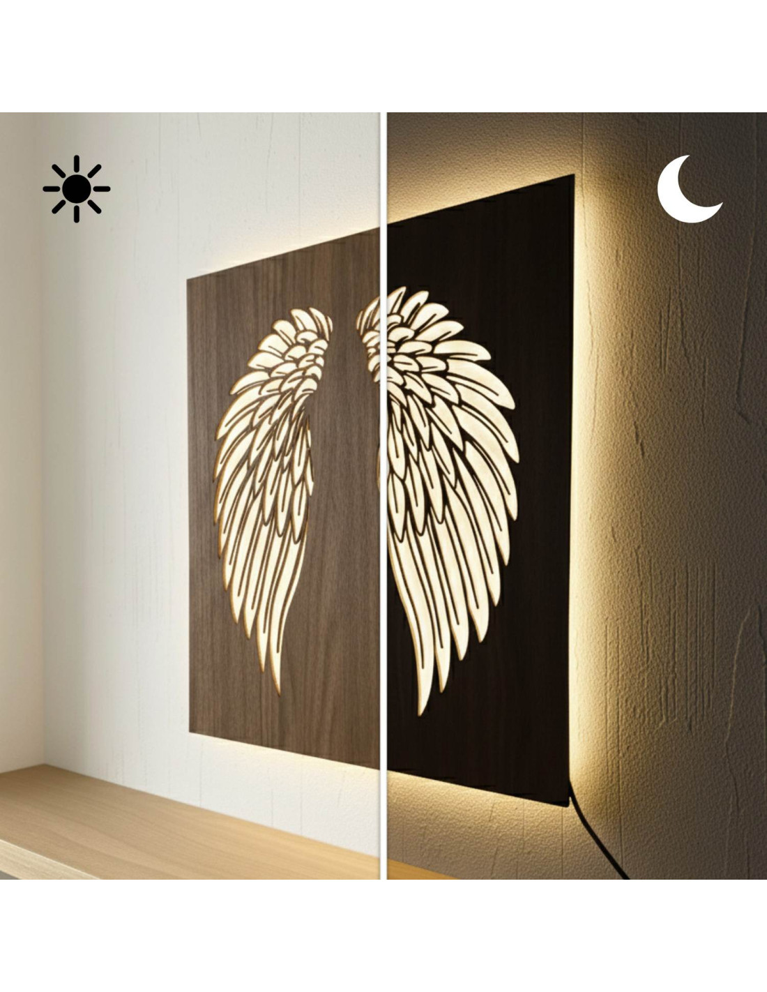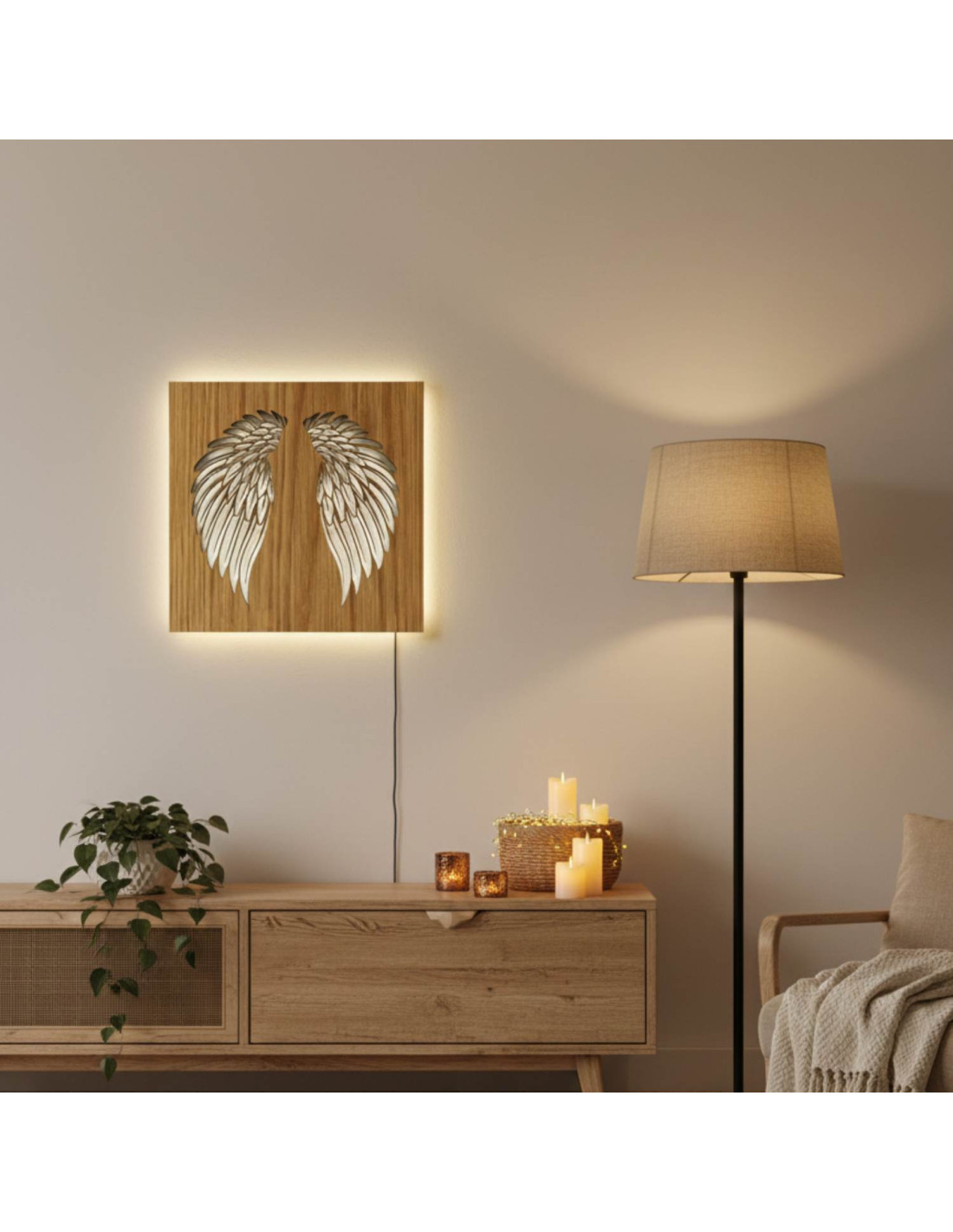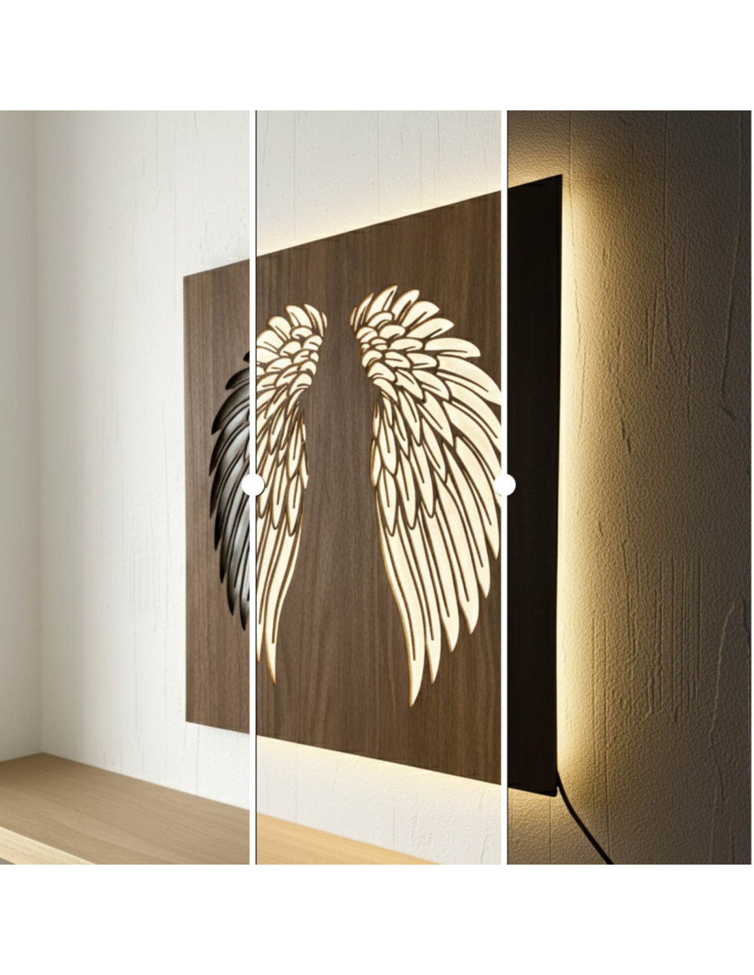 Az eredeti , háttérvilágítással ellátott, fából készült festmény – angyalszárnyak – a fa természetes szépségét, a modern dizájnt és a finom LED-világítást ötvözi egy egyedi műalkotásban. Ez az elegáns darab békét, fényt és harmóniát hoz a térbe, otthonossá varázsolva minden belső teret – a nappaliktól és hálószobáktól kezdve a reprezentatív irodákig .