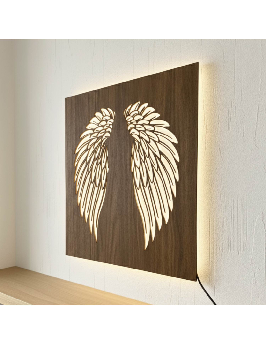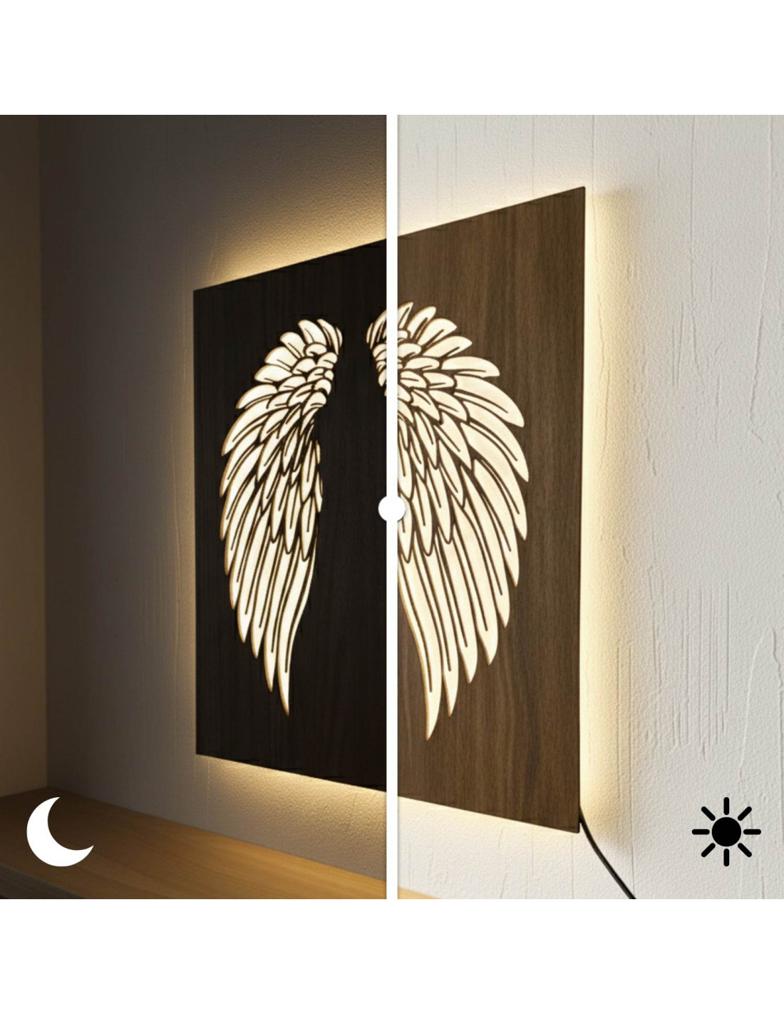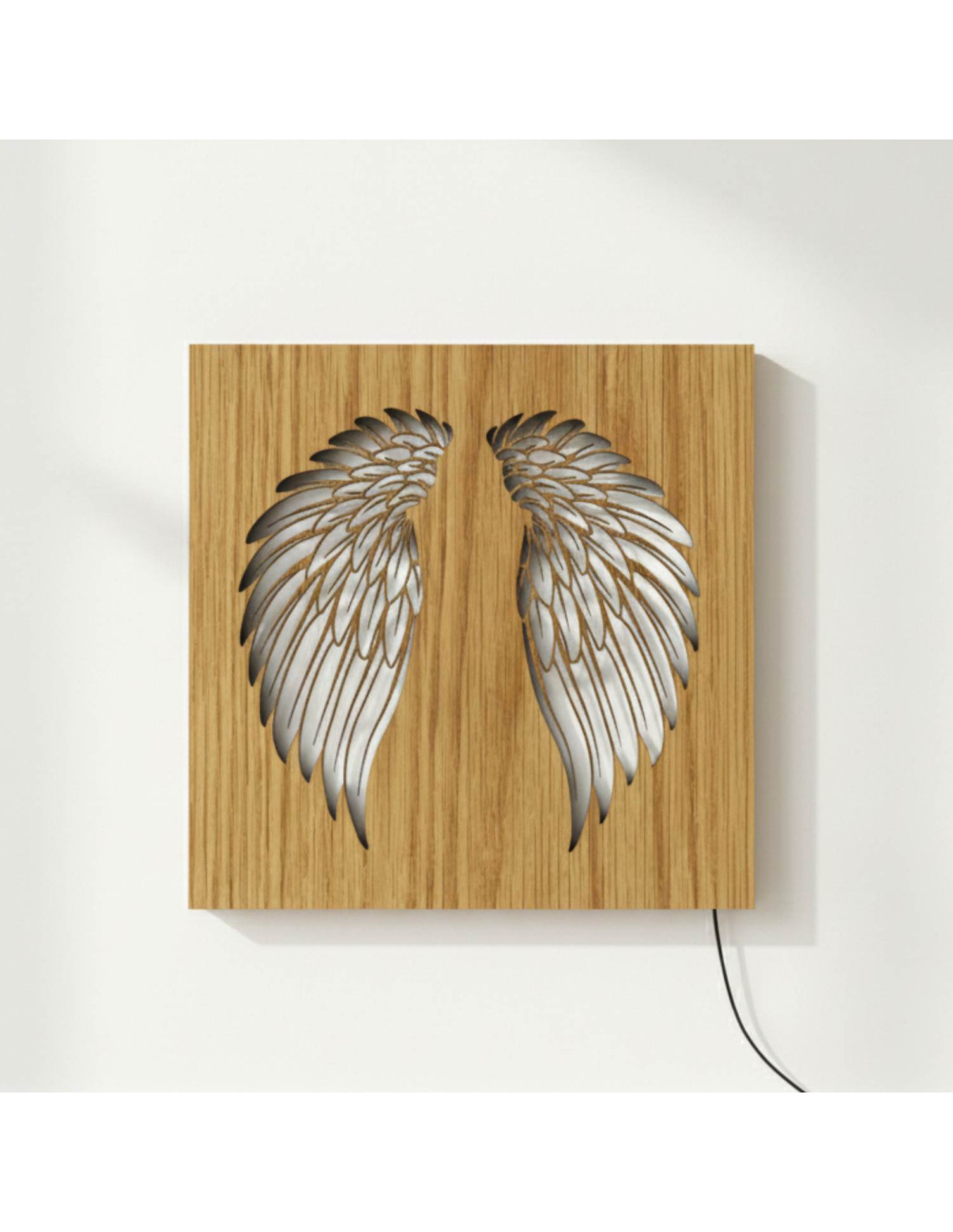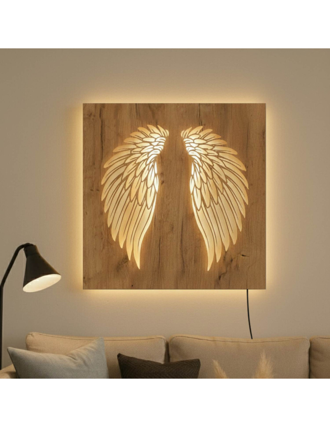 Az eredeti , háttérvilágítással ellátott, fából készült festmény – angyalszárnyak – a fa természetes szépségét, a modern dizájnt és a finom LED-világítást ötvözi egy egyedi műalkotásban. Ez az elegáns darab békét, fényt és harmóniát hoz a térbe, otthonossá varázsolva minden belső teret – a nappaliktól és hálószobáktól kezdve a reprezentatív irodákig .