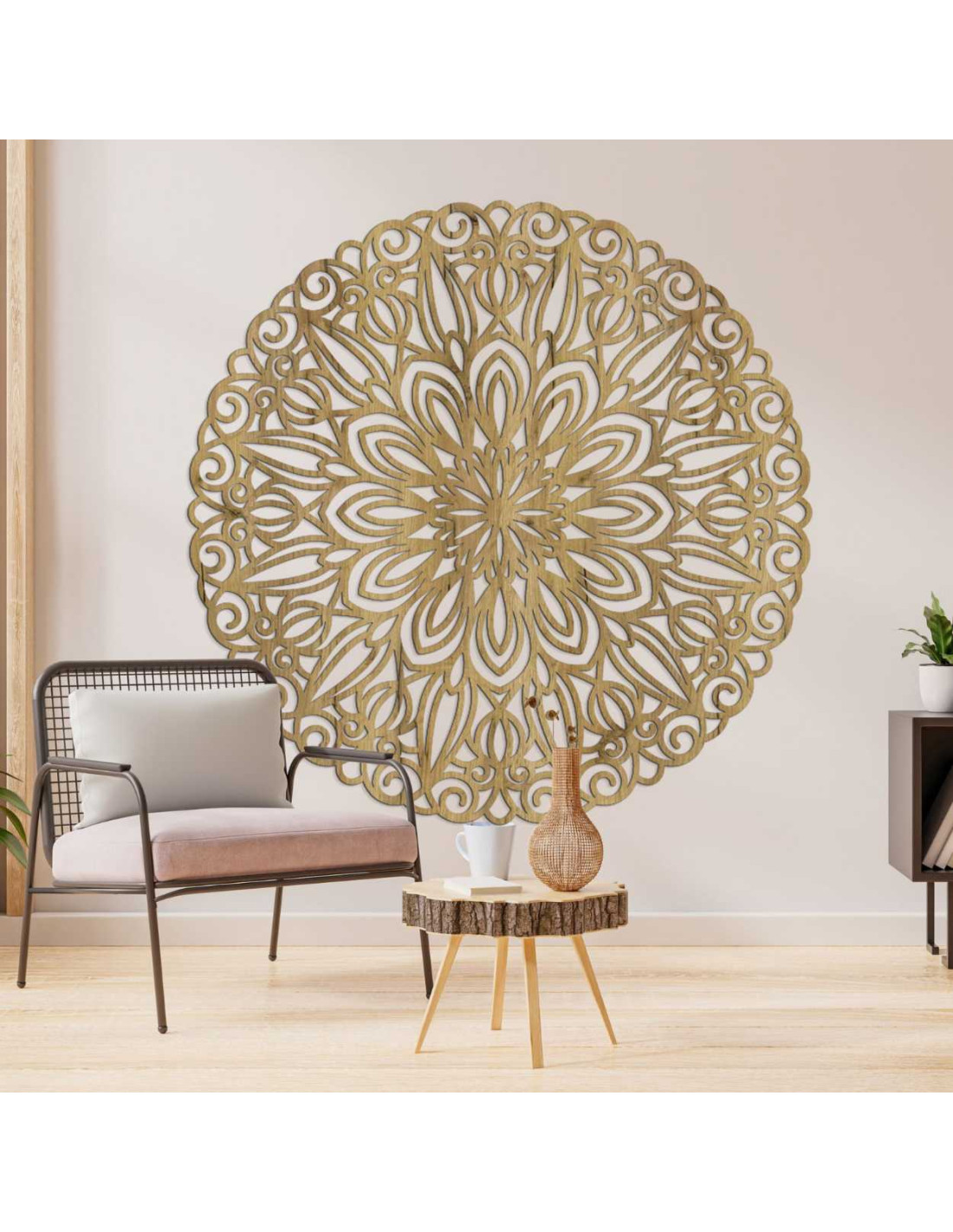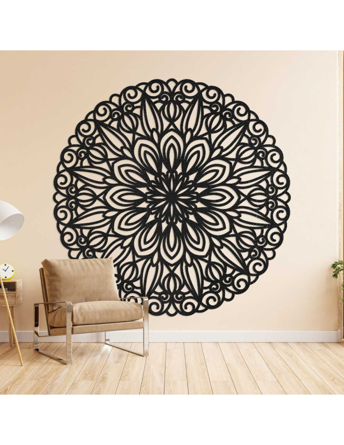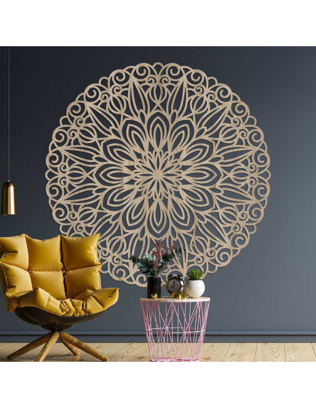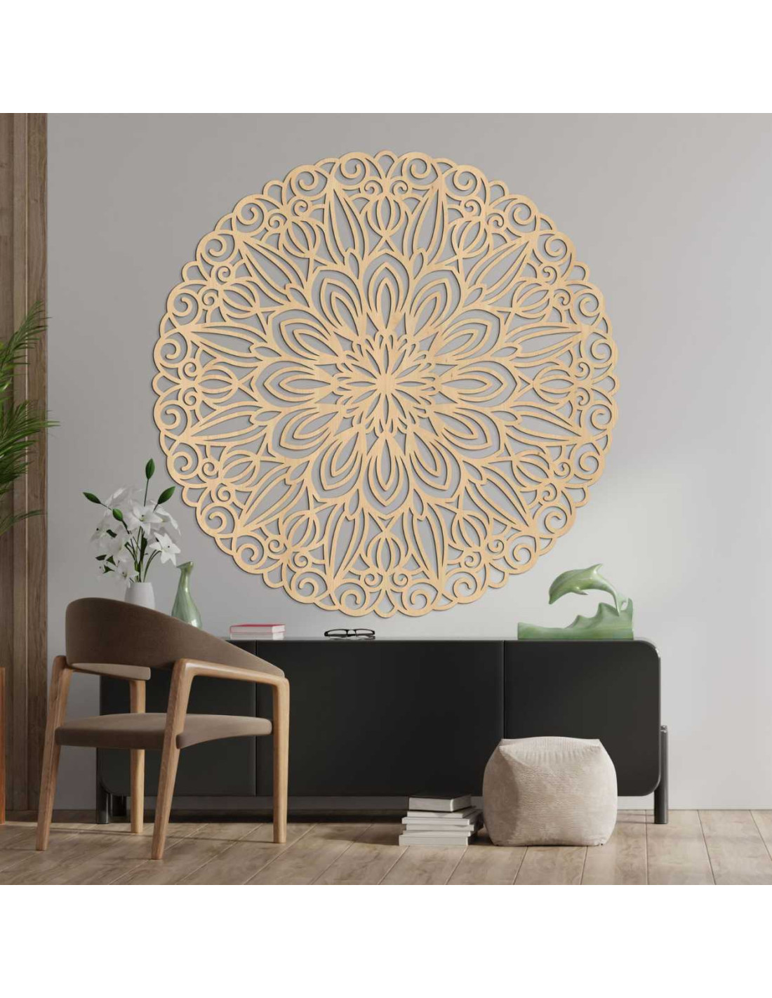 A dekoráció ötvözi a geometria szépségét és a hagyományos díszítések eleganciáját. Kifinomult kialakításával eleganciát és eredetiséget kölcsönöz a térnek. Az elemek kiegyensúlyozott eloszlása természetesen a középpontba vezeti a tekintetet, kellemes vizuális élményt nyújtva.