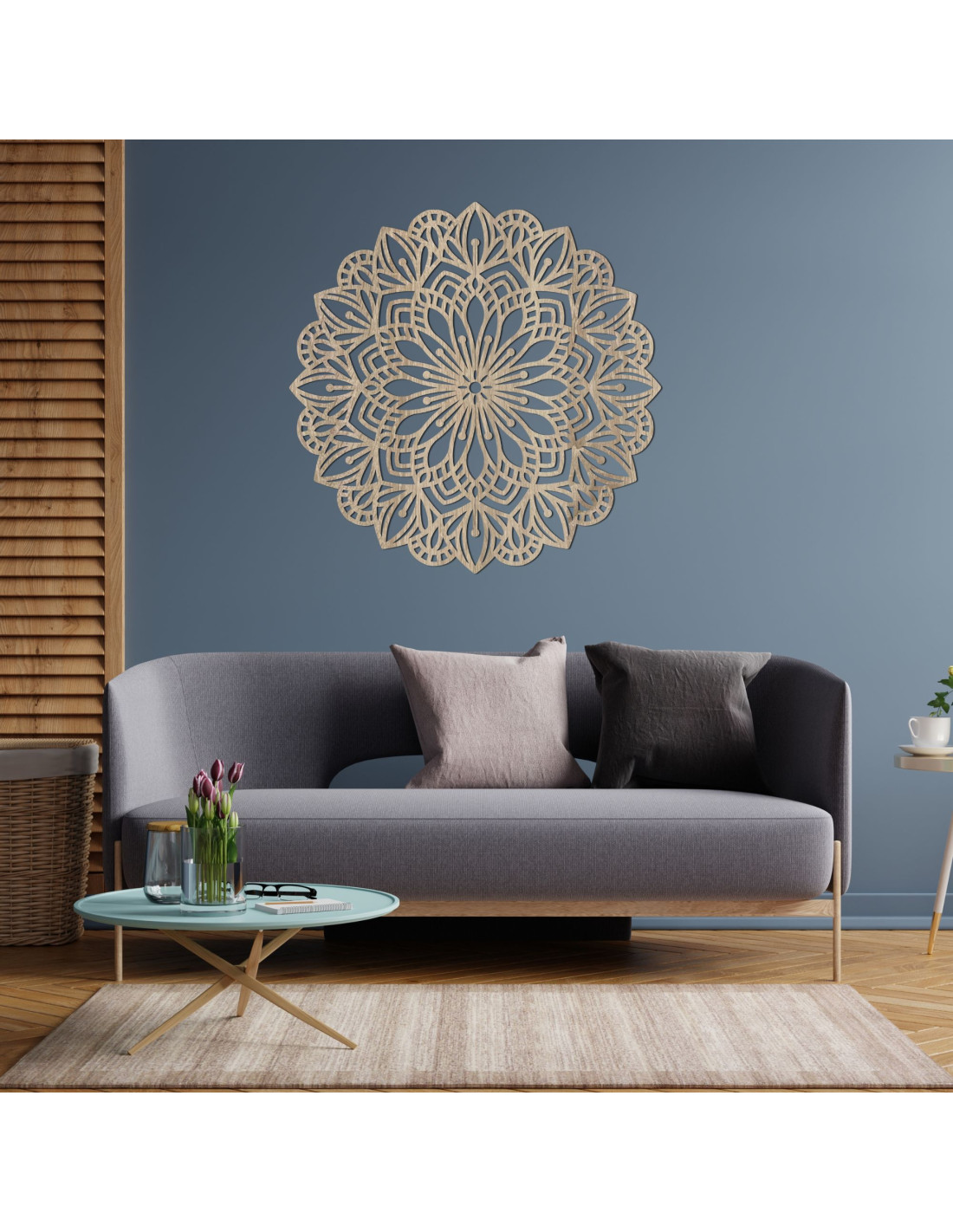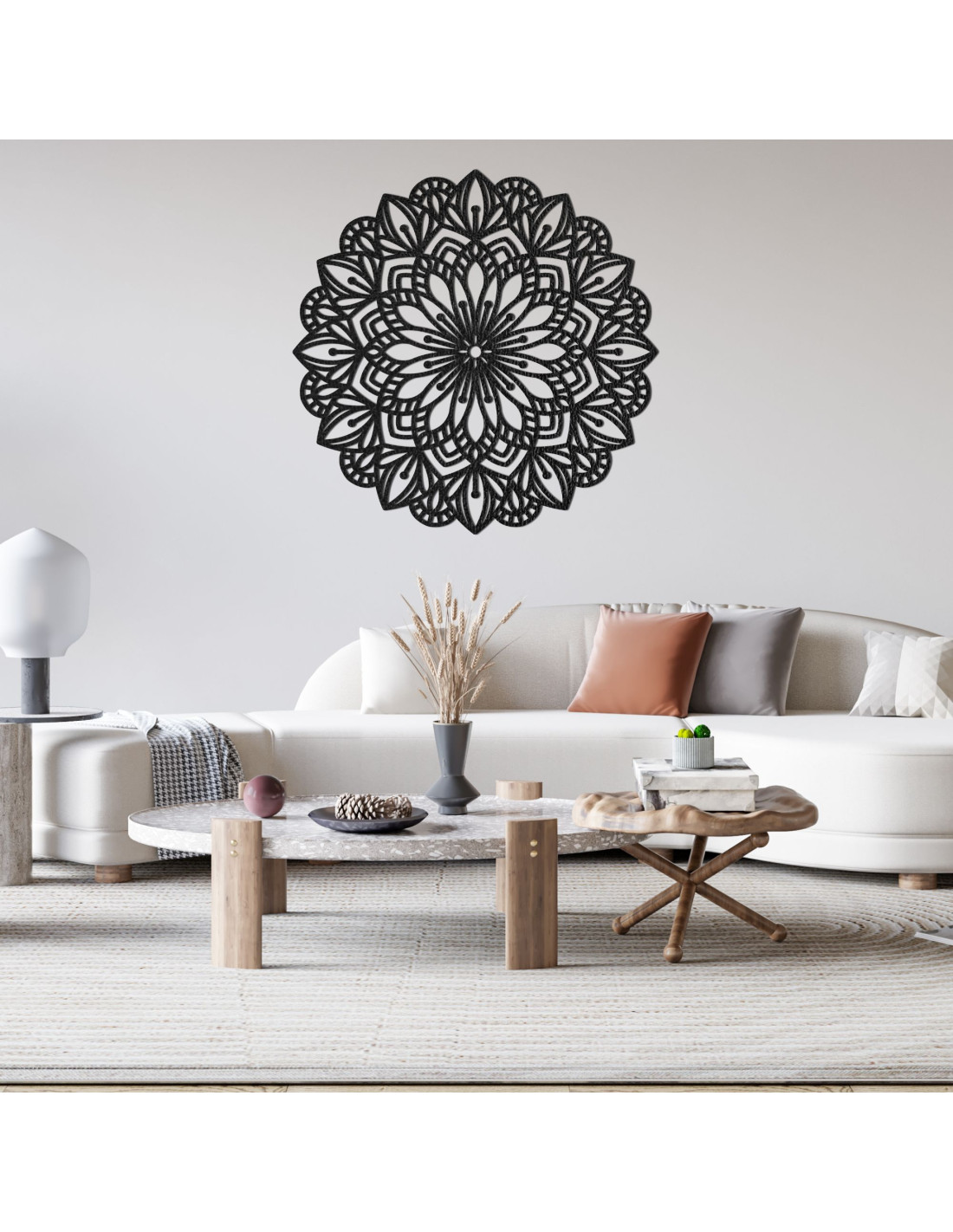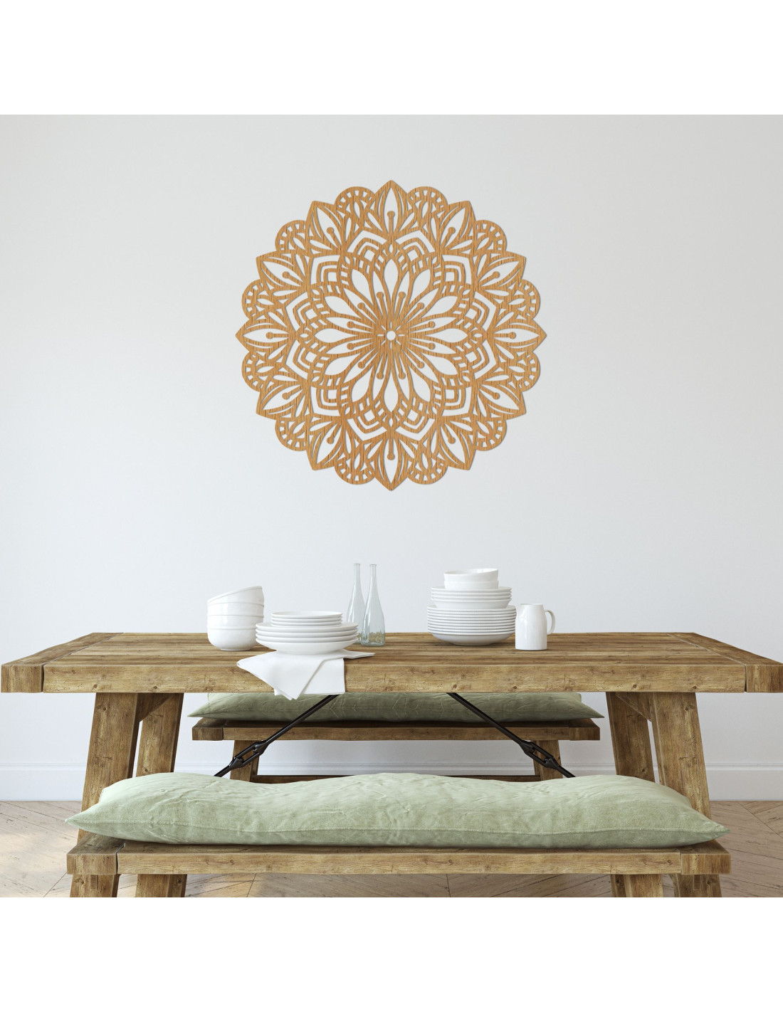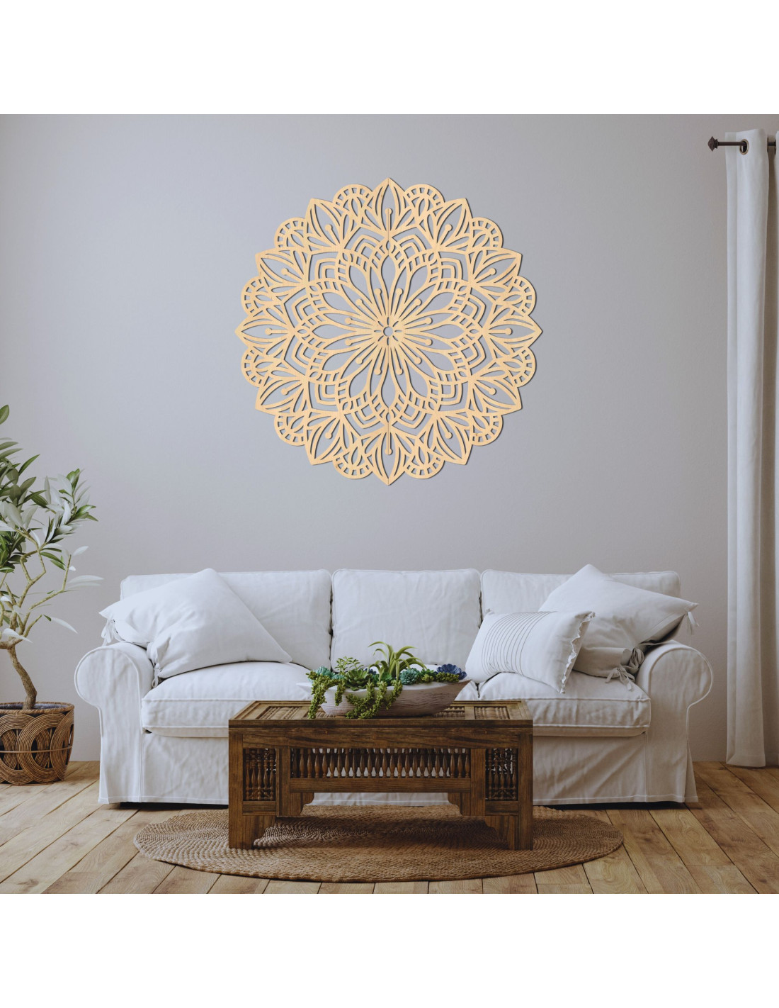 A bonyolultan faragott minta természetes vonalakat és finom szimbolikát kölcsönöz, így a mandala a béke, az egyensúly és a szépség elbűvölő eleme a belső térben. Ez egy olyan dekoráció, amely bármilyen teret otthonossá tesz , és eredeti, energikus és modern jelleget kölcsönöz neki.