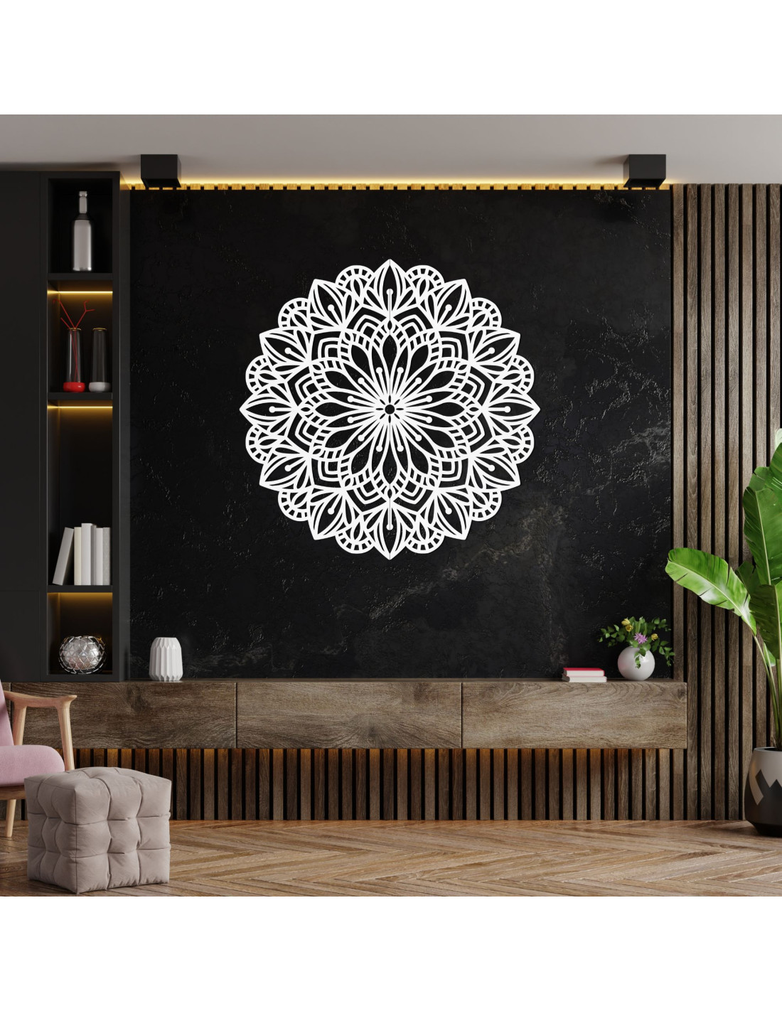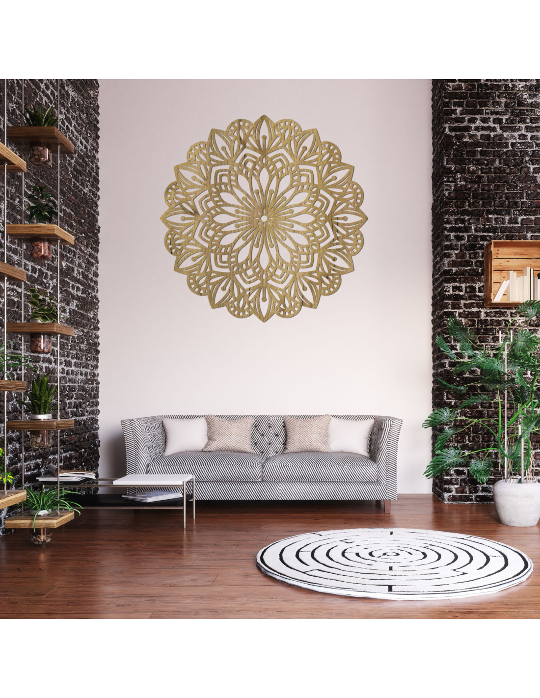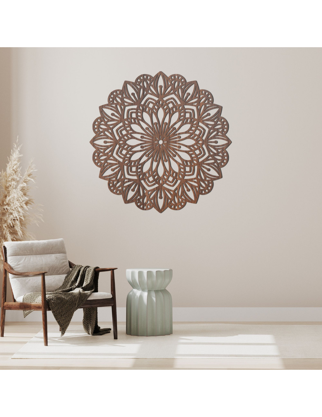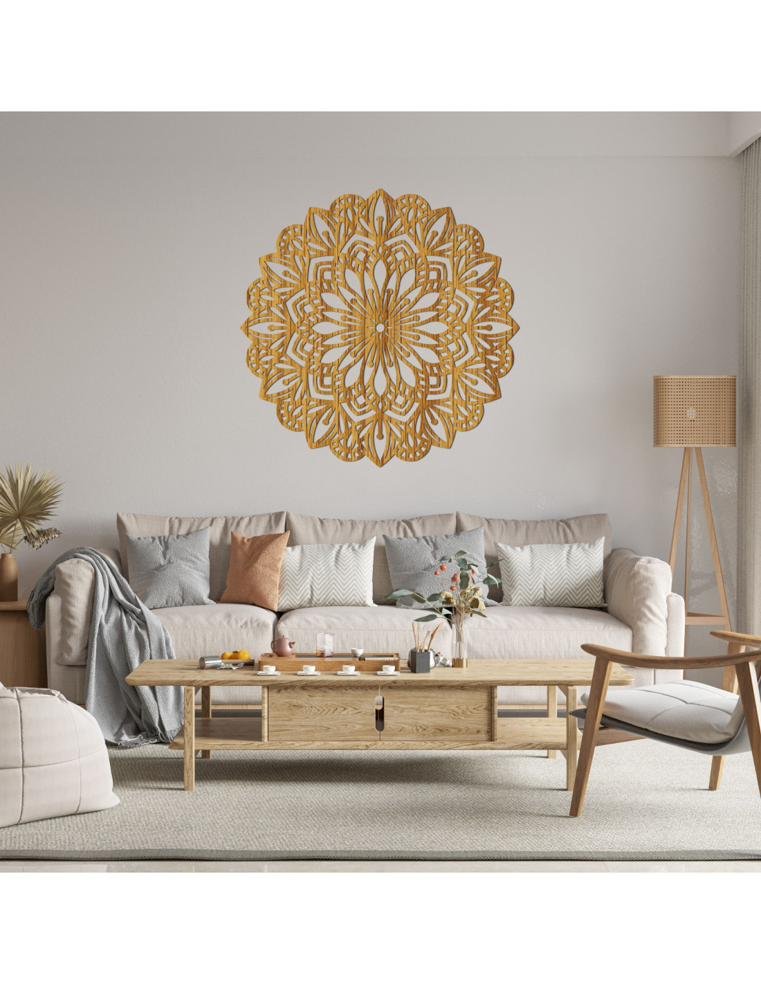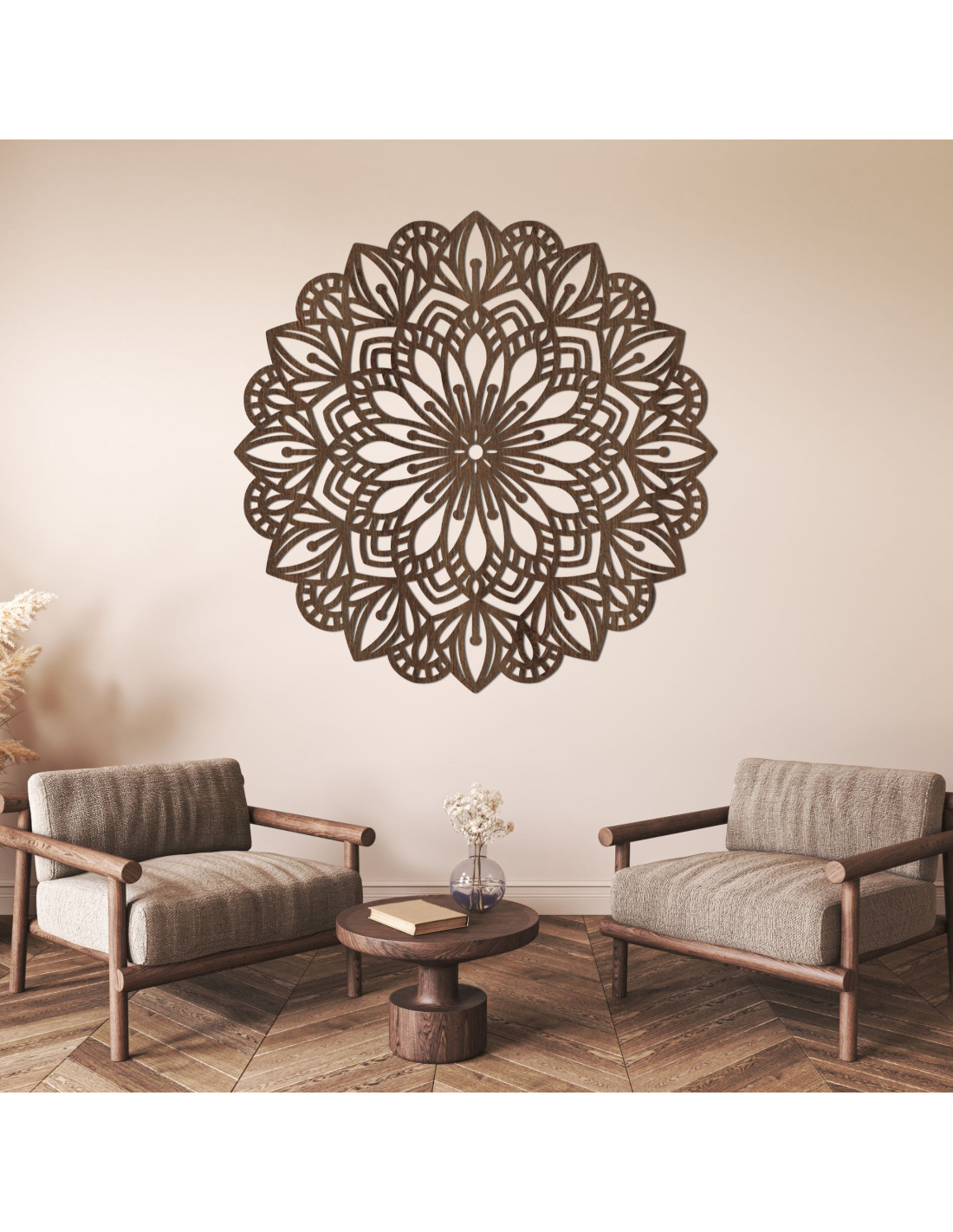 A bonyolultan faragott minta természetes vonalakat és finom szimbolikát kölcsönöz, így a mandala a béke, az egyensúly és a szépség elbűvölő eleme a belső térben. Ez egy olyan dekoráció, amely bármilyen teret otthonossá tesz , és eredeti, energikus és modern jelleget kölcsönöz neki.