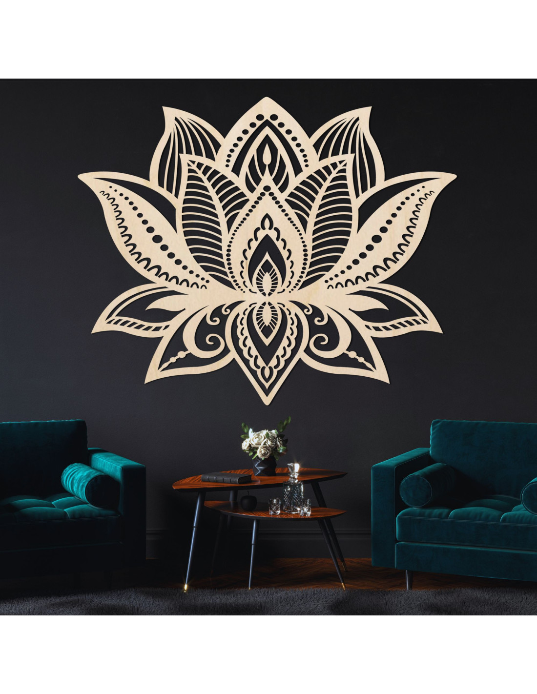 A lótuszvirág szimmetriája az új kezdetet, a tisztaságot és a belső erőt szimbolizálja, míg a gondosan faragott részletek egyedi textúrát és a fa meleg hangulatát viszik bármely helyiségbe.