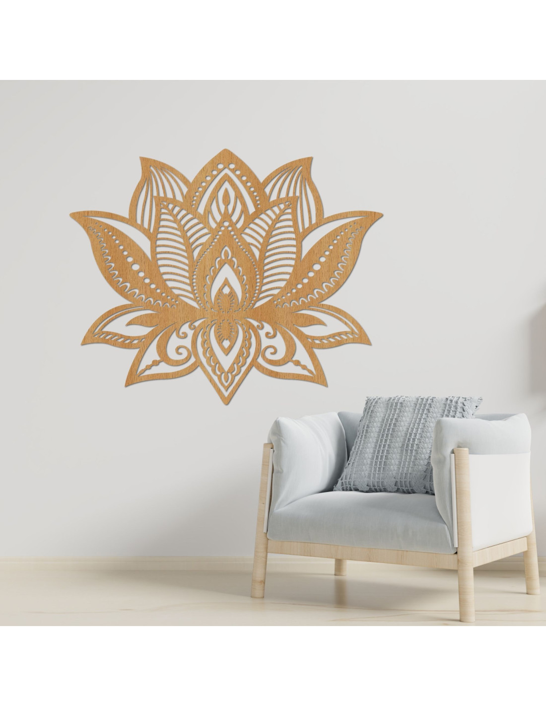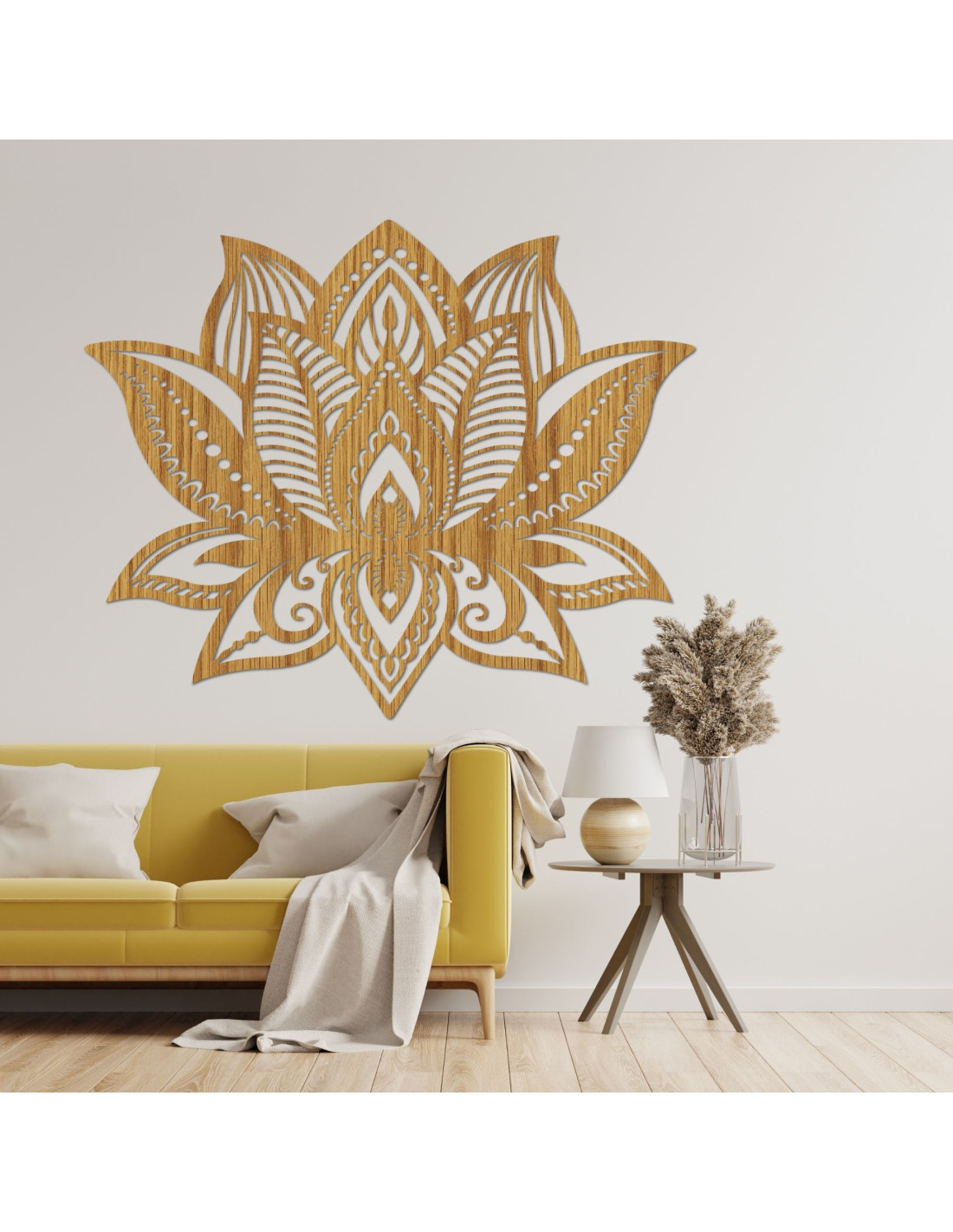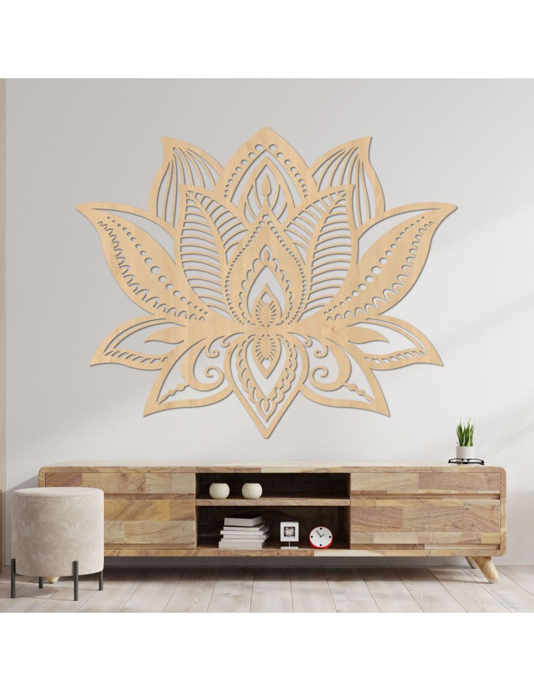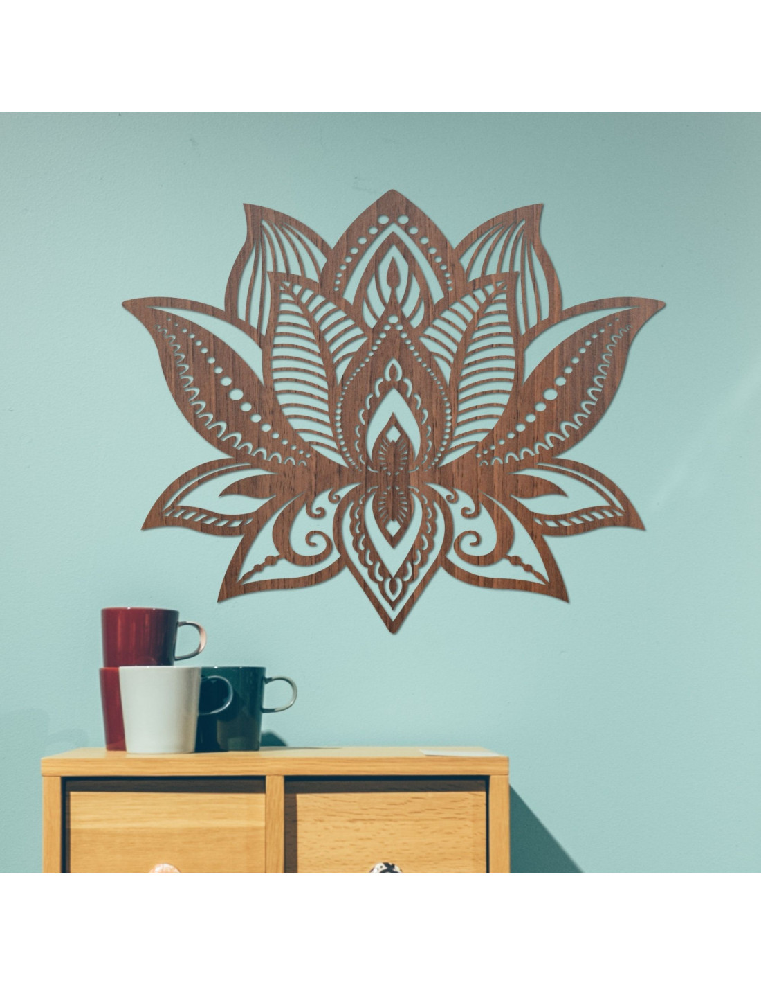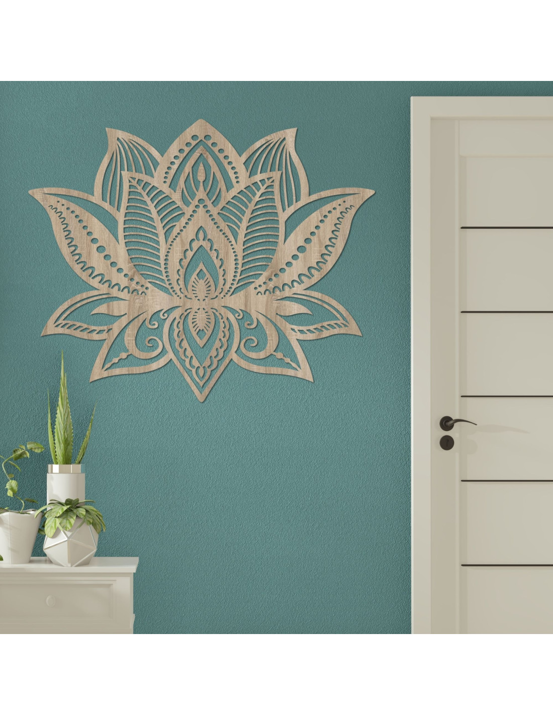 A fából készült lótuszvirág-dísz az esztétikai eleganciát a spirituális mélységgel ötvözi.