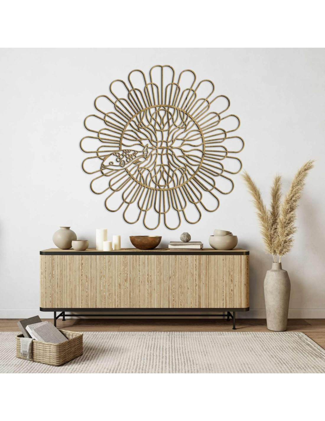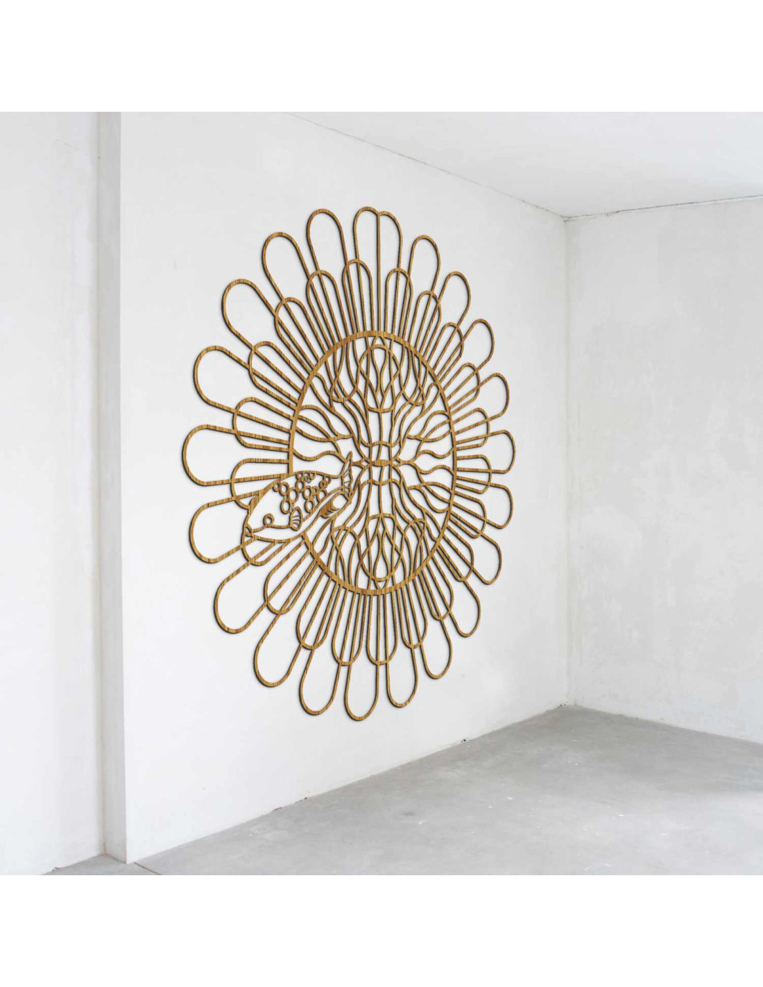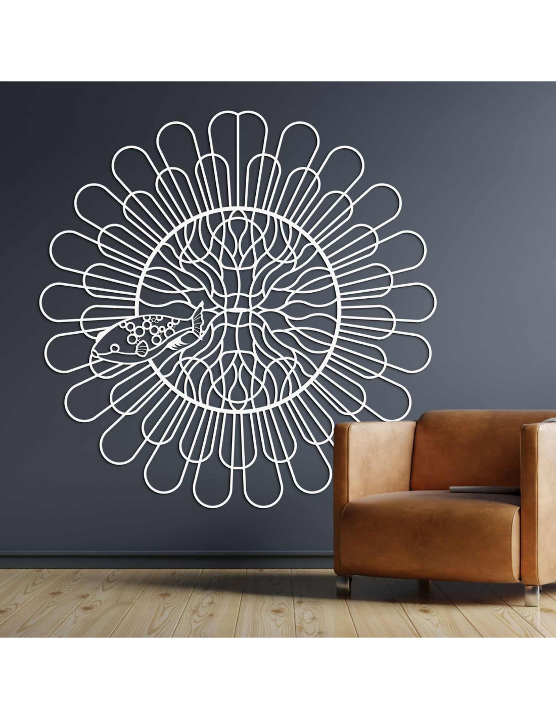 Fekete fa mandala halakkal egy fehér falon egy modern lakásban