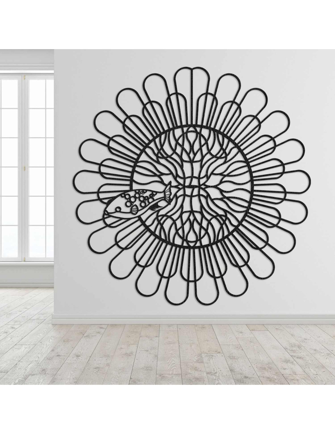 Fekete HDF lapból faragott, négyfogú halas mandala 3D-s képe