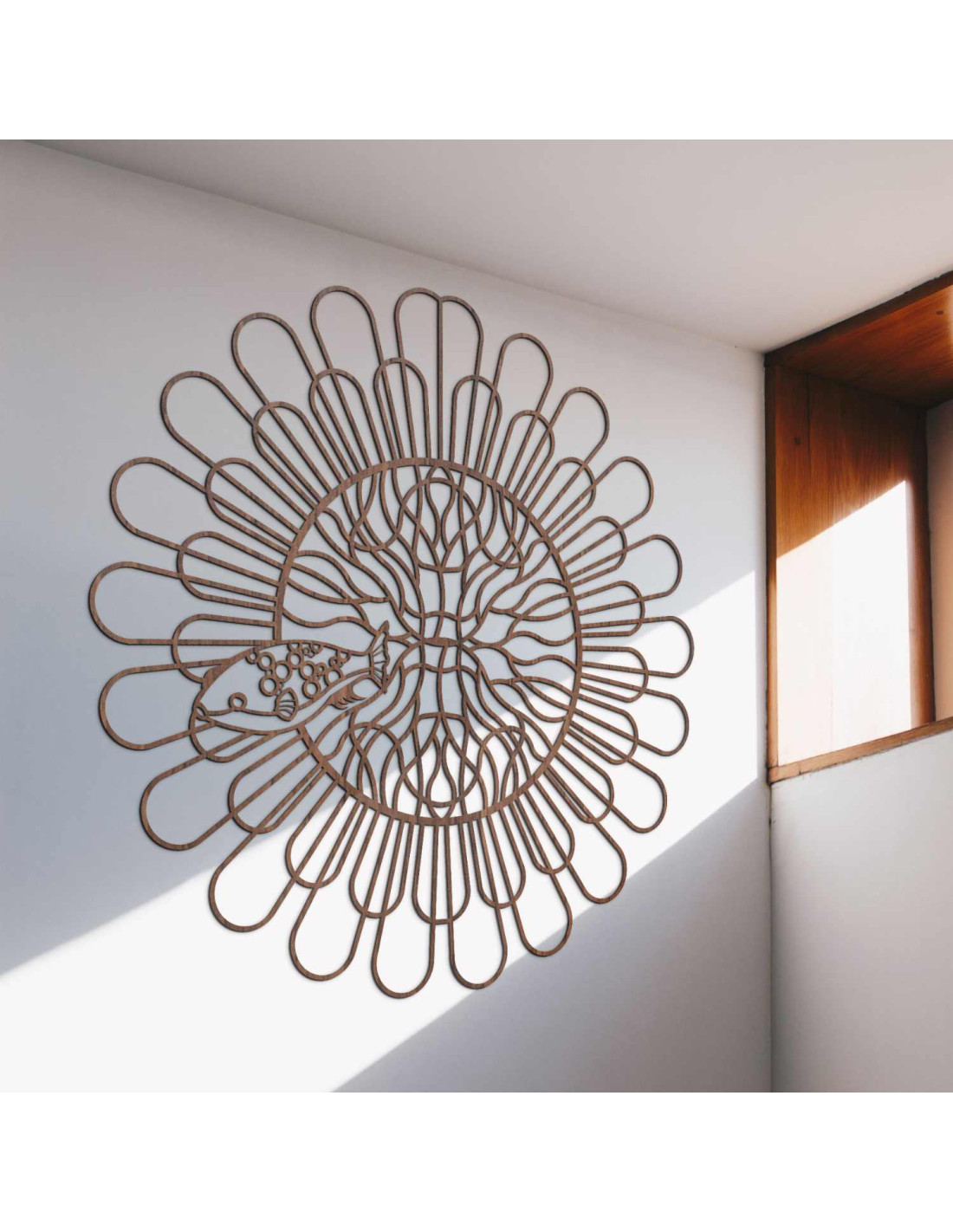 Fekete fa mandala halakkal egy fehér falon egy modern lakásban