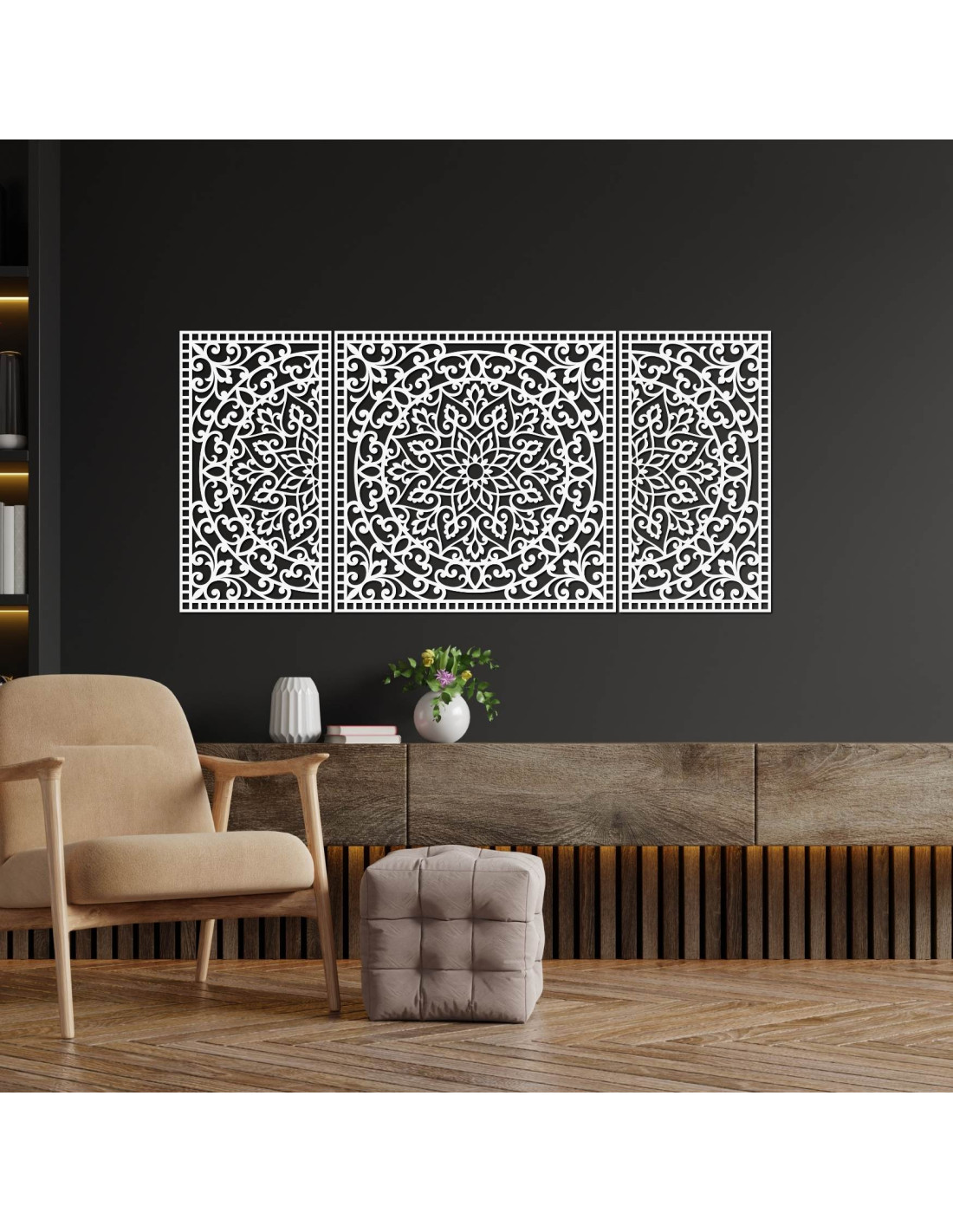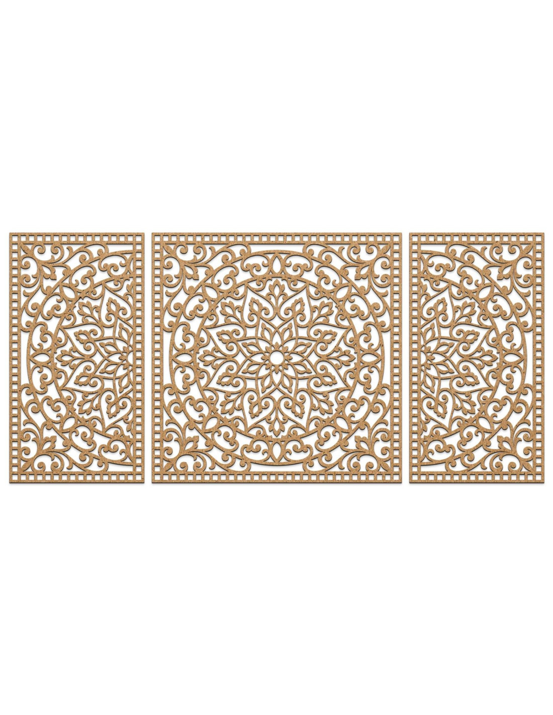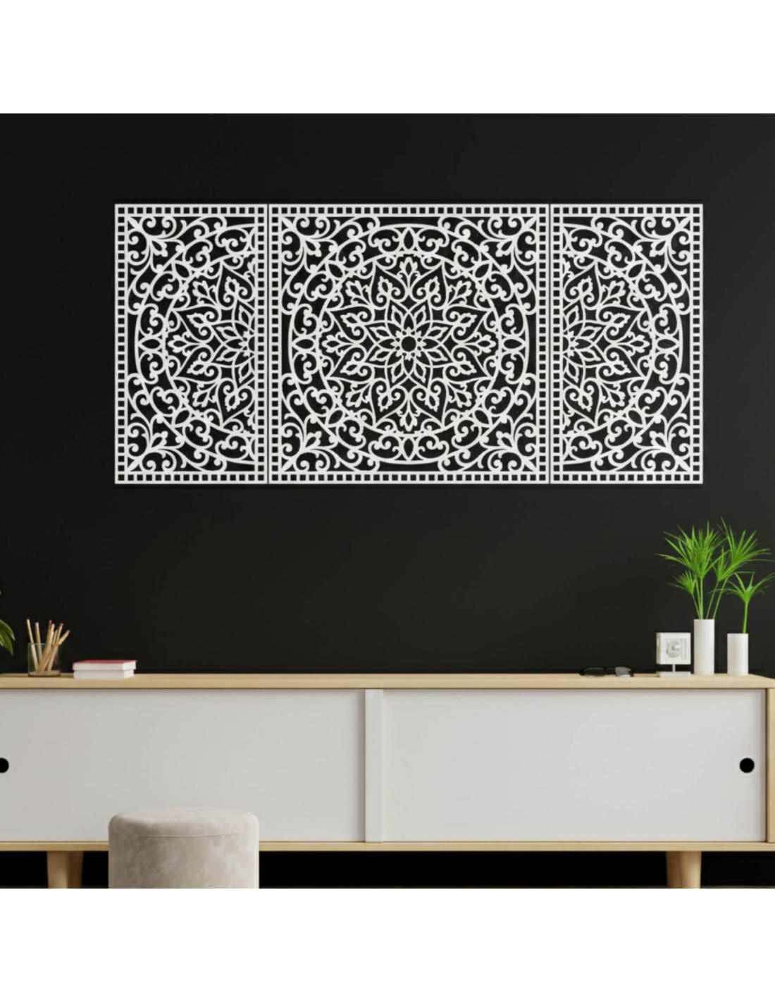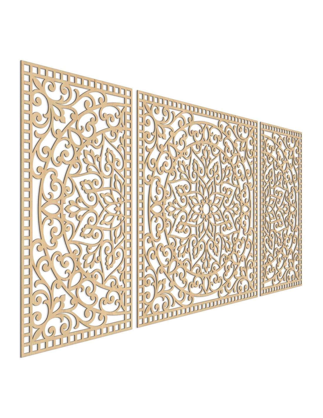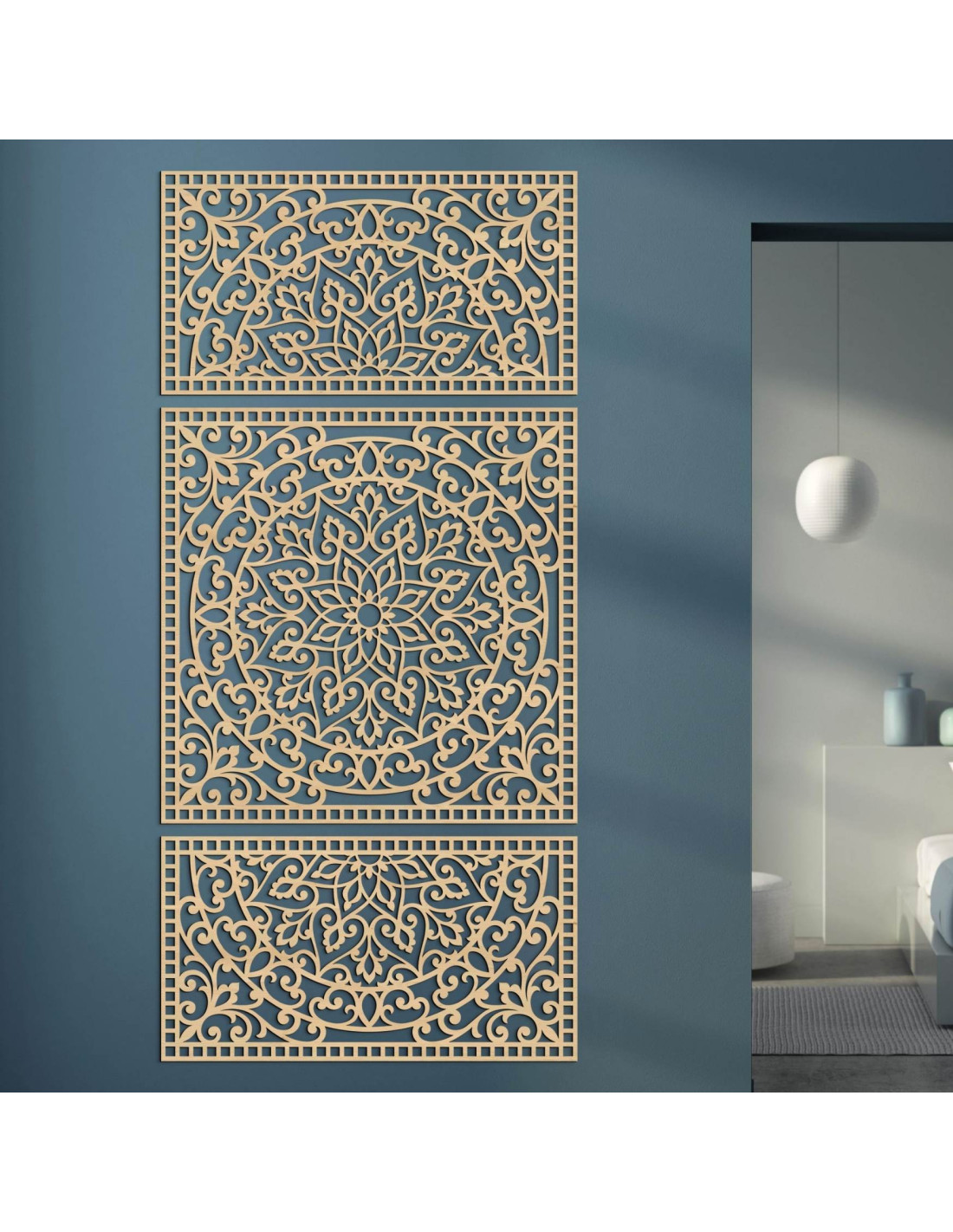 Ez az elegáns, háromrészes mandala a hagyományos díszítő mintákat modern stílussal ötvözi. Minden darab precízen kivágott HDF lapból, így biztosítva az éles és jellegzetes részleteket.