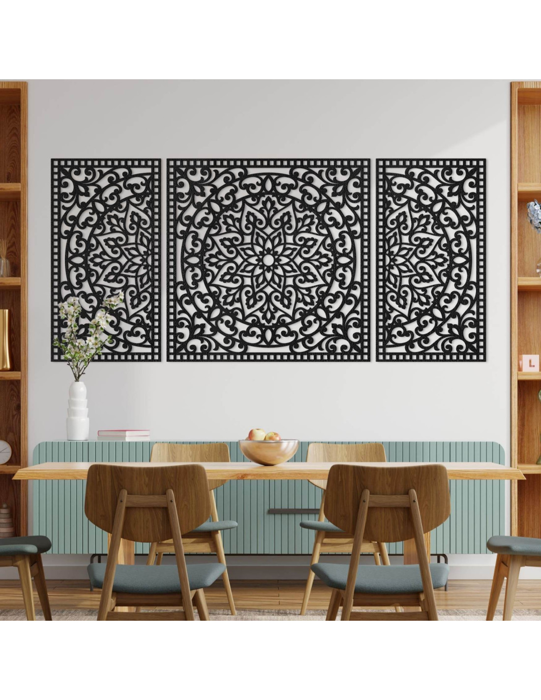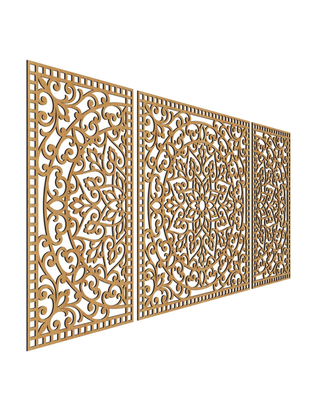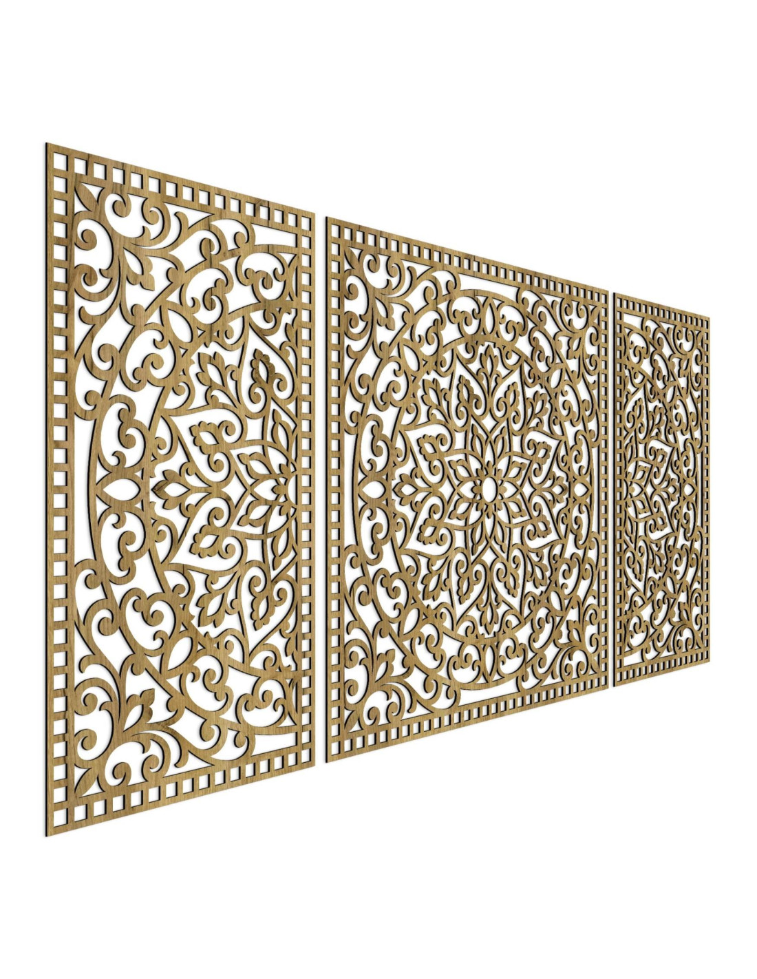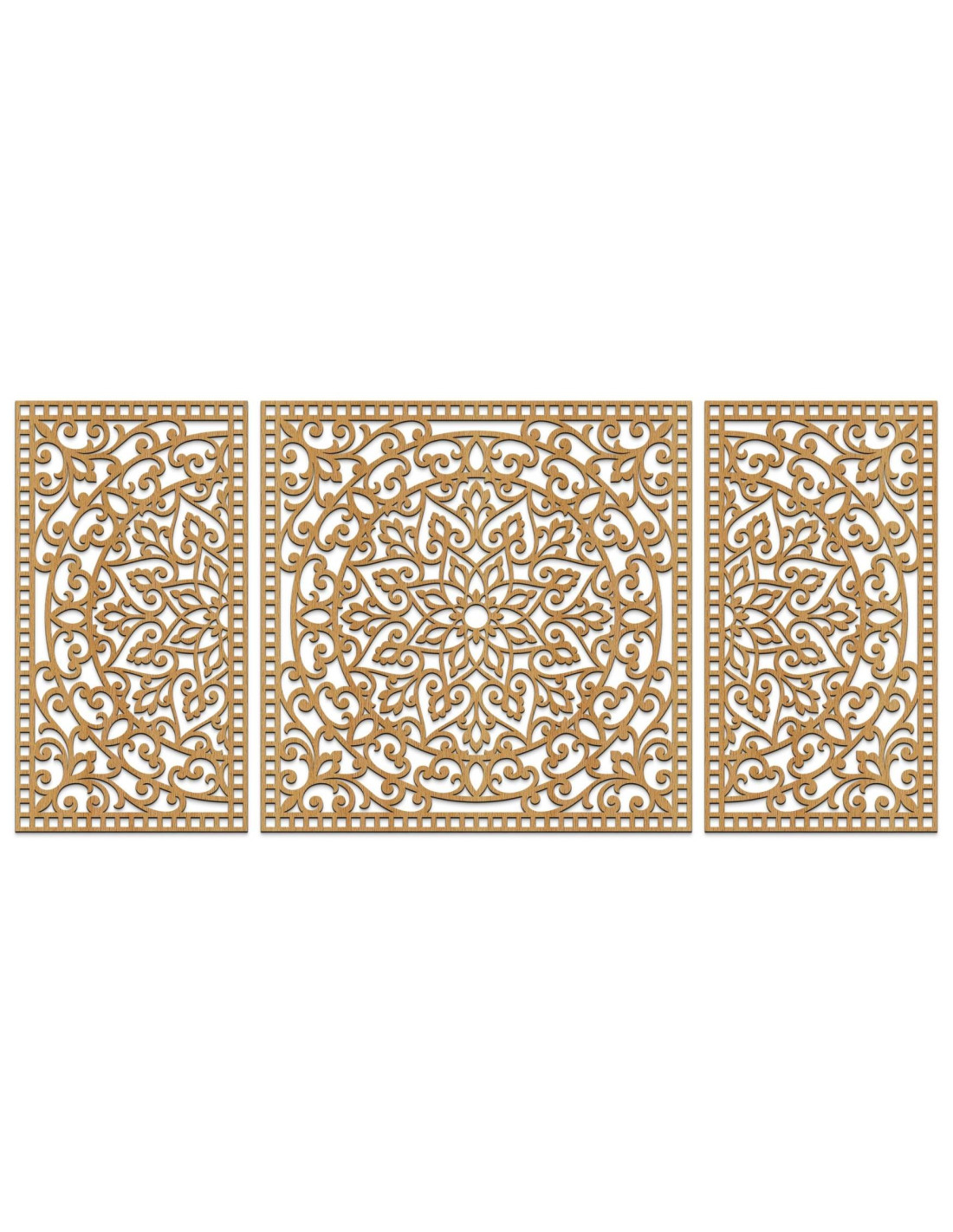 Ez az elegáns, háromrészes mandala a hagyományos díszítő mintákat modern stílussal ötvözi. Minden darab precízen kivágott HDF lapból, így biztosítva az éles és jellegzetes részleteket.