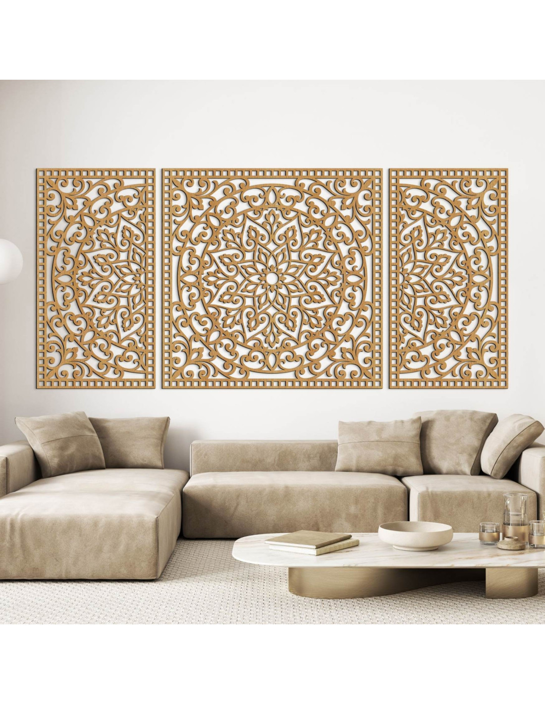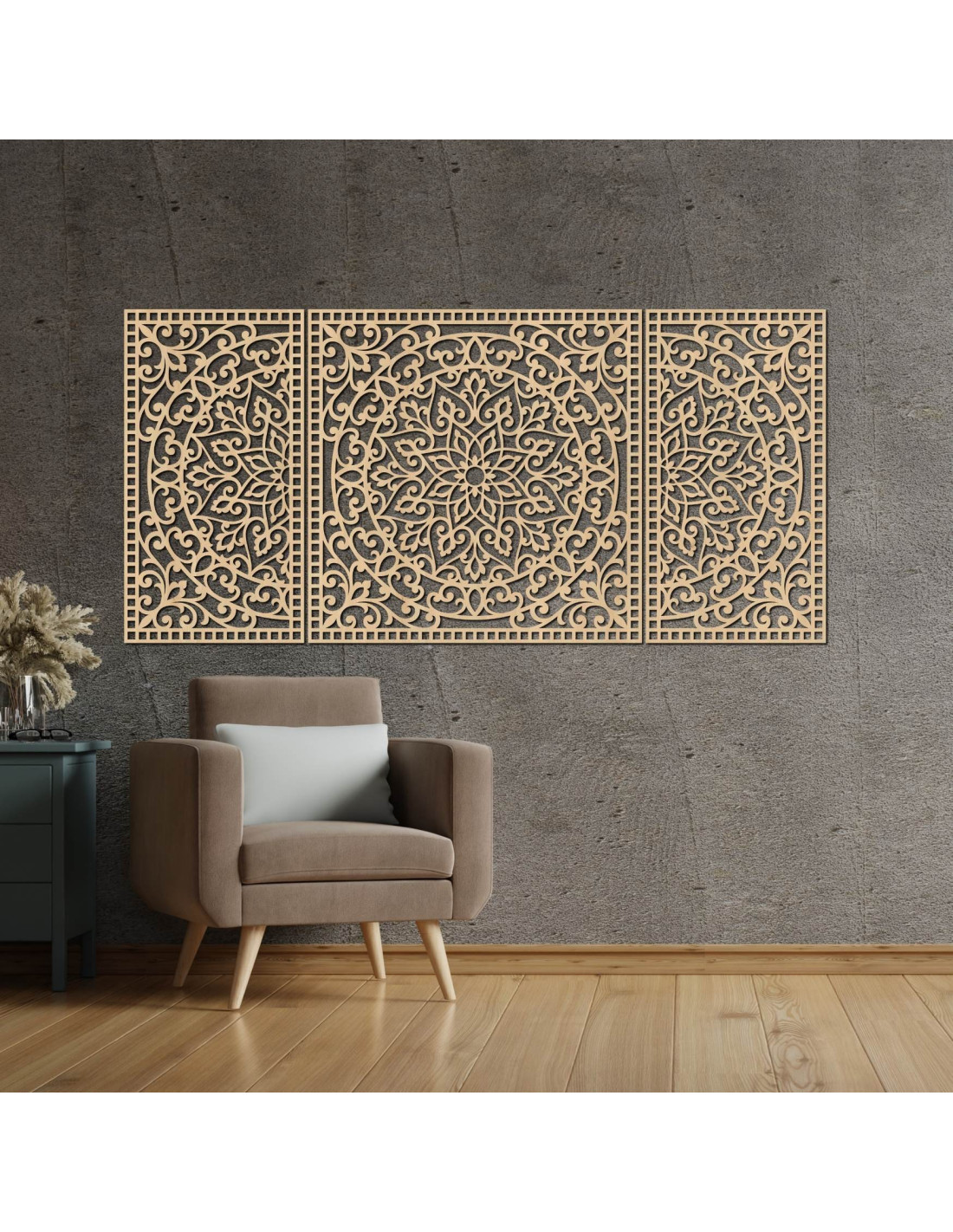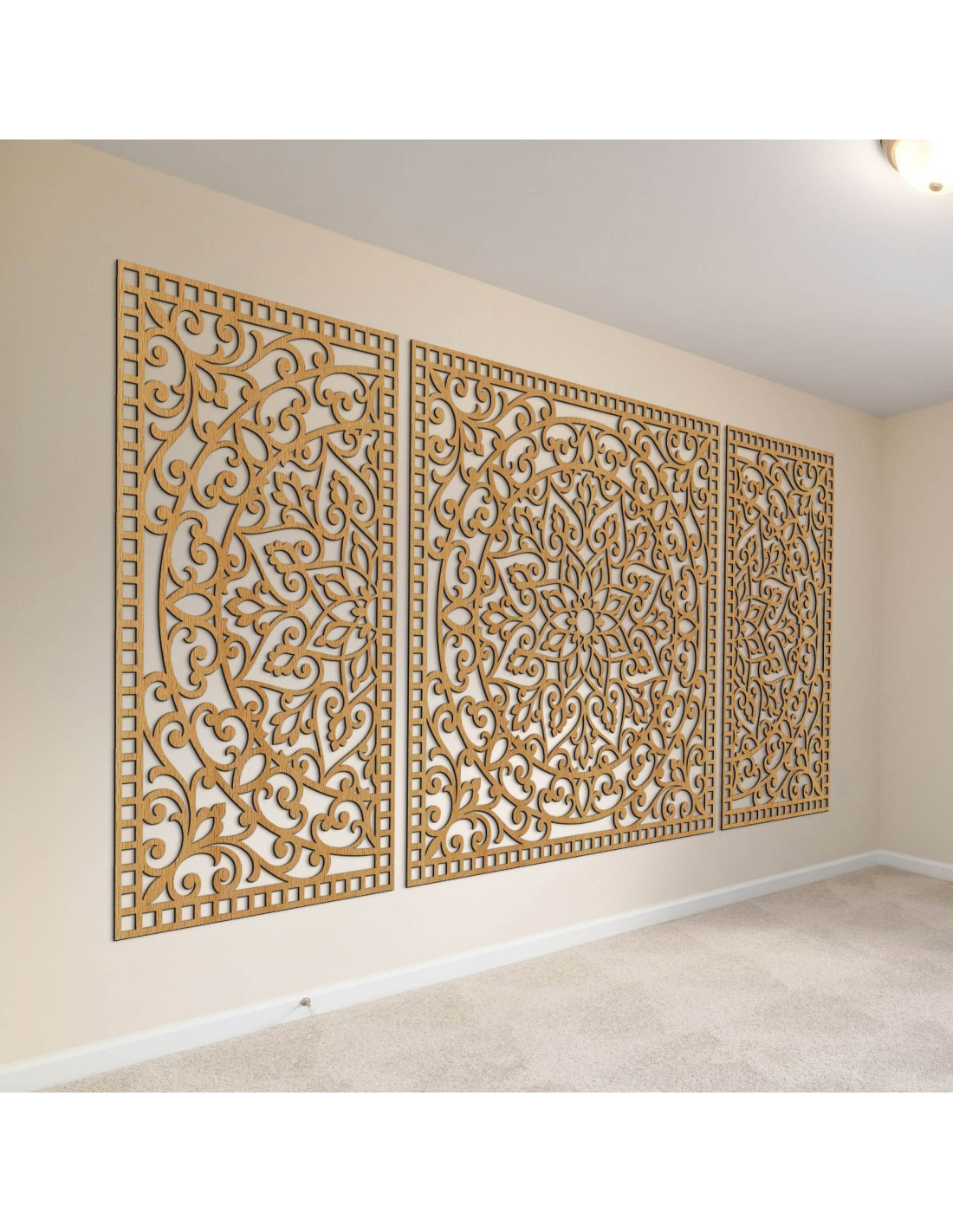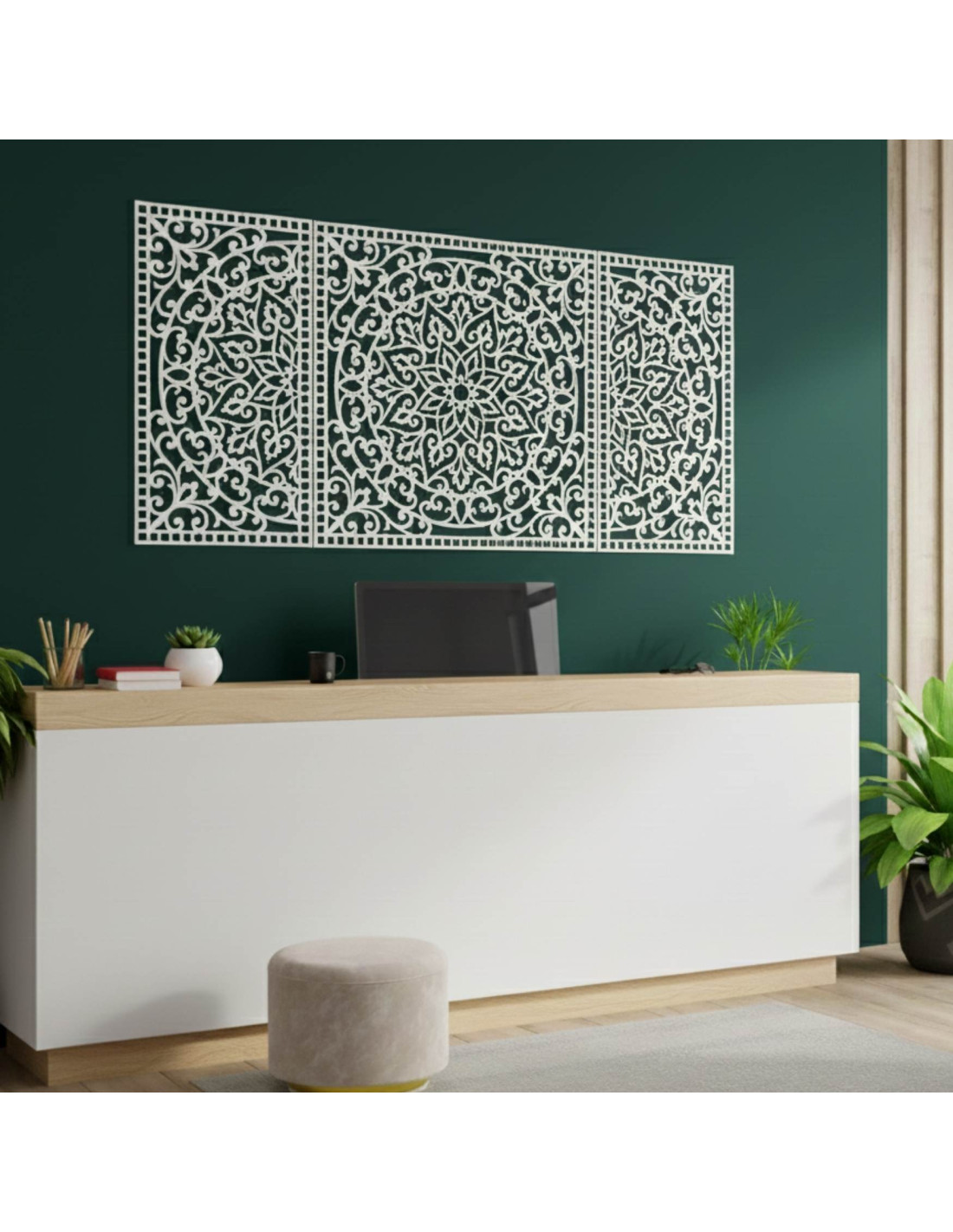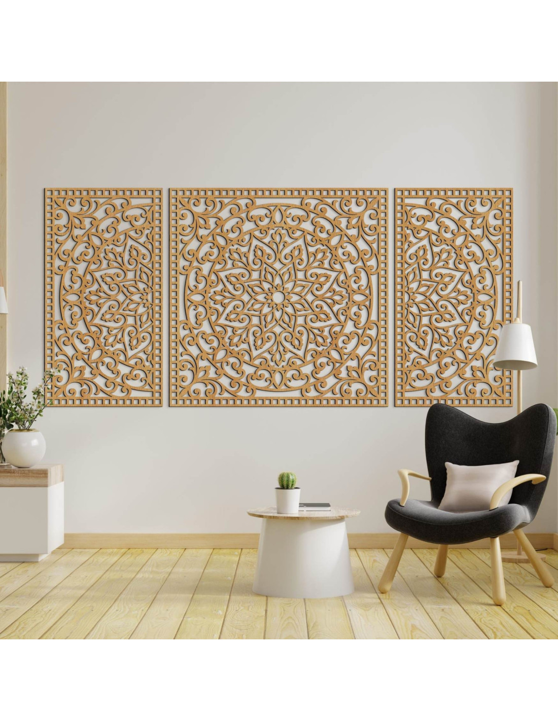 Ez az elegáns, háromrészes mandala a hagyományos díszítő mintákat modern stílussal ötvözi. Minden darab precízen kivágott HDF lapból, így biztosítva az éles és jellegzetes részleteket.