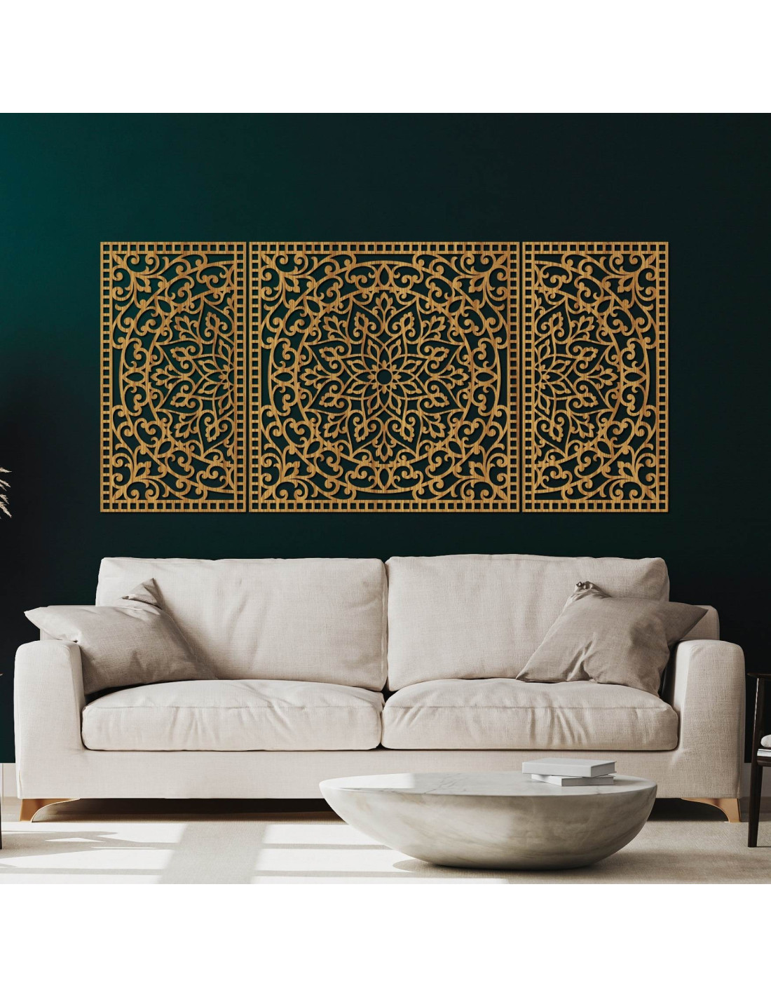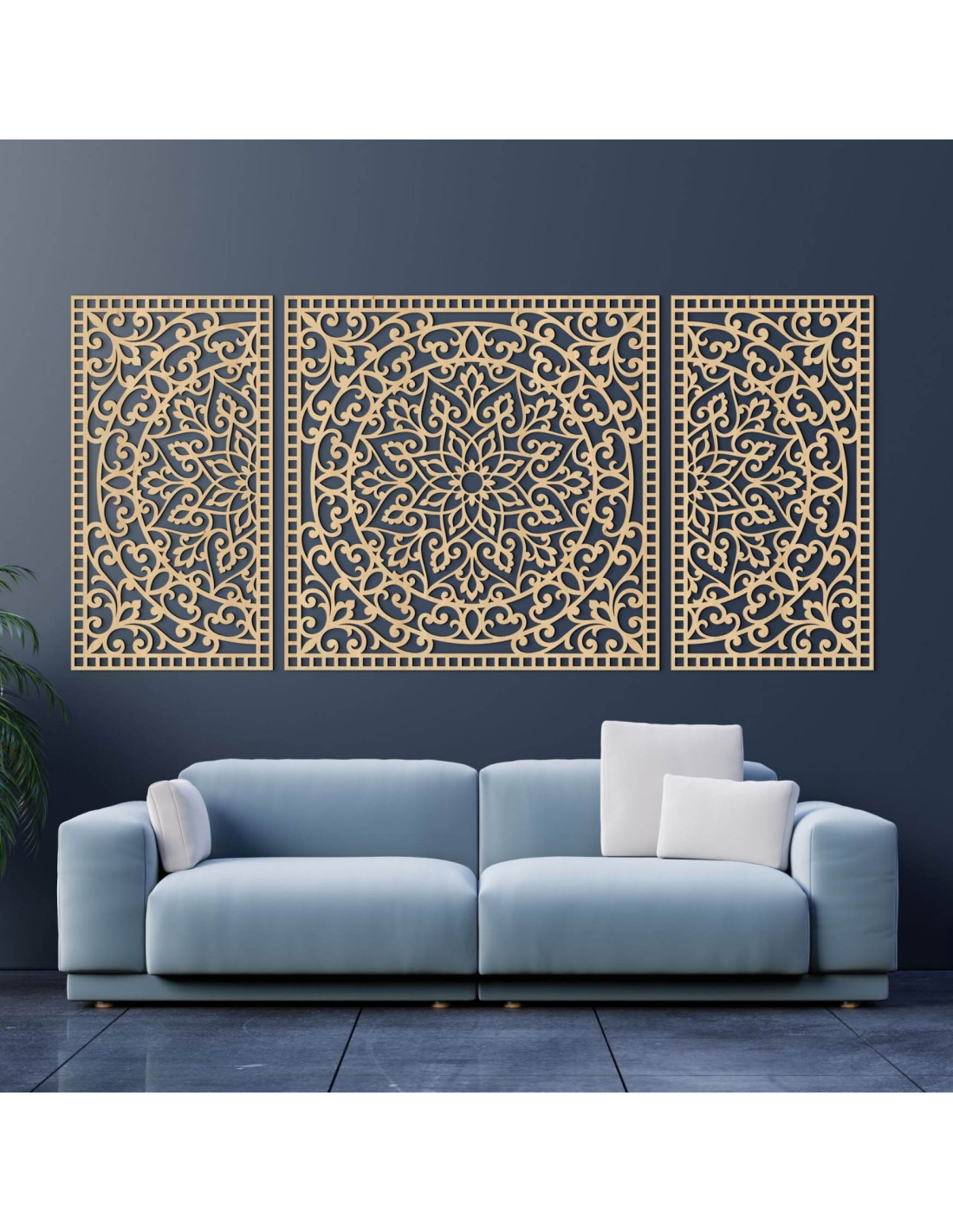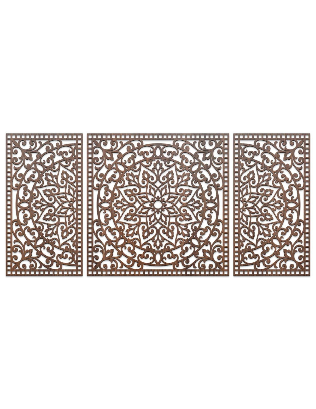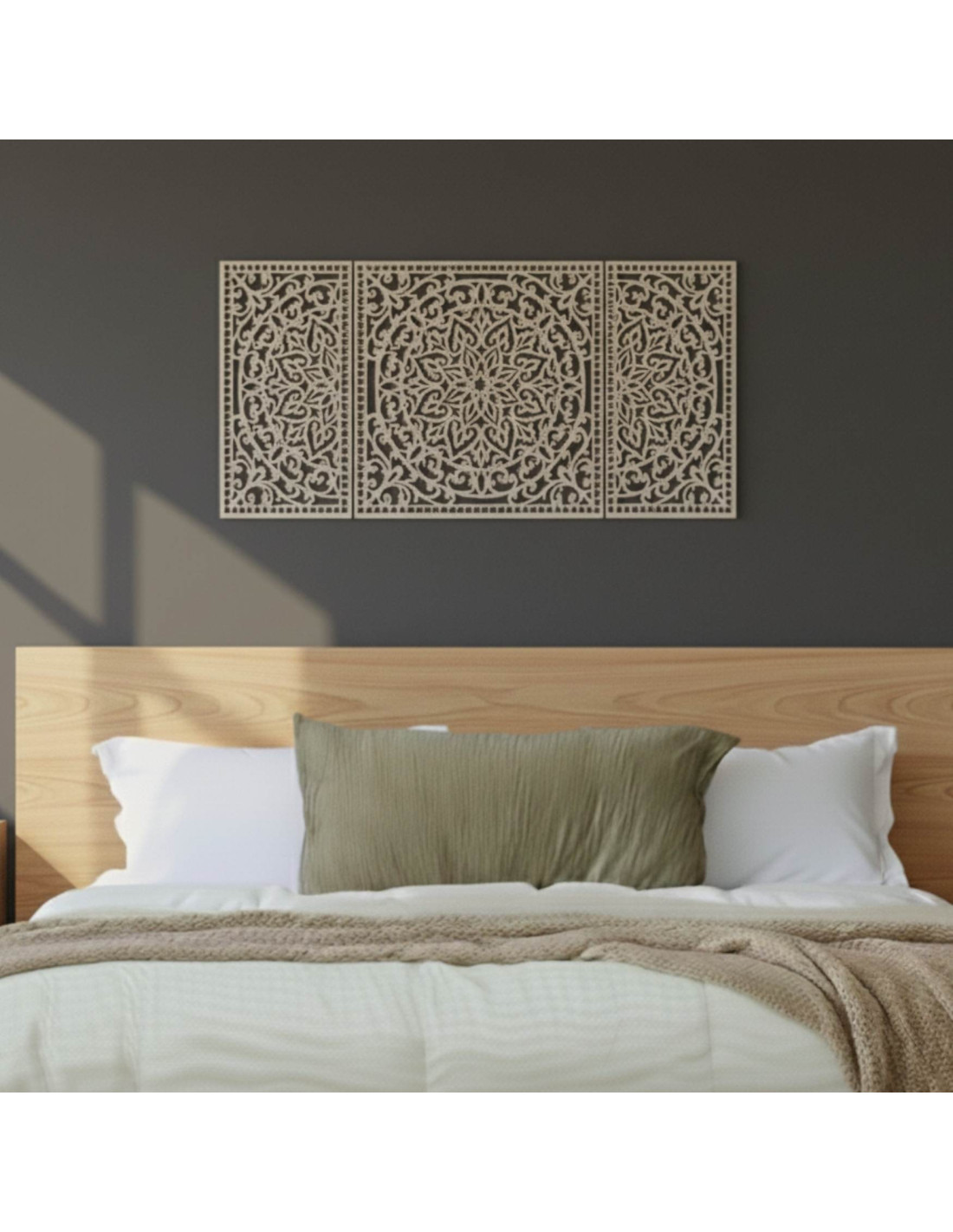 Ez az elegáns, háromrészes mandala a hagyományos díszítő mintákat modern stílussal ötvözi. Minden darab precízen kivágott HDF lapból, így biztosítva az éles és jellegzetes részleteket.