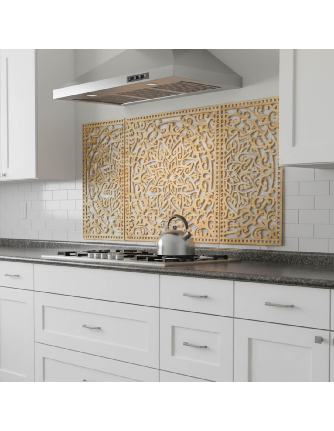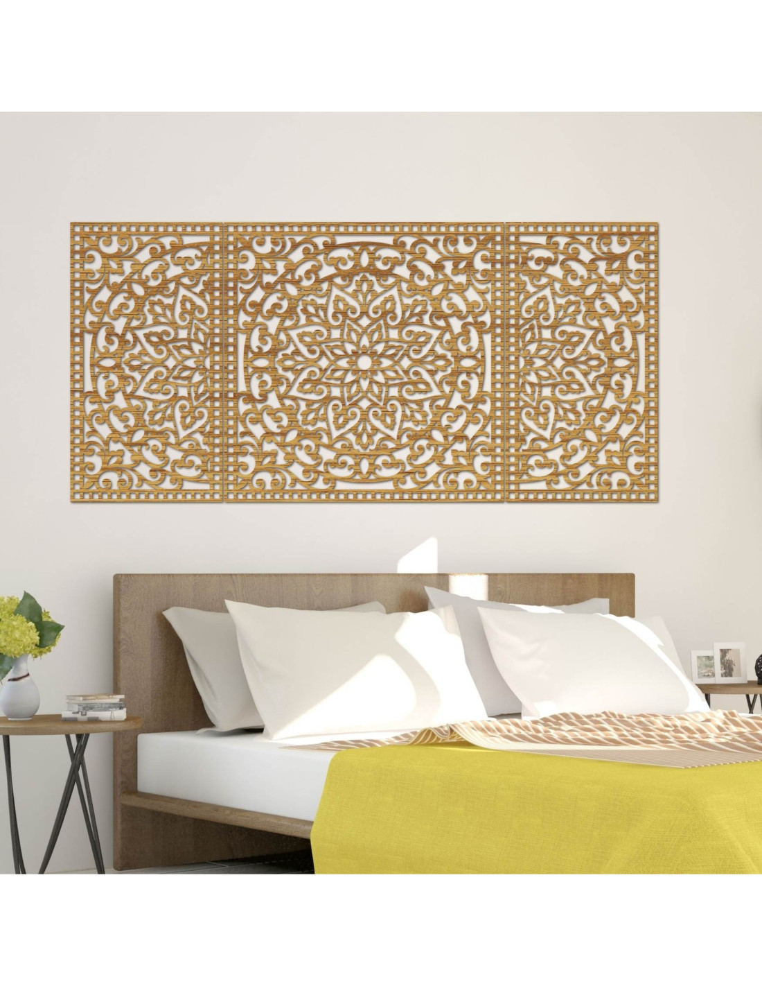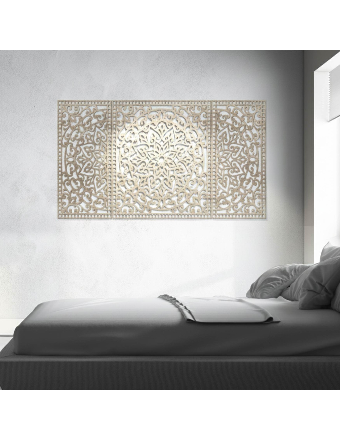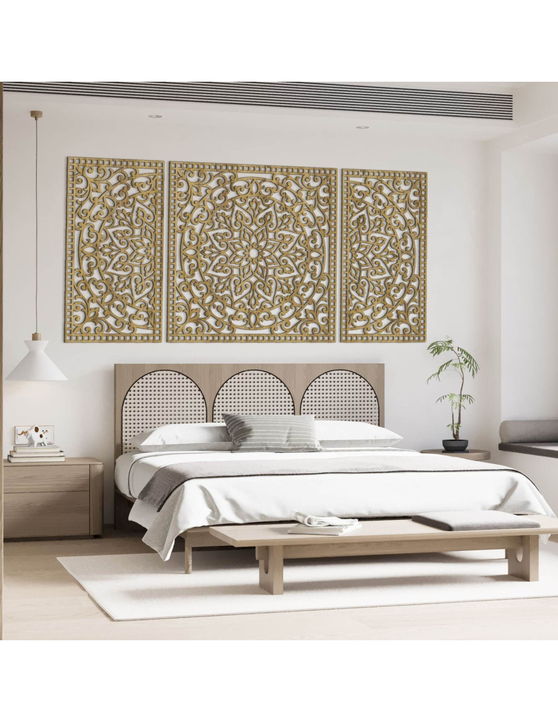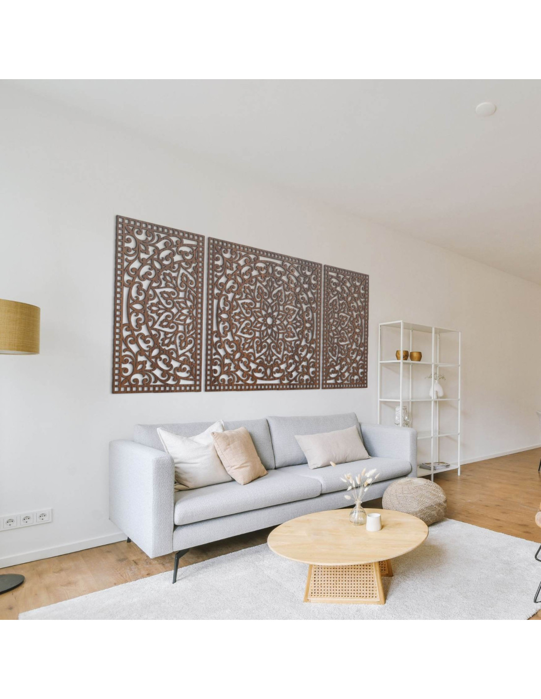 Ez az elegáns, háromrészes mandala a hagyományos díszítő mintákat modern stílussal ötvözi. Minden darab precízen kivágott HDF lapból, így biztosítva az éles és jellegzetes részleteket.