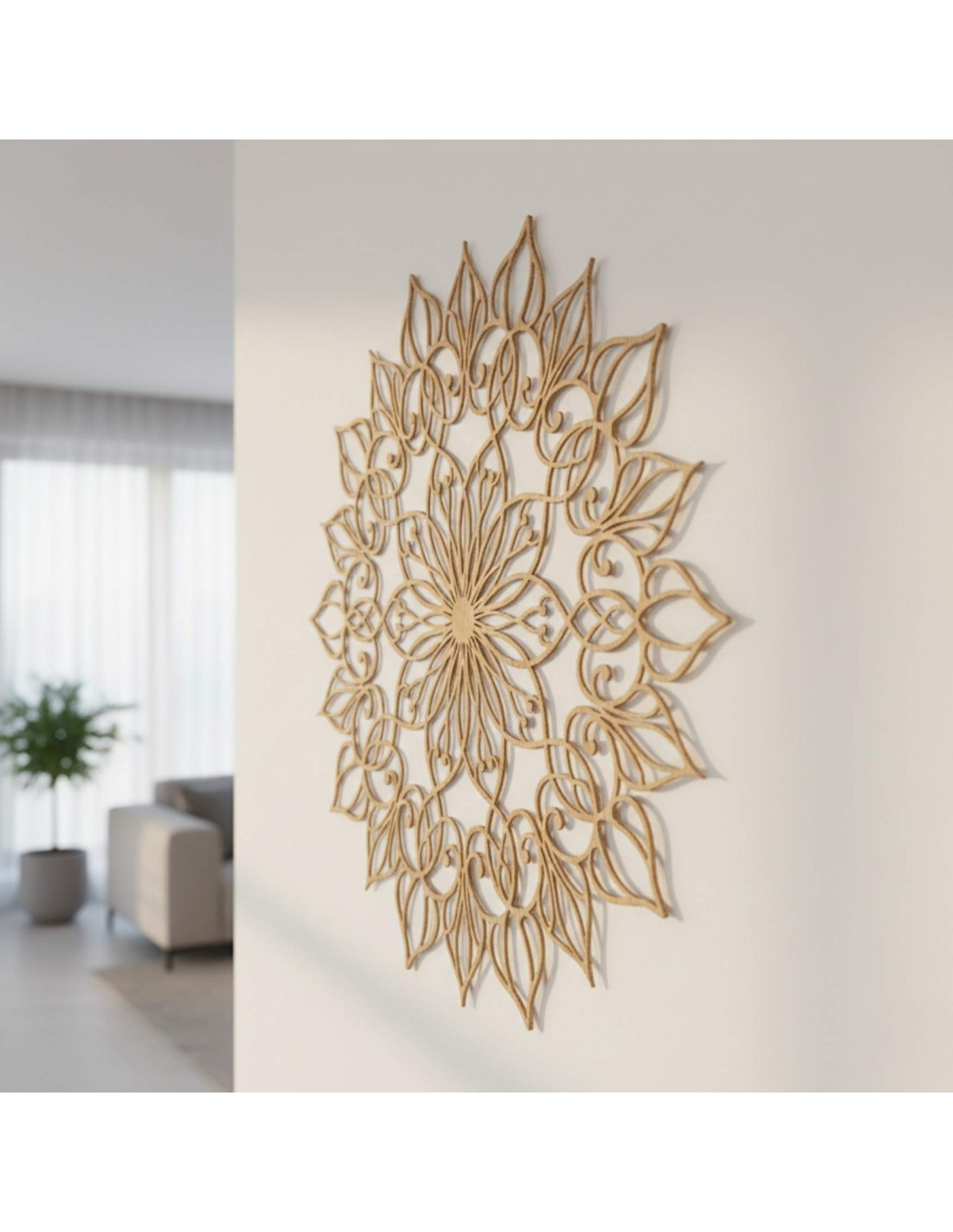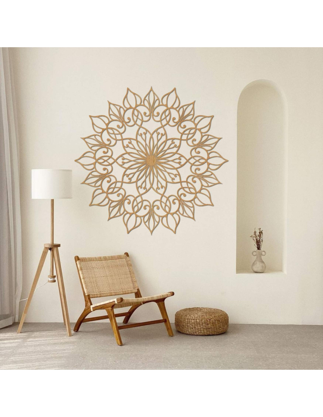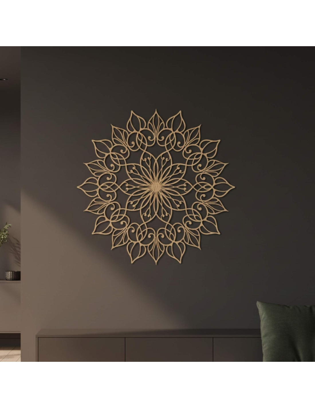A mandala harmonikus hatású, és nyugodt, kiegyensúlyozott hangulatot teremt, ideális mind a modern, mind a minimalista terekbe.