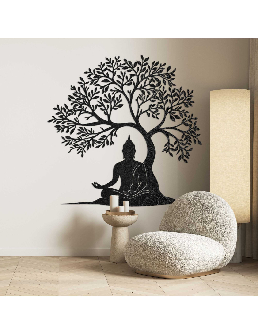 Fából készült életfa, alatta egy meditáló Buddha alakkal