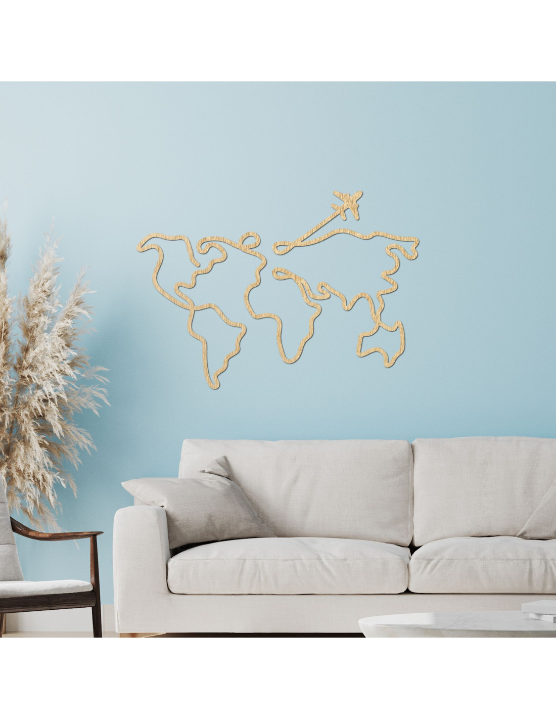 Fából készült világtérkép a falon egy repülőgéppel és összekapcsolt kontinensekkel