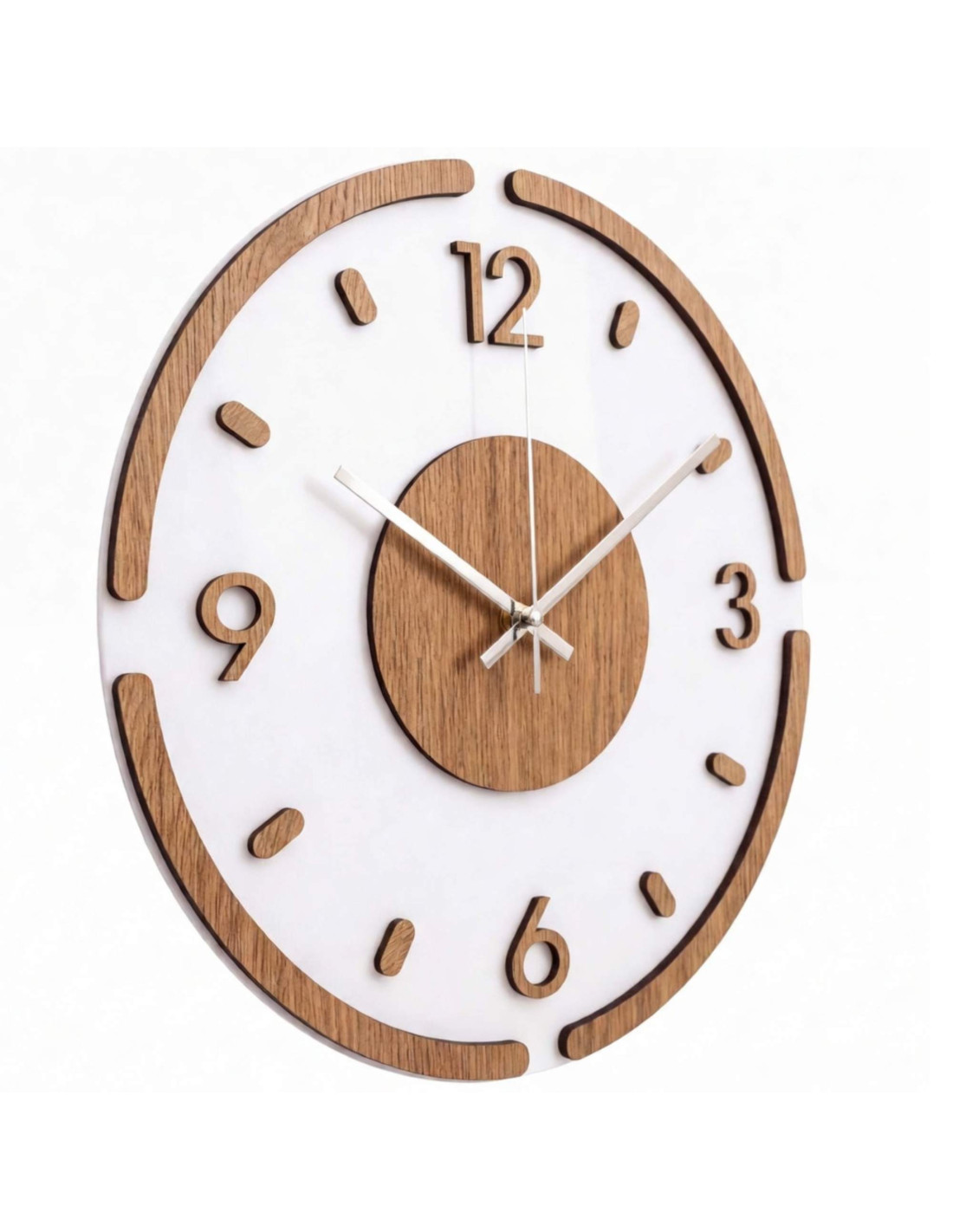 Az óra kiváló minőségű HDF lapból készült, tölgyfa mintával és fényes, elegáns fehér plexiüveggel kombinálva.
