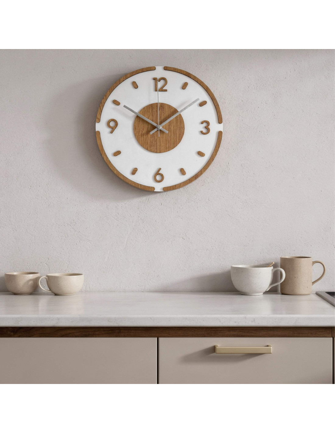 Modern kerek falióra tölgyfa díszítéssel és fehér plexiüveggel .