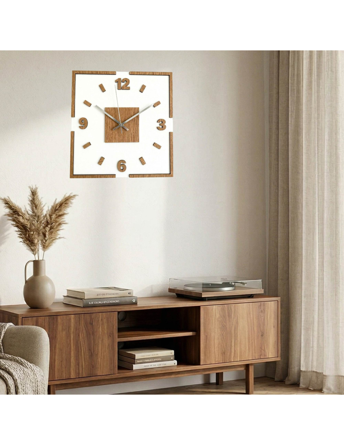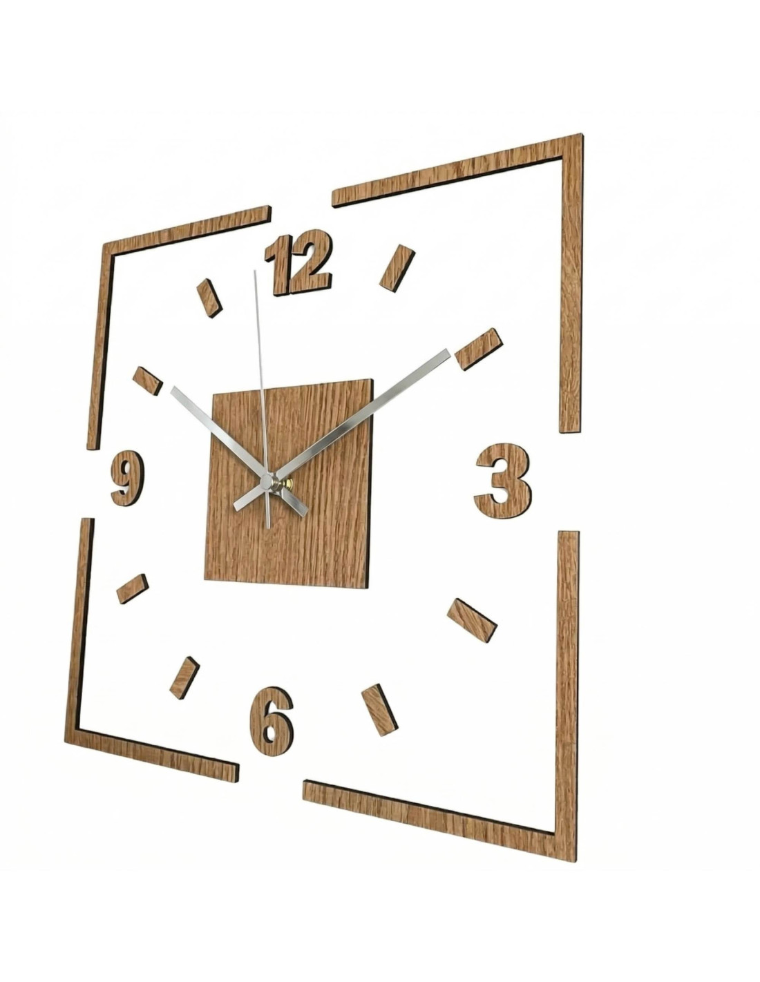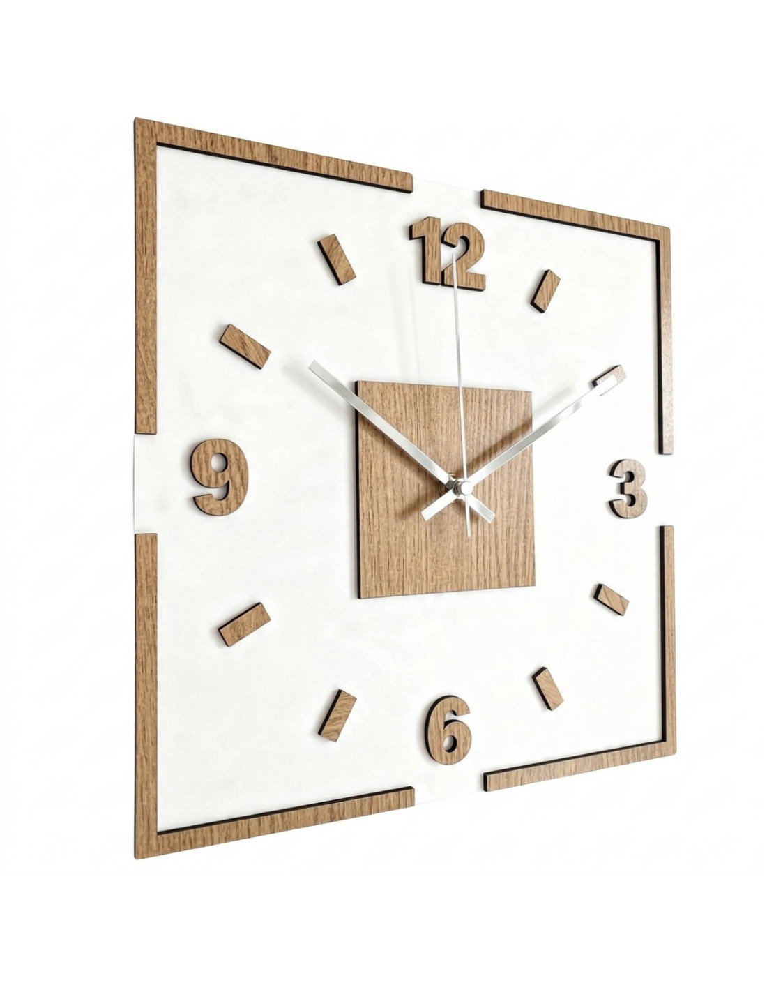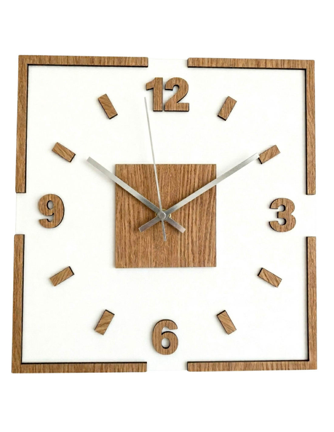 Modern, négyzet alakú falióra tölgyfa díszítéssel és fehér plexiüveggel .