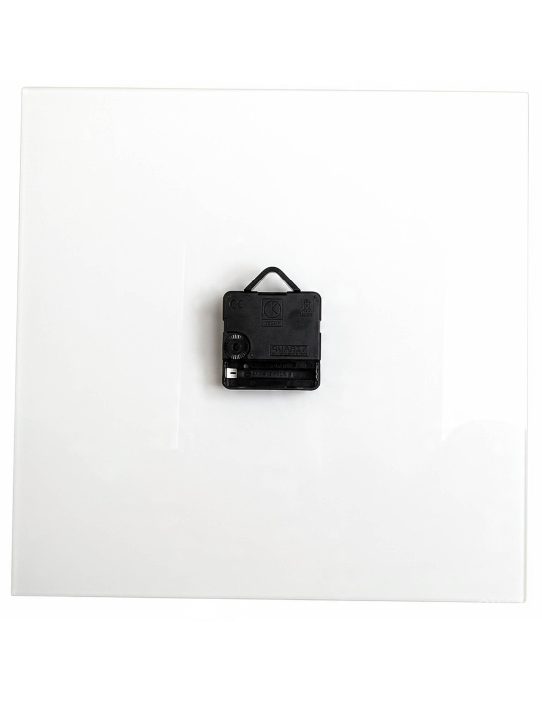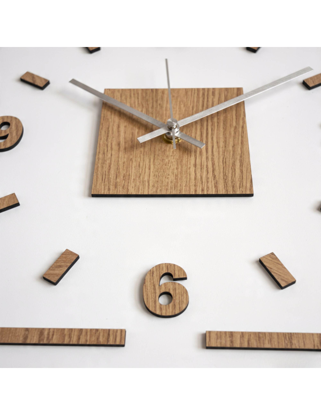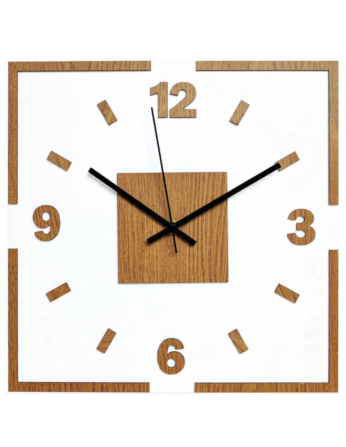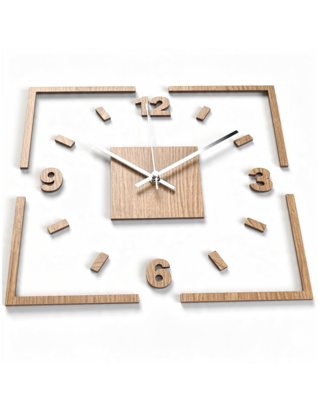 Modern, négyzet alakú falióra tölgyfa díszítéssel és fehér plexiüveggel .